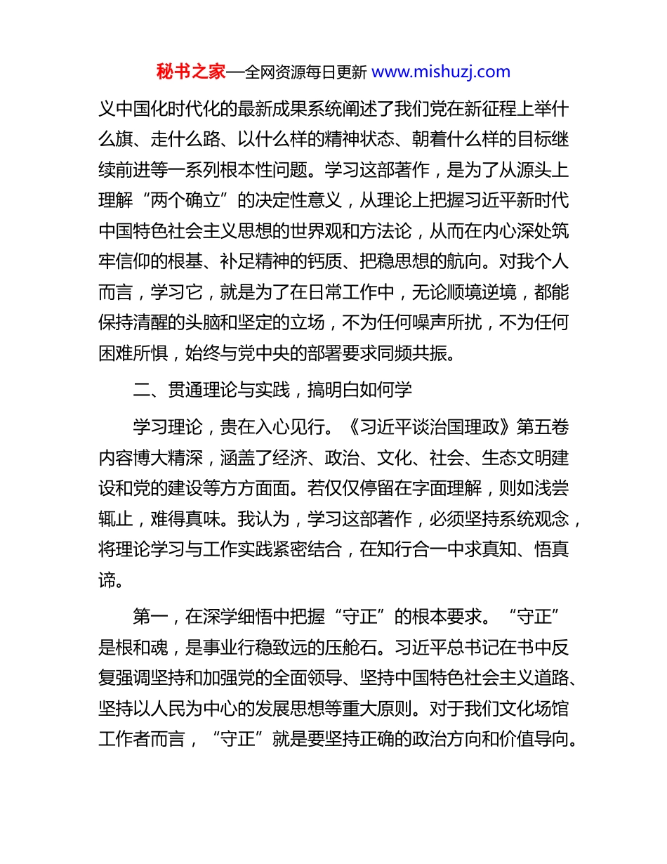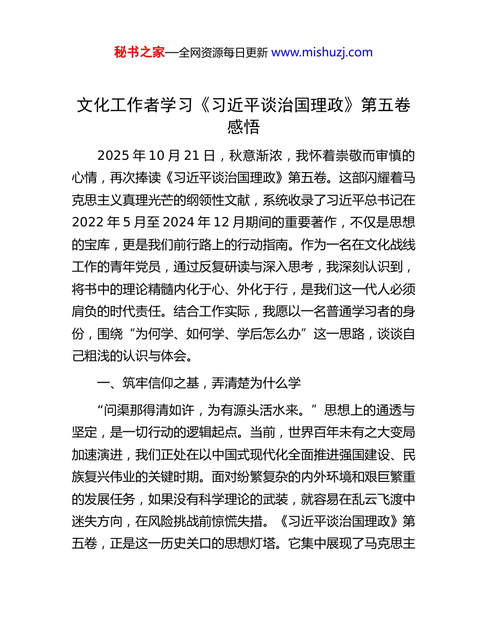 秘书之家—全网资源每日更新 www.mishuzj.com文化工作者学习《习近平谈治国理政》第五卷感悟2025 年 10 月 21 日,秋意渐浓,我怀着崇敬而审慎的心情,再次捧读《习近平谈治国理政》第五卷。这部闪耀着马克思主义真理光芒的纲领性文献,系统收录了习近平总书记在2022 年 5 月至 2024 年 12 月期间的重要著作,不仅是思想的宝库,更是我们前行路上的行动指南。作为一名在文化战线工作的青年党员,通过反复研读与深入思考,我深刻认识到,将书中的理论精髓内化于心、外化于行,是我们这一代人必须肩负的时代责任。结合工作实际,我愿以一名普通学习者的身份,围绕“为何学、如何学、学后怎么办”这一思路,谈谈自己粗浅的认识与体会。一、筑牢信仰之基,弄清楚为什么学“问渠那得清如许,为有源头活水来。”思想上的通透与坚定,是一切行动的逻辑起点。当前,世界百年未有之大变局加速演进,我们正处在以中国式现代化全面推进强国建设、民族复兴伟业的关键时期。面对纷繁复杂的内外环境和艰巨繁重的发展任务,如果没有科学理论的武装,就容易在乱云飞渡中迷失方向,在风险挑战前惊慌失措。《习近平谈治国理政》第五卷,正是这一历史关口的思想灯塔。它集中展现了马克思主秘书之家—全网资源每日更新 www.mishuzj.com义中国化时代化的最新成果系统阐述了我们党在新征程上举什么旗、走什么路、以什么样的精神状态、朝着什么样的目标继续前进等一系列根本性问题。学习这部著作,是为了从源头上理解“两个确立”的决定性意义,从理论上把握习近平新时代中国特色社会主义思想的世界观和方法论,从而在内心深处筑牢信仰的根基、补足精神的钙质、把稳思想的航向。对我个人而言,学习它,就是为了在日常工作中,无论顺境逆境,都能保持清醒的头脑和坚定的立场,不为任何噪声所扰,不为任何困难所惧,始终与党中央的部署要求同频共振。二、贯通理论与实践,搞明白如何学学习理论,贵在入心见行。《习近平谈治国理政》第五卷内容博大精深,涵盖了经济、政治、文化、社会、生态文明建设和党的建设等方方面面。若仅仅停留在字面理解,则如浅尝辄止,难得真味。我认为,学习这部著作,必须坚持系统观念,将理论学习与工作实践紧密结合,在知行合一中求真知、悟真谛。第一,在深学细悟中把握“守正”的根本要求。“守正”是根和魂,是事业行稳致远的压舱石。习近平总书记在书中反复强调坚持和加强党的全面领导、坚持中国特色社会主义道路、坚持以人民为中心的发展思想等重大原则。对于我们文化场馆工作者而言,“守正”就是要坚持正确的政治方向和价值导向。秘书之家—全网资源每日更新 www.mishuzj.com我们的场馆是传承红色基因、弘扬主流价值的重要阵地,一言一行、一展一陈都关乎人心向背和文化安全。因此,在策划展览时,我们必须以严谨求实的态度对待历史,确保史实准确、观点正确,让每一件文物、每一张图片都成为讲述正确党史、国史的生动教材。在开展社会教育活动时,必须旗帜鲜明地弘扬社会主义核心价值观引导广大青少年“扣好人生第一粒扣子”。这种“守正”,不是僵化保守,而是在纷繁复杂的思潮中保持定力,确保我们的文化事业始终沿着正确的航道破浪前行。第二,在融会贯通中激发“创新”的澎湃动能。习近平总书记深刻指出,要正确处理“守正与创新”的重大关系。如果说“守正”是“固本”,那么“创新”就是“培元”。在坚守正确方向的前提下,唯有与时俱进、大胆创新,才能让传统文化和红色文化在新时代焕发出勃勃生机。一方面,是内容与形式的创新。我们不能满足于“仓库式”的文物陈列,而是要思考如何让文物“活”起来。例如,可以借鉴一些先进场馆的经验,利用数字技术打造沉浸式体验,让观众“穿越”历史时空,与历史人物“对话”,从而在互动中深化理解、引发共鸣。可以打破思维定式,开发更具吸引力的研学课程和文创产品,让厚重的历史文化以更轻盈、更时尚的方式走进大众生活。另一方面,是视野与格局的创新。书中提到的“144 小时过境免签”政策,为我们打开了一扇面向世界的窗口。最新的数据显秘书之家—全网资源每日更新 www.mishuzj.com示,得益于免签...