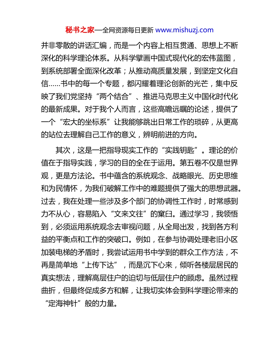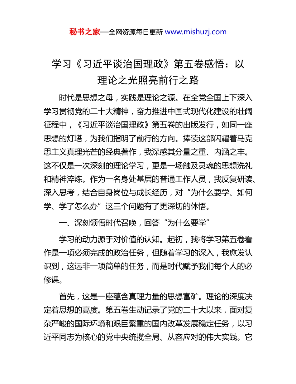 秘书之家—全网资源每日更新 www.mishuzj.com学习《习近平谈治国理政》第五卷感悟:以理论之光照亮前行之路时代是思想之母,实践是理论之源。在全党全国上下深入学习贯彻党的二十大精神,奋力推进中国式现代化建设的壮阔征程中,《习近平谈治国理政》第五卷的出版发行,如同一座思想的灯塔,为我们指明了前行的方向。捧读这部闪耀着马克思主义真理光芒的经典著作,我深感其分量之重、内涵之丰。这不仅是一次深刻的理论学习,更是一场触及灵魂的思想洗礼和精神淬炼。作为一名身处基层的普通工作人员,我反复研读、深入思考,结合自身岗位与成长经历,对“为什么要学、如何学、学了怎么办”这三个问题有了更深切的体悟。一、深刻领悟时代召唤,回答“为什么要学”学习的动力源于对价值的认知。起初,我将学习第五卷看作是一项必须完成的政治任务,但随着学习的深入,我愈发认识到,这远非一项简单的任务,而是时代赋予我们每个人的必修课。首先,这是一座蕴含真理力量的思想富矿。理论的深度决定着思想的高度。第五卷生动记录了党的二十大以来,面对复杂严峻的国际环境和艰巨繁重的国内改革发展稳定任务,以习近平同志为核心的党中央统揽全局、从容应对的伟大实践。它秘书之家—全网资源每日更新 www.mishuzj.com并非零散的讲话汇编,而是一个内容上相互贯通、思想上不断深化的科学理论体系。从科学擘画中国式现代化的宏伟蓝图,到系统部署全面深化改革;从推动高质量发展,到坚定文化自信……书中的每一个专题,都闪耀着理论创新的光芒,集中反映了我们党坚持“两个结合”、推进马克思主义中国化时代化的最新成果。对于我个人而言,这些高瞻远瞩的论述,提供了一个“宏大的坐标系”让我能够跳出日常工作的琐碎,从更高的站位去理解自己工作的意义,辨明前进的方向。其次,这是一把指导现实工作的“实践钥匙”。理论的价值在于指导实践,学习的目的全在于运用。第五卷不仅是世界观,更是方法论。书中蕴含的系统观念、战略眼光、历史思维和为民情怀,为我们破解工作中的难题提供了强大的思想武器。过去,我在处理一些涉及多个部门的协调性工作时,时常感到力不从心,容易陷入“文来文往”的窠臼。通过学习,我领悟到,必须运用系统观念去审视问题,从全局出发,找到各方利益的平衡点和工作的突破口。例如,在参与协调处理老旧小区加装电梯的矛盾时,我尝试运用书中学到的群众工作方法,不再是简单地“上传下达”,而是沉下心来,倾听各楼层居民的真实想法,理解高层住户的迫切与低层住户的顾虑。虽然过程曲折,但最终促成多方和解,让我切实体会到科学理论带来的“定海神针”般的力量。秘书之家—全网资源每日更新 www.mishuzj.com最后,这是一座淬炼党性修养的精神熔炉。“欲知大道,必先为史。”第五卷开篇即论“把中国文明历史研究引向深入”,结尾展望强国建设的壮美画卷,全书贯通着历史、现实与未来。这种深邃的历史感和强烈的使命感,深深地感染了我。书中处处洋溢的“江山就是人民,人民就是江山”的赤子情怀时刻提醒着我工作的出发点和落脚点。它像一面镜子,让我时常审视自己的思想和行为,看是否站稳了人民立场,是否保持了谦虚谨慎、不骄不躁的作风。这种学习过程,本身就是一次深刻的党性教育和自我革命,让我的理想信念更加坚定,责任感和使命感也油然而生。二、掌握科学思想方法,探索“如何学”好的内容需要好的方法才能真正吸收。学习第五卷不能浅尝辄止、浮于表面,必须下一番“真”功夫、“实”功夫和“深”功夫,做到学思用贯通、知信行统一。一是在深读细悟中“知其然,更知其所以然”。我坚持把“读原著、学原文、悟原理”作为学习的基点。我为自己制定了学习计划,每天利用固定时间静心研读,对重点篇目反复揣摩,努力弄清其中的核心要义和精神实质。我准备了一个学习笔记,将触动自己的“金句”、重要的论断以及自己的思考感悟记录下来。例如,在学习关于“高质量发展”的论述时,我不仅学习其定义和要求,更深入思考其背后的新发展理念,以秘书之家—全网资源每日更新 www.mishuzj.com及为何在当前阶段必须把高质量发展作为首要任务。这种“沉浸式”的学...