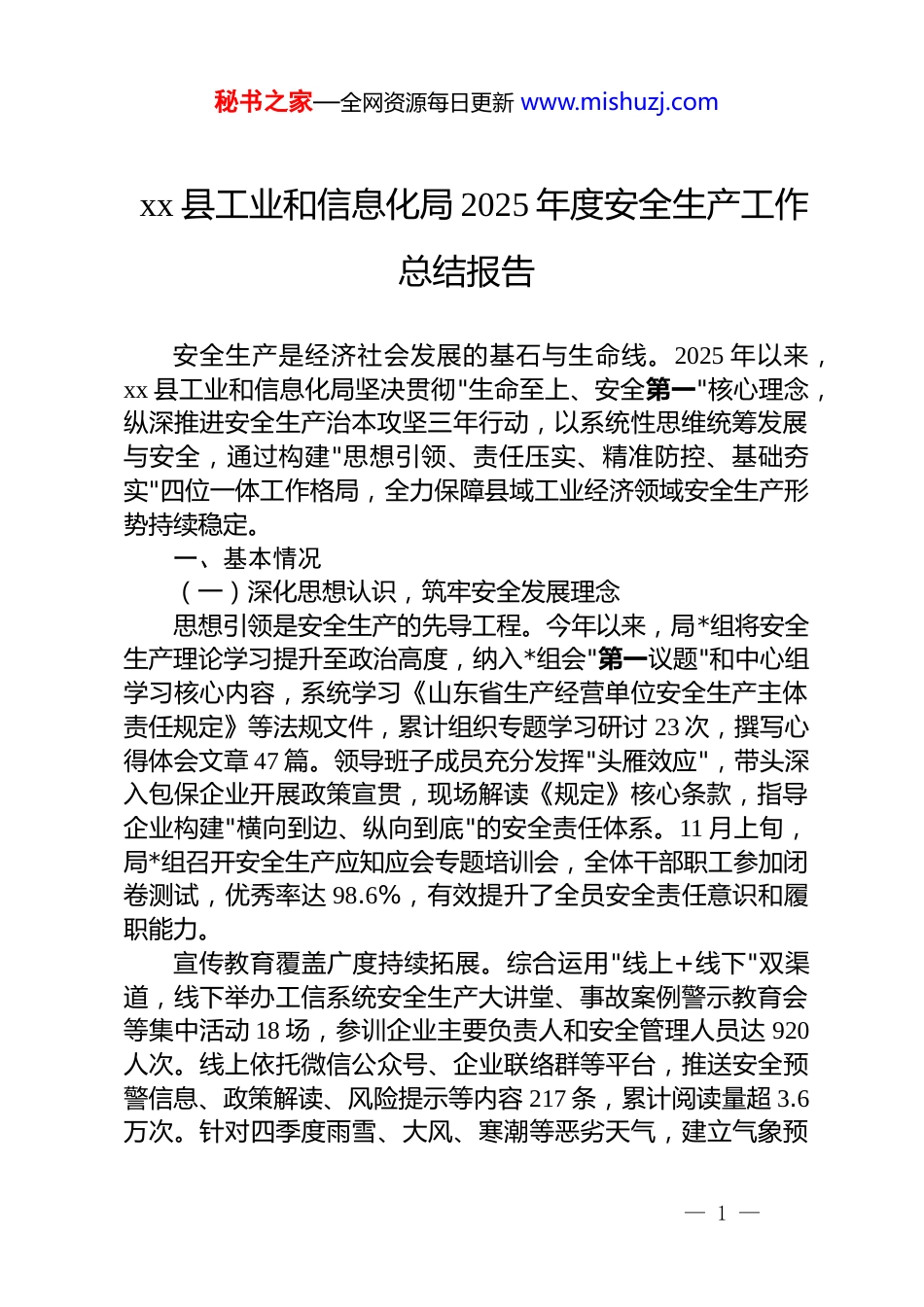 秘书之家—全网资源每日更新 www.mishuzj.comxx 县工业和信息化局 2025 年度安全生产工作总结报告安全生产是经济社会发展的基石与生命线。2025 年以来,xx 县工业和信息化局坚决贯彻"生命至上、安全第一"核心理念,纵深推进安全生产治本攻坚三年行动,以系统性思维统筹发展与安全,通过构建"思想引领、责任压实、精准防控、基础夯实"四位一体工作格局,全力保障县域工业经济领域安全生产形势持续稳定。一、基本情况(一)深化思想认识,筑牢安全发展理念思想引领是安全生产的先导工程。今年以来,局*组将安全生产理论学习提升至政治高度,纳入*组会"第一议题"和中心组学习核心内容,系统学习《山东省生产经营单位安全生产主体责任规定》等法规文件,累计组织专题学习研讨 23 次,撰写心得体会文章 47 篇。领导班子成员充分发挥"头雁效应",带头深入包保企业开展政策宣贯,现场解读《规定》核心条款,指导企业构建"横向到边、纵向到底"的安全责任体系。11 月上旬,局*组召开安全生产应知应会专题培训会,全体干部职工参加闭卷测试,优秀率达 98.6%,有效提升了全员安全责任意识和履职能力。宣传教育覆盖广度持续拓展。综合运用"线上+线下"双渠道,线下举办工信系统安全生产大讲堂、事故案例警示教育会等集中活动 18 场,参训企业主要负责人和安全管理人员达 920人次。线上依托微信公众号、企业联络群等平台,推送安全预警信息、政策解读、风险提示等内容 217 条,累计阅读量超 3.6万次。针对四季度雨雪、大风、寒潮等恶劣天气,建立气象预— 1 —秘书之家—全网资源每日更新 www.mishuzj.com警快速响应机制,提前 72 小时向企业发布预警信息和安全提示,累计发送短信提醒 4500 余条,覆盖所有规上工业企业。通过高频次、多渠道宣传,企业安全发展理念显著增强,形成了"人人重视安全、人人参与安全"的浓厚氛围。(二)强化责任落实,构建协同监管格局责任体系是安全生产的根本保障。年初制定《2025 年度工业和信息化领域安全生产监管责任清单》,明确局领导班子、8个业务科室、32 名监管人员的具体职责,形成"一级抓一级、层层抓落实"的责任链条。创新实施"局领导包片、科室包保、专家指导"三级联动机制,成立 8 个由分管领导任组长的常态化帮扶小组,配备注册安全工程师、爆破专家等专业人员 15 名,对民爆行业实行驻点监督,对规上工业企业实施分级分类监管。帮扶小组每月至少开展 1 次现场督导,每季度召开 1 次风险研判会,确保问题早发现、早处置。企业主体责任压实机制不断完善。督促指导企业严格落实全员安全生产责任制,将责任清单细化到车间、班组、岗位。推行"一企一档"隐患清单式管理,要求企业建立"风险辨识、隐患排查、整改销号"闭环台账。截至 10 月底,全县民爆企业和规上工业企业共建立责任清单 185 份,完善隐患排查治理制度92 项。严格执行"五个必查"原则,即必查责任落实、必查制度执行、必查现场管理、必查教育培训、必查应急准备。通过"四不两直"方式开展突击检查,对主体责任落实不到位的企业进行约谈警示,累计约谈企业 12 家,行政处罚 3 家,罚款金额达 47万元,形成强大震慑效应。(三)聚焦精准治理,提升风险防控能力专项整治是消除隐患的关键抓手。全年统筹开展"十大行动""五项整治"系列专项行动,涵盖民爆物品、燃气使用、粉尘涉爆、有限空间等重点领域。民爆行业实施"一月一主题"集中整治,1 至 10 月累计检查民爆企业 36 家次,发现隐患 127 条,— 2 —秘书之家—全网资源每日更新 www.mishuzj.com整改率 100%,立案查处违规储存案件 2 起。针对规模以上工业企业,开展起底式安全生产大排查,共排查企业 318 家,发现一般隐患 587 项、重大事故隐患 11 项,重大隐患均建立"一患一档",实行挂牌督办,目前已整改完成 9 项,剩余 2 项正按整改方案推进。开展起重机械专项整治,检查设备 462 台套,发现并整改安全隐患 83 处,有效防范机械伤害事故。风险分级管控机制科学运行。建立企业安全风险"红橙黄蓝"四色分布图,对高风险企业实施"一企一策"精准监管。全县划定红色风...