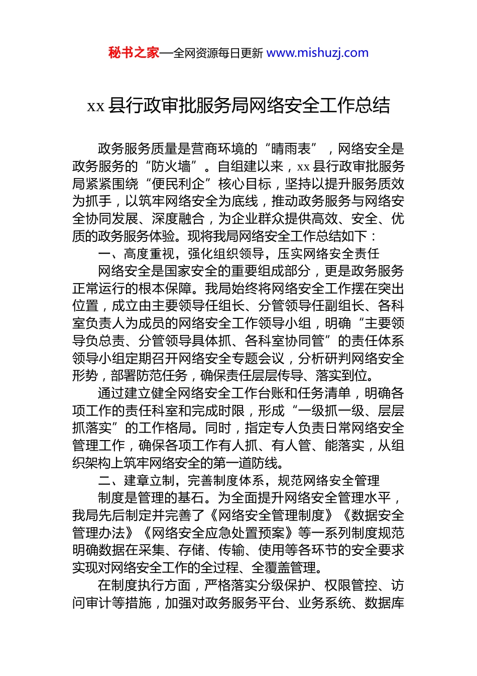秘书之家—全网资源每日更新 www.mishuzj.comxx 县行政审批服务局网络安全工作总结政务服务质量是营商环境的“晴雨表”,网络安全是政务服务的“防火墙”。自组建以来,xx 县行政审批服务局紧紧围绕“便民利企”核心目标,坚持以提升服务质效为抓手,以筑牢网络安全为底线,推动政务服务与网络安全协同发展、深度融合,为企业群众提供高效、安全、优质的政务服务体验。现将我局网络安全工作总结如下:一、高度重视,强化组织领导,压实网络安全责任网络安全是国家安全的重要组成部分,更是政务服务正常运行的根本保障。我局始终将网络安全工作摆在突出位置,成立由主要领导任组长、分管领导任副组长、各科室负责人为成员的网络安全工作领导小组,明确“主要领导负总责、分管领导具体抓、各科室协同管”的责任体系领导小组定期召开网络安全专题会议,分析研判网络安全形势,部署防范任务,确保责任层层传导、落实到位。通过建立健全网络安全工作台账和任务清单,明确各项工作的责任科室和完成时限,形成“一级抓一级、层层抓落实”的工作格局。同时,指定专人负责日常网络安全管理工作,确保各项工作有人抓、有人管、能落实,从组织架构上筑牢网络安全的第一道防线。二、建章立制,完善制度体系,规范网络安全管理制度是管理的基石。为全面提升网络安全管理水平,我局先后制定并完善了《网络安全管理制度》《数据安全管理办法》《网络安全应急处置预案》等一系列制度规范明确数据在采集、存储、传输、使用等各环节的安全要求实现对网络安全工作的全过程、全覆盖管理。在制度执行方面,严格落实分级保护、权限管控、访问审计等措施,加强对政务服务平台、业务系统、数据库秘书之家—全网资源每日更新 www.mishuzj.com的安全管理,严防数据泄露、丢失、篡改等风险。同时,建立健全网络安全考核机制,将网络安全工作纳入科室年度绩效考核范围,增强全员网络安全意识和责任意识。三、技术赋能,筑牢防护体系,提升安全防御能力面对日益严峻的网络安全形势,我局坚持“技防与人防相结合、预防与处置并重”的原则,持续加大网络安全投入,不断提升技术防护能力。一是加强基础设施防护。升级网络安全防护设备,部署下一代防火墙、入侵检测与防御系统、web 应用防火墙等,构建多层次、立体化的技术防护体系。对重要系统和数据实施加密传输与存储,确保数据在流转过程中的安全性。二是开展常态化安全检测。定期组织网络安全隐患排查和漏洞扫描,针对发现的安全隐患建立整改台账,明确责任人和整改时限,确保问题闭环管理。近年来,累计发现并修复中高危漏洞 xx 个,有效堵住安全漏洞。三是推进安全监测预警。建立网络安全监测预警机制,利用安全运营中心(soc)等平台实时监控网络运行状态,及时发现并处置异常流量、恶意攻击等安全事件,做到早发现、早预警、早处置。四、加强培训,提升安全意识,筑牢“人防”屏障网络安全归根到底是人的安全。我局高度重视干部职工网络安全意识和技能的提升,通过多种形式开展网络安全教育培训,营造“网络安全、人人有责”的浓厚氛围。一是组织专题培训。每年定期举办网络安全知识讲座和技能培训,邀请网络安全专家授课,内容涵盖网络安全法律法规、常见攻击手段防范、数据安全保护、应急处置流程等,提升干部职工的防范意识和实操能力。二是开展实战演练。结合工作实际,定期组织网络安全应急演练,模拟黑客攻击、数据泄露、系统瘫痪等场景检验应急预案的可行性和人员的应急处置能力,提升整体协同作战水平。秘书之家—全网资源每日更新 www.mishuzj.com三是普及宣传引导。利用政务大厅电子屏、宣传栏、微信公众号等载体,广泛宣传网络安全知识,发布防范钓鱼邮件、电信诈骗等提示,提高全体工作人员和办事群众的网络安全防范意识。五、优化服务,融合安全理念,推动安全与服务协同发展我局坚持“服务为民、安全为基”的理念,将网络安全融入政务服务全过程,实现安全与服务的深度融合、协同发展。一是优化线上服务流程。依托陕西省一体化政务服务平台,推动更多事项实现“全程网办、掌上可办”,在提升便利度的同时,通过强化身份认证、数据加...