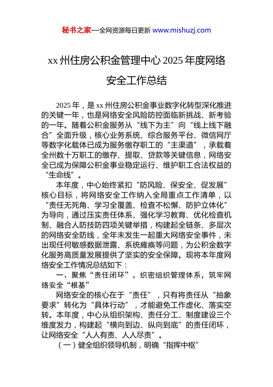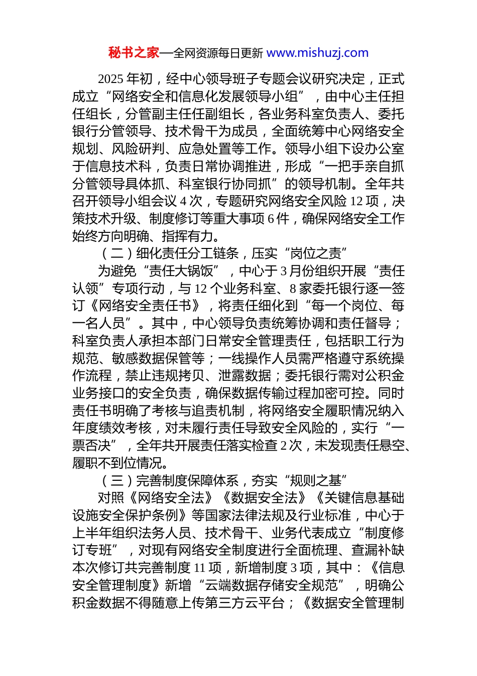 秘书之家—全网资源每日更新 www.mishuzj.comxx 州住房公积金管理中心 2025 年度网络安全工作总结2025 年,是 xx 州住房公积金事业数字化转型深化推进的关键一年,也是网络安全风险防控面临新挑战、新考验的一年。随着公积金服务从“线下为主”向“线上线下融合”全面升级,核心业务系统、综合服务平台、微信网厅等数字化载体已成为服务缴存职工的“主渠道”,承载着全州数十万职工的缴存、提取、贷款等关键信息,网络安全已成为保障公积金事业稳定运行、维护职工合法权益的“生命线”。本年度,中心始终紧扣“防风险、保安全、促发展”核心目标,将网络安全工作纳入全局重点工作清单,以“责任无死角、学习全覆盖、检查不松懈、防护立体化”为导向,通过压实责任体系、强化学习教育、优化检查机制、融合人防技防四项关键举措,构建起全链条、多层次的网络安全防线,全年未发生一起重大网络安全事件,未出现任何敏感数据泄露、系统瘫痪等问题,为公积金数字化服务高质量发展提供了坚实的安全保障。现将本年度网络安全工作情况总结如下:一、聚焦“责任闭环”,织密组织管理体系,筑牢网络安全“根基”网络安全的核心在于“责任”,只有将责任从“抽象要求”转化为“具体行动”,才能避免工作虚化、落实空转。本年度,中心从组织架构、责任分工、制度建设三个维度发力,构建起“横向到边、纵向到底”的责任闭环,让网络安全“人人有责、人人尽责”。(一)健全组织领导机制,明确“指挥中枢”秘书之家—全网资源每日更新 www.mishuzj.com2025 年初,经中心领导班子专题会议研究决定,正式成立“网络安全和信息化发展领导小组”,由中心主任担任组长,分管副主任任副组长,各业务科室负责人、委托银行分管领导、技术骨干为成员,全面统筹中心网络安全规划、风险研判、应急处置等工作。领导小组下设办公室于信息技术科,负责日常协调推进,形成“一把手亲自抓分管领导具体抓、科室银行协同抓”的领导机制。全年共召开领导小组会议 4 次,专题研究网络安全风险 12 项,决策技术升级、制度修订等重大事项 6 件,确保网络安全工作始终方向明确、指挥有力。(二)细化责任分工链条,压实“岗位之责”为避免“责任大锅饭”,中心于 3 月份组织开展“责任认领”专项行动,与 12 个业务科室、8 家委托银行逐一签订《网络安全责任书》,将责任细化到“每一个岗位、每一名人员”。其中,中心领导负责统筹协调和责任督导;科室负责人承担本部门日常安全管理责任,包括职工行为规范、敏感数据保管等;一线操作人员需严格遵守系统操作流程,禁止违规拷贝、泄露数据;委托银行需对公积金业务接口的安全负责,确保数据传输过程加密可控。同时责任书明确了考核与追责机制,将网络安全履职情况纳入年度绩效考核,对未履行责任导致安全风险的,实行“一票否决”,全年共开展责任落实检查 2 次,未发现责任悬空、履职不到位情况。(三)完善制度保障体系,夯实“规则之基”对照《网络安全法》《数据安全法》《关键信息基础设施安全保护条例》等国家法律法规及行业标准,中心于上半年组织法务人员、技术骨干、业务代表成立“制度修订专班”,对现有网络安全制度进行全面梳理、查漏补缺本次修订共完善制度 11 项,新增制度 3 项,其中:《信息安全管理制度》新增“云端数据存储安全规范”,明确公积金数据不得随意上传第三方云平台;《数据安全管理制秘书之家—全网资源每日更新 www.mishuzj.com度》细化数据分级标准,将职工身份证号、银行卡号等定为“核心数据”,实行“双人保管、全程留痕”;《外部人员安全管理规定》补充“外部运维人员操作日志留存”要求,确保外部人员操作可追溯。此外,中心还设立系统管理员、安全管理员、审计管理员、网络管理员 4 个专职安全岗位,明确各岗位职责边界,实现“分工协作、相互监督”,推动网络安全管理从“粗放化”向“精细化”转变。二、聚焦“意识提升”,深化政策学习教育,锻造网络安全“队伍”网络安全的第一道防线是“人”,只有让全体干部职工真正“懂安全、重安全、保安全”,才能从源头上防范风险。本年度,中心围绕“领导...