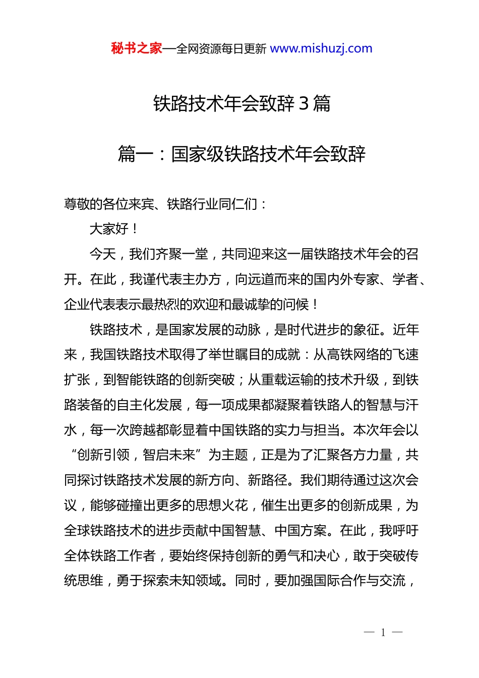 秘书之家—全网资源每日更新 www.mishuzj.com铁路技术年会致辞 3 篇篇一:国家级铁路技术年会致辞尊敬的各位来宾、铁路行业同仁们:大家好!今天,我们齐聚一堂,共同迎来这一届铁路技术年会的召开。在此,我谨代表主办方,向远道而来的国内外专家、学者、企业代表表示最热烈的欢迎和最诚挚的问候!铁路技术,是国家发展的动脉,是时代进步的象征。近年来,我国铁路技术取得了举世瞩目的成就:从高铁网络的飞速扩张,到智能铁路的创新突破;从重载运输的技术升级,到铁路装备的自主化发展,每一项成果都凝聚着铁路人的智慧与汗水,每一次跨越都彰显着中国铁路的实力与担当。本次年会以“创新引领,智启未来”为主题,正是为了汇聚各方力量,共同探讨铁路技术发展的新方向、新路径。我们期待通过这次会议,能够碰撞出更多的思想火花,催生出更多的创新成果,为全球铁路技术的进步贡献中国智慧、中国方案。在此,我呼吁全体铁路工作者,要始终保持创新的勇气和决心,敢于突破传统思维,勇于探索未知领域。同时,要加强国际合作与交流,— 1 —秘书之家—全网资源每日更新 www.mishuzj.com共享技术资源,共促行业发展。让我们携手并肩,共同书写铁路技术发展的新篇章!谢谢大家!篇二:区域性铁路技术年会致辞尊敬的各位领导、各位专家、朋友们:大家上午好!在这金秋送爽的美好时节,我们迎来了[地区名称]铁路技术年会的召开。首先,请允许我代表[主办单位],向莅临本次会议的各位嘉宾表示热烈的欢迎,向长期以来关心支持[地区名称]铁路事业发展的各界朋友表示衷心的感谢![地区名称]作为我国铁路网络的重要组成部分,近年来在铁路技术应用与创新方面取得了显著成效。我们见证了铁路线路的不断优化,运输效率的大幅提升,以及铁路服务品质的持续改善。这些成绩的取得,离不开每一位铁路工作者的辛勤付出,也离不开社会各界的大力支持。本次年会旨在搭建一个交流与合作的平台,聚焦[地区名称]铁路技术发展的热点问题,分享经验、探讨对策。我们希望通过这次会议,能够进一步加强区域内铁路企业的合作,推动铁路技术的本地化应用,为[地区名称]的经济社会发展提供更有力的支撑。最后,预祝本次年— 2 —秘书之家—全网资源每日更新 www.mishuzj.com会圆满成功!祝愿我们的铁路事业蒸蒸日上,再创辉煌!谢谢大家!篇三:专业性铁路技术年会致辞尊敬的各位同行、专家学者:大家好!欢迎各位参加本次铁路[具体技术领域,如“智能调度”“轨道工程”等]技术年会。我是[姓名],很荣幸能在此与大家分享此刻的喜悦与期待。铁路[具体技术领域]是铁路系统的核心环节,直接关系到铁路的安全、效率和质量。近年来,随着科技的飞速发展,[具体技术领域]面临着前所未有的机遇与挑战。从大数据、人工智能到物联网技术的应用,我们看到了无限的可能性;同时,也面临着技术融合、标准统一等诸多难题。本次年会围绕“[具体技术领域]的创新与实践”展开深入研讨,我们邀请了国内外顶尖的专家团队,带来了最新的研究成果和实践经验。希望大家在会议期间,能够充分交流、积极互动,共同探索[具体技术领域]的发展方向,为推动铁路技术的整体进步贡献力量。在此,我也希望大家能够以本次年会为契机,加强合作,形成合力。— 3 —秘书之家—全网资源每日更新 www.mishuzj.com让我们携手共进,用创新的技术、严谨的态度,为铁路事业的发展注入新的活力!谢谢大家!— 4 —