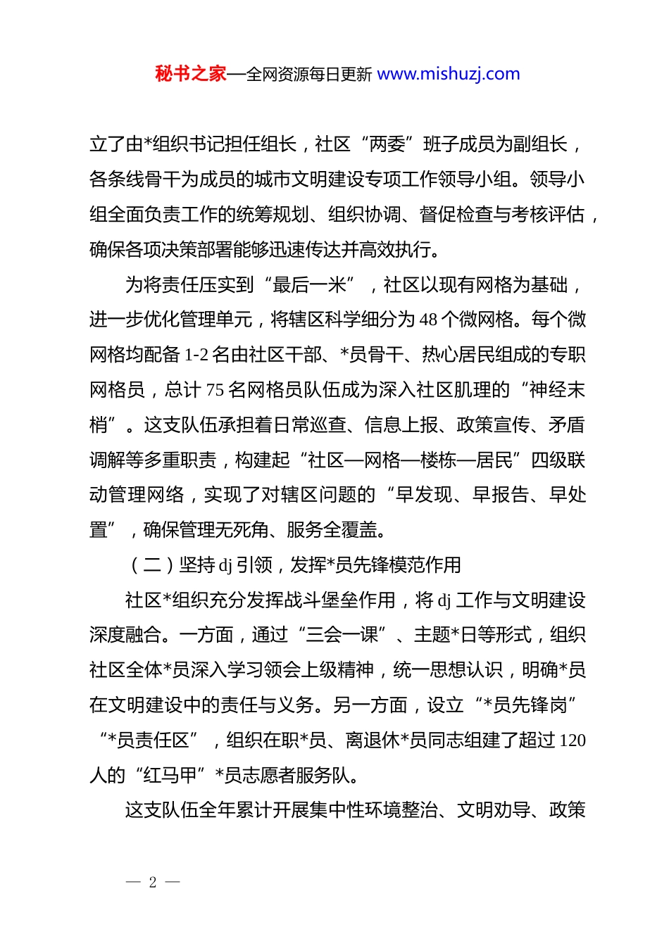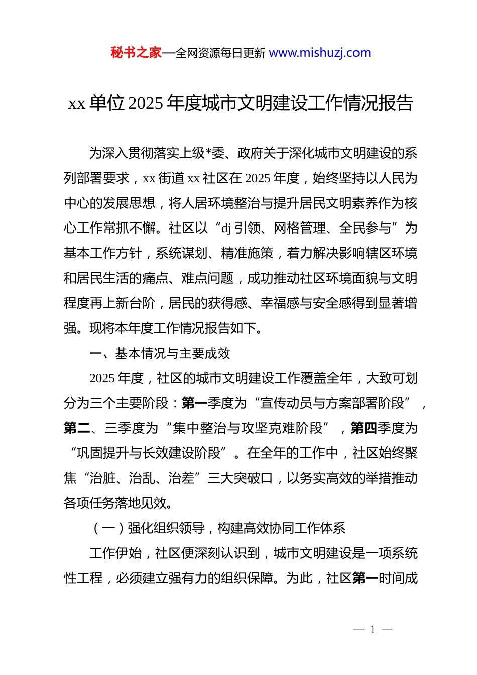 秘书之家—全网资源每日更新 www.mishuzj.comxx 单位 2025 年度城市文明建设工作情况报告为深入贯彻落实上级*委、政府关于深化城市文明建设的系列部署要求,xx 街道 xx 社区在 2025 年度,始终坚持以人民为中心的发展思想,将人居环境整治与提升居民文明素养作为核心工作常抓不懈。社区以“dj 引领、网格管理、全民参与”为基本工作方针,系统谋划、精准施策,着力解决影响辖区环境和居民生活的痛点、难点问题,成功推动社区环境面貌与文明程度再上新台阶,居民的获得感、幸福感与安全感得到显著增强。现将本年度工作情况报告如下。一、基本情况与主要成效2025 年度,社区的城市文明建设工作覆盖全年,大致可划分为三个主要阶段:第一季度为“宣传动员与方案部署阶段”,第二、三季度为“集中整治与攻坚克难阶段”,第四季度为“巩固提升与长效建设阶段”。在全年的工作中,社区始终聚焦“治脏、治乱、治差”三大突破口,以务实高效的举措推动各项任务落地见效。(一)强化组织领导,构建高效协同工作体系工作伊始,社区便深刻认识到,城市文明建设是一项系统性工程,必须建立强有力的组织保障。为此,社区第一时间成— 1 —秘书之家—全网资源每日更新 www.mishuzj.com立了由*组织书记担任组长,社区“两委”班子成员为副组长,各条线骨干为成员的城市文明建设专项工作领导小组。领导小组全面负责工作的统筹规划、组织协调、督促检查与考核评估,确保各项决策部署能够迅速传达并高效执行。为将责任压实到“最后一米”,社区以现有网格为基础,进一步优化管理单元,将辖区科学细分为 48 个微网格。每个微网格均配备 1-2 名由社区干部、*员骨干、热心居民组成的专职网格员,总计 75 名网格员队伍成为深入社区肌理的“神经末梢”。这支队伍承担着日常巡查、信息上报、政策宣传、矛盾调解等多重职责,构建起“社区—网格—楼栋—居民”四级联动管理网络,实现了对辖区问题的“早发现、早报告、早处置”,确保管理无死角、服务全覆盖。(二)坚持 dj 引领,发挥*员先锋模范作用社区*组织充分发挥战斗堡垒作用,将 dj 工作与文明建设深度融合。一方面,通过“三会一课”、主题*日等形式,组织社区全体*员深入学习领会上级精神,统一思想认识,明确*员在文明建设中的责任与义务。另一方面,设立“*员先锋岗”“*员责任区”,组织在职*员、离退休*员同志组建了超过 120人的“红马甲”*员志愿者服务队。这支队伍全年累计开展集中性环境整治、文明劝导、政策— 2 —秘书之家—全网资源每日更新 www.mishuzj.com宣讲等志愿服务活动超过 50 次,累计服务时长近 2000 小时。无论是在清理陈年垃圾的攻坚现场,还是在劝导不文明停车的日常巡查中,*员同志们始终冲锋在前,以实际行动影响和带动周边群众。例如,在针对 xx 小区 10 号楼南侧一处长期困扰居民的杂物堆积点的清理工作中,正是*员志愿者们不畏脏累、带头实干,极大地鼓舞了现场工作人员和围观居民,形成了良好的示范效应。(三)聚焦重点难点,扎实推进人居环境整治环境卫生是城市文明最直观的体现。本年度,社区将“治脏、治乱、治差”作为核心任务,投入专项工作经费约 96 万元发动全员力量,向各类环境顽疾“亮剑”。1.全力攻克卫生死角,实现环境面貌焕然一新。社区组织力量对辖区内的老旧小区、背街小巷、公共绿地等区域进行了地毯式排查,建立问题台账,明确整治时限与责任人。全年累计组织大型集中清理行动 12 次,小型专项整治行动百余次。据不完全统计,全年共清理各类生活垃圾、建筑垃圾、大件废弃物合计超过 2100 吨。一个典型的案例是 xx 小区 10 号楼南侧的杂物堆积点。该处由一位年长居民长期堆放拾荒物品形成,不仅气味难闻,严重影响市容,还存在极大的消防安全隐患,周边居民对此反映— 3 —秘书之家—全网资源每日更新 www.mishuzj.com强烈。社区工作人员与网格员秉持“情理法”相结合的原则,先后十余次登门拜访,从邻里关系、消防安全、公共卫生等多个角度,不厌其烦地与老人沟通交流。最终,通过耐心细致的工作,成功说服老人同意配合清理。在清理当天,社区组...