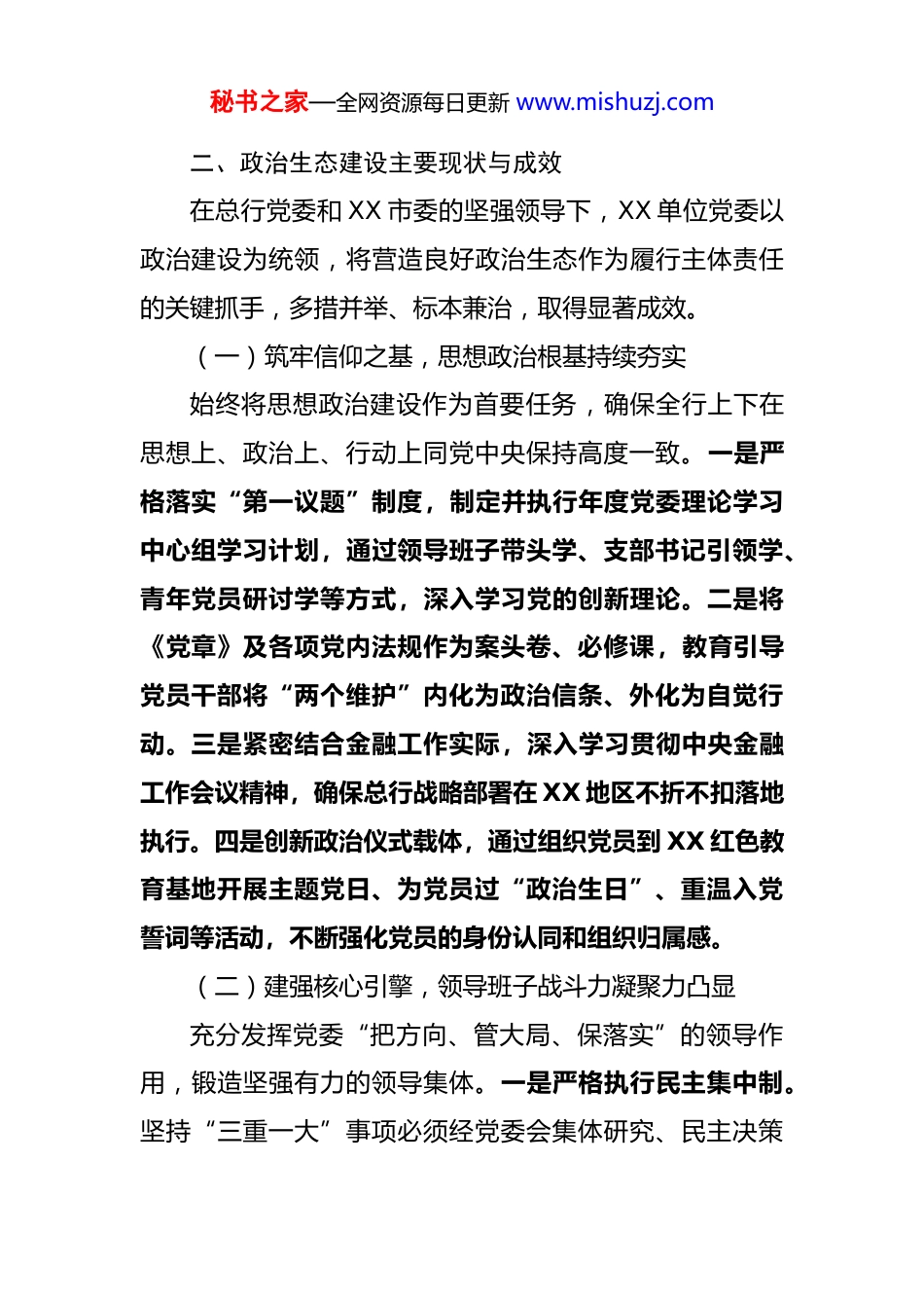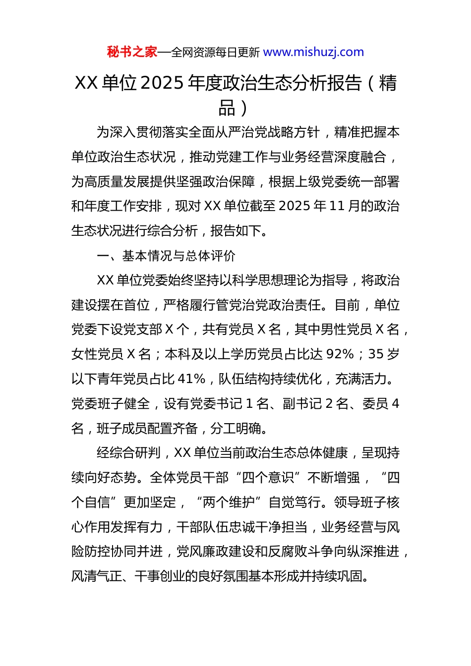 秘书之家—全网资源每日更新 www.mishuzj.comXX 单位 2025 年度政治生态分析报告(精品)为深入贯彻落实全面从严治党战略方针,精准把握本单位政治生态状况,推动党建工作与业务经营深度融合,为高质量发展提供坚强政治保障,根据上级党委统一部署和年度工作安排,现对 XX 单位截至 2025 年 11 月的政治生态状况进行综合分析,报告如下。一、基本情况与总体评价XX 单位党委始终坚持以科学思想理论为指导,将政治建设摆在首位,严格履行管党治党政治责任。目前,单位党委下设党支部 X 个,共有党员 X 名,其中男性党员 X 名,女性党员 X 名;本科及以上学历党员占比达 92%;35 岁以下青年党员占比 41%,队伍结构持续优化,充满活力。党委班子健全,设有党委书记 1 名、副书记 2 名、委员 4名,班子成员配置齐备,分工明确。经综合研判,XX 单位当前政治生态总体健康,呈现持续向好态势。全体党员干部“四个意识”不断增强,“四个自信”更加坚定,“两个维护”自觉笃行。领导班子核心作用发挥有力,干部队伍忠诚干净担当,业务经营与风险防控协同并进,党风廉政建设和反腐败斗争向纵深推进,风清气正、干事创业的良好氛围基本形成并持续巩固。秘书之家—全网资源每日更新 www.mishuzj.com二、政治生态建设主要现状与成效在总行党委和 XX 市委的坚强领导下,XX 单位党委以政治建设为统领,将营造良好政治生态作为履行主体责任的关键抓手,多措并举、标本兼治,取得显著成效。(一)筑牢信仰之基,思想政治根基持续夯实始终将思想政治建设作为首要任务,确保全行上下在思想上、政治上、行动上同党中央保持高度一致。一是严格落实“第一议题”制度,制定并执行年度党委理论学习中心组学习计划,通过领导班子带头学、支部书记引领学、青年党员研讨学等方式,深入学习党的创新理论。二是将《党章》及各项党内法规作为案头卷、必修课,教育引导党员干部将“两个维护”内化为政治信条、外化为自觉行动。三是紧密结合金融工作实际,深入学习贯彻中央金融工作会议精神,确保总行战略部署在 XX 地区不折不扣落地执行。四是创新政治仪式载体,通过组织党员到 XX 红色教育基地开展主题党日、为党员过“政治生日”、重温入党誓词等活动,不断强化党员的身份认同和组织归属感。(二)建强核心引擎,领导班子战斗力凝聚力凸显充分发挥党委“把方向、管大局、保落实”的领导作用,锻造坚强有力的领导集体。一是严格执行民主集中制。坚持“三重一大”事项必须经党委会集体研究、民主决策秘书之家—全网资源每日更新 www.mishuzj.com坚决执行“一把手”末位表态制,杜绝“一言堂”“家长制”现象。涉及干部任免、重大项目投向、大额资金使用等关键事项,均严格按照规定程序进行,决策过程科学、民主、透明。二是维护班子团结统一。班子成员之间分工明确、协作紧密,大事讲原则、小事讲风格,工作上相互补台、思想上经常交流,形成了心往一处想、劲往一处使的良好工作局面。在 2025 年初召开的全行党建与经营工作会议上,党委书记、行长 XX 同志所作的工作报告凝聚了班子共识,为全年工作指明了方向。(三)压实管党责任,全面从严治党向纵深发展坚定不移履行全面从严治党主体责任,层层传导压力,确保责任无缺失、监督无死角。一是构建明晰的责任体系。党委书记认真履行第一责任人职责,对重要工作亲自部署、重大问题亲自过问;班子成员严格落实“一岗双责”,将党建和业务工作同谋划、同部署、同考核。二是强化监督执纪问责。纪委聚焦主责主业,深化运用“四种形态”,对苗头性、倾向性问题早发现、早提醒、早纠正。今年以来,针对日常监督中发现的个别员工服务意识不强、制度执行不到位等问题,已开展提醒谈话 X 人次,给予行政警告处分 X 人,党内警告处分 X 人,展现了纪律的刚性约束力。三是积极配合上级巡视巡察,对反馈问题照单全收、秘书之家—全网资源每日更新 www.mishuzj.com立行立改,确保问题整改见底清零。(四)树立鲜明导向,干部队伍建设充满活力坚持党管干部原则和新时期好干部标准,着力锻造一支政治过硬、作风优良、精通业务的金...