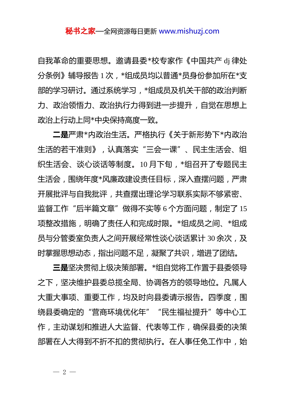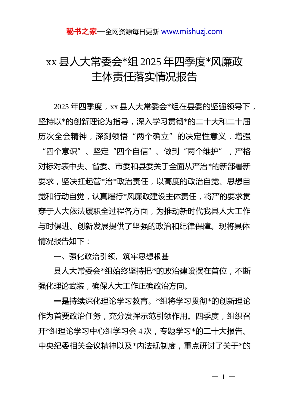 秘书之家—全网资源每日更新 www.mishuzj.comxx 县人大常委会*组 2025 年四季度*风廉政主体责任落实情况报告2025 年四季度,xx 县人大常委会*组在县委的坚强领导下,坚持以*的创新理论为指导,深入学习贯彻*的二十大和二十届历次全会精神,深刻领悟“两个确立”的决定性意义,增强“四个意识”、坚定“四个自信”、做到“两个维护”,严格对标对表中央、省委、市委和县委关于全面从严治*的新部署新要求,坚决扛起管*治*政治责任,以高度的政治自觉、思想自觉和行动自觉,认真履行*风廉政建设主体责任,将严的要求贯穿于人大依法履职全过程各方面,为推动新时代我县人大工作与时俱进、创新发展提供了坚强的政治和纪律保障。现将具体情况报告如下:一、强化政治引领,筑牢思想根基县人大常委会*组始终坚持把*的政治建设摆在首位,不断强化理论武装,确保人大工作正确政治方向。一是持续深化理论学习教育。*组将学习贯彻*的创新理论作为首要政治任务,充分发挥示范引领作用。四季度,组织召开*组理论学习中心组学习会 4 次,专题学习*的二十大报告、中央纪委相关会议精神以及*内法规制度,重点研讨了关于*的— 1 —秘书之家—全网资源每日更新 www.mishuzj.com自我革命的重要思想。邀请县委*校专家作《中国共产 dj 律处分条例》辅导报告 1 次,*组成员均以普通*员身份参加所在*支部的学习研讨。通过系统学习,*组成员及机关干部的政治判断力、政治领悟力、政治执行力得到进一步提升,自觉在思想上政治上行动上同*中央保持高度一致。二是严肃*内政治生活。严格执行《关于新形势下*内政治生活的若干准则》,认真落实“三会一课”、民主生活会、组织生活会、谈心谈话等制度。10 月下旬,*组召开了专题民主生活会,围绕年度*风廉政建设责任目标,深入查摆问题,严肃开展批评与自我批评,共查摆出理论学习联系实际不够紧密、监督工作“后半篇文章”做得不实等 6 个方面问题,制定了 15项整改措施,明确了责任人和完成时限。*组成员之间、*组成员与分管委室负责人之间开展经常性谈心谈话累计 30 余次,及时掌握思想动态,指出问题不足,凝聚了共识,增进了团结。三是坚决贯彻上级决策部署。*组自觉将工作置于县委领导之下,坚决维护县委总揽全局、协调各方的领导地位。凡属人大重大事项、重要工作,均及时向县委请示报告。四季度,围绕县委确定的“营商环境优化年”“民生福祉提升”等中心工作,主动谋划和推进人大监督、代表等工作,确保县委的决策部署在人大得到不折不扣的贯彻执行。在人事任免工作中,始— 2 —秘书之家—全网资源每日更新 www.mishuzj.com终坚持*管干部原则与人大依法任免相统一,严格任免程序,四季度依法任免国家机关工作人员 15 人次,组织宪法宣誓 3 场次,强化了被任命人员的宪法意识、责任意识和廉洁意识。二、压实主体责任,健全制度体系*组牢固树立“抓好*风廉政建设是本职、不抓是失职、抓不好是渎职”的理念,切实将主体责任扛在肩上、抓在手上。一是强化组织领导。*组坚决扛起主体责任,*组书记认真履行第一责任人职责,坚持重要工作亲自部署、重大问题亲自过问、重点环节亲自协调。四季度,*组召开 2 次会议专题研究*风廉政建设工作,分析形势,部署任务,听取了机关*总支关于*风廉政建设情况的汇报。调整充实了以*组书记为组长的*风廉政建设工作领导小组,明确了班子成员的“一岗双责”,形成了*组书记负总责、分管领导分工负责、机关*总支推进落实、各委室负责人“一岗双责”的责任体系。二是健全责任机制。修订完善了《县人大常委会*组及其成员落实*风廉政建设主体责任清单》,进一步细化了*组集体责任、*组书记第一责任人责任和*组成员“一岗双责”的具体内容和工作要求。健全责任压力传导机制,*组书记与*组成员、*组成员与分管委室负责人层层签订了《2025 年度*风廉政建设责任书》,将责任压实到岗、传导到人。将*风廉政建设纳入机— 3 —秘书之家—全网资源每日更新 www.mishuzj.com关年度考核重要内容,考核结果与评先评优、干部使用挂钩,确保了责任落实不留死角。三是加强风险防控。针对人大工作特点,特别是...