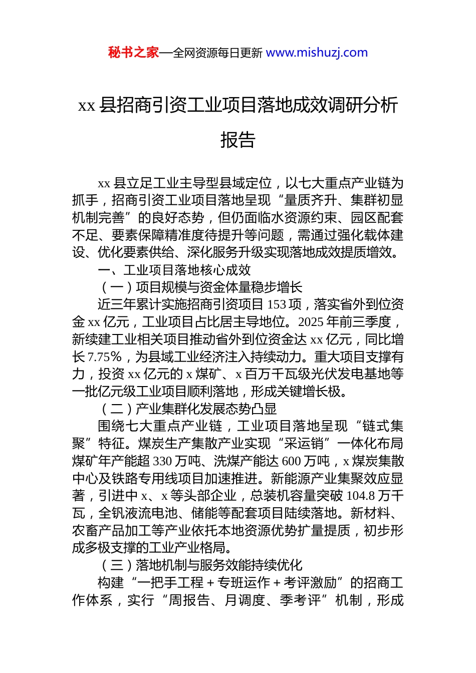 秘书之家—全网资源每日更新 www.mishuzj.comxx 县招商引资工业项目落地成效调研分析报告xx 县立足工业主导型县域定位,以七大重点产业链为抓手,招商引资工业项目落地呈现“量质齐升、集群初显机制完善”的良好态势,但仍面临水资源约束、园区配套不足、要素保障精准度待提升等问题,需通过强化载体建设、优化要素供给、深化服务升级实现落地成效提质增效。一、工业项目落地核心成效(一)项目规模与资金体量稳步增长近三年累计实施招商引资项目 153 项,落实省外到位资金 xx 亿元,工业项目占比居主导地位。2025 年前三季度,新续建工业相关项目推动省外到位资金达 xx 亿元,同比增长 7.75%,为县域工业经济注入持续动力。重大项目支撑有力,投资 xx 亿元的 x 煤矿、x 百万千瓦级光伏发电基地等一批亿元级工业项目顺利落地,形成关键增长极。(二)产业集群化发展态势凸显围绕七大重点产业链,工业项目落地呈现“链式集聚”特征。煤炭生产集散产业实现“采运销”一体化布局煤矿年产能超 330 万吨、洗煤产能达 600 万吨,x 煤炭集散中心及铁路专用线项目加速推进。新能源产业集聚效应显著,引进中 x、x 等头部企业,总装机容量突破 104.8 万千瓦,全钒液流电池、储能等配套项目陆续落地。新材料、农畜产品加工等产业依托本地资源优势扩量提质,初步形成多极支撑的工业产业格局。(三)落地机制与服务效能持续优化构建“一把手工程+专班运作+考评激励”的招商工作体系,实行“周报告、月调度、季考评”机制,形成秘书之家—全网资源每日更新 www.mishuzj.com“县级领导包抓、部门乡镇主攻、园区平台承载”的责任体系。深化“放管服”改革,推行“一单清告知+一站式代办+全周期跟踪”服务,企业开办最快 2.5 小时办结,工程项目审批时限压缩 50%以上。创新节会招商、驻点招商、市场化招商等模式,驻点招商累计签约项目 11 个,金额达xx 亿元,招商精准度显著提升。(四)经济带动作用持续释放工业项目落地推动园区承载力不断提升,“一园五区”差异化布局逐步优化,2024 年新增入园企业 23 户以上、工业增加值增长 6.41%。项目建设创造大量就业岗位,带动煤炭、新能源等产业链上下游协同发展,同时倒逼基础设施升级,电网、通信光缆等配套建设持续完善,为工业经济高质量发展奠定坚实基础。二、落地过程中存在的主要问题(一)核心要素保障存在短板水资源约束突出,全县 17 座水库总蓄水量仅占总库容的 16.8%,工业用水面临严峻挑战。土地集约利用效率有待提升,存在“五未”土地和闲置资源,部分项目用地供给时序与建设需求衔接不够顺畅。资金支持精准度不足,针对中小工业项目的融资渠道仍需拓宽,产业基金对早期项目的覆盖不够全面。(二)园区承载能力有待升级园区“一园五区”管理体制和运行机制仍需理顺,职能职责划分不够清晰。基础设施配套存在薄弱环节,供水供暖、供气管网等配套设施尚未完全满足项目落地需求。煤化工园区申报仍在推进中,部分细分产业承载平台尚未形成规模化支撑,跨区域“飞地经济”合作仍需深化。(三)市场需求低迷投资意愿下降下游焦炭和钢铁市场需求不足影响,煤炭价格断崖式下跌,暂无明显回升趋势,现有煤炭企业固定资产类投资明显下降,多以修补现有资产设备为主。光伏发电企业受秘书之家—全网资源每日更新 www.mishuzj.com限电(上网率不足 50%)及标杆电价下调影响,产值持续下降,营收不及预期,造成新能源投资项目,投资进度缓慢,招引配套产业落地困难。(四)产业链协同与政策落地仍有差距部分工业项目上下游配套不够完善,产业链条存在断点,集群化发展的协同效应尚未充分释放。部分企业对优惠政策知晓度不足,政策落实“最后一公里”问题依然存在。项目全生命周期跟踪服务仍需加强,对建设过程中突发问题的响应效率有待进一步提升。三、提升工业项目落地成效的优化建议(一)精准招引优质项目,提升落地质量承接东中部优质化工产业转移,深度谋划储备一批高技术、高成长性、高附加值项目。锚定 x、x、x 和 x 等重点目标企业,深入对接煤制氢制甲醇、煤制合成氨、煤制气煤焦化等...