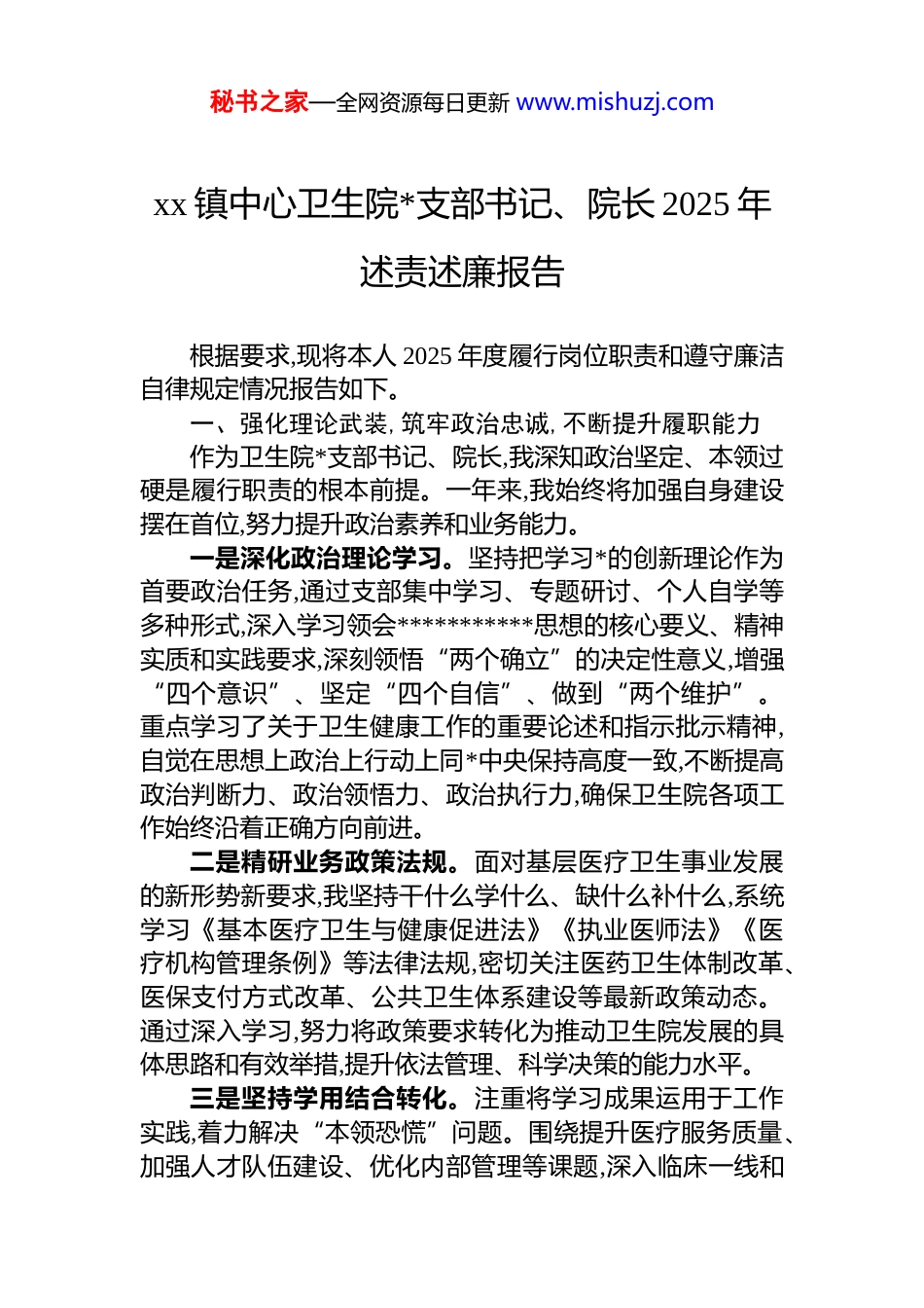 秘书之家—全网资源每日更新 www.mishuzj.comxx 镇中心卫生院*支部书记、院长 2025 年述责述廉报告根据要求,现将本人 2025 年度履行岗位职责和遵守廉洁自律规定情况报告如下。一、强化理论武装,筑牢政治忠诚,不断提升履职能力作为卫生院*支部书记、院长,我深知政治坚定、本领过硬是履行职责的根本前提。一年来,我始终将加强自身建设摆在首位,努力提升政治素养和业务能力。一是深化政治理论学习。坚持把学习*的创新理论作为首要政治任务,通过支部集中学习、专题研讨、个人自学等多种形式,深入学习领会***********思想的核心要义、精神实质和实践要求,深刻领悟“两个确立”的决定性意义,增强“四个意识”、坚定“四个自信”、做到“两个维护”。重点学习了关于卫生健康工作的重要论述和指示批示精神,自觉在思想上政治上行动上同*中央保持高度一致,不断提高政治判断力、政治领悟力、政治执行力,确保卫生院各项工作始终沿着正确方向前进。二是精研业务政策法规。面对基层医疗卫生事业发展的新形势新要求,我坚持干什么学什么、缺什么补什么,系统学习《基本医疗卫生与健康促进法》《执业医师法》《医疗机构管理条例》等法律法规,密切关注医药卫生体制改革、医保支付方式改革、公共卫生体系建设等最新政策动态。通过深入学习,努力将政策要求转化为推动卫生院发展的具体思路和有效举措,提升依法管理、科学决策的能力水平。三是坚持学用结合转化。注重将学习成果运用于工作实践,着力解决“本领恐慌”问题。围绕提升医疗服务质量、加强人才队伍建设、优化内部管理等课题,深入临床一线和秘书之家—全网资源每日更新 www.mishuzj.com科室班组开展调研,将理论学习与解决实际问题相结合,努力把学习成效体现到推动卫生院高质量发展上。二、聚焦主责主业,勇于担当作为,全力推动卫生院发展我始终牢记职责使命,坚持 dj 业务深度融合,以高质量 dj引领卫生院各项事业取得新进展。一是全面加强*的建设。认真履行 dj 工作第一责任人职责,主持制定并落实年度 dj 工作计划,健全完善支部议事规则和决策程序。大力推进*支部标准化规范化建设,严格落实“三会一课”、组织生活会、民主评议*员等制度,不断提升支部组织力。2025 年,发展预备*员 x 名,转正 x 名,组织*员开展专题学习 x 次,主题*日活动 x 次。深化“dj+”模式,设立“*员先锋岗”,引导*员在医疗救治、公共卫生、家庭医生签约服务等工作中发挥先锋模范作用,推动 dj 与业务工作同频共振、互促共进。二是着力提升医疗服务能力。始终将医疗质量安全放在核心位置。2025 年,卫生院门急诊诊疗人次达到 xx 万,同比增长 x%;住院人次 xx,同比增长 x%。我们积极引进适宜技术,拓展服务项目,如开展了 xx 新技术服务。加强医疗质量控制,严格落实核心制度,全年未发生重大医疗事故。持续改善就医环境,优化服务流程,患者综合满意度保持在 xx%以上。三是抓实抓细公共卫生服务。坚决落实国家基本公共卫生服务项目,规范开展居民健康档案管理、健康教育、预防接种、传染病及突发公共卫生事件报告和处理等工作。2025 年,适龄儿童国家免疫规划疫苗接种率保持在 xx%以上,高血压、糖尿病患者规范管理率分别达到 xx%和 xx%。有效应对了 xx 局部传染病疫情,保障了辖区群众健康安全。家庭医生签约服务覆盖率达到 xx%,重点人群签约服务实现应签尽签。四是强化人才队伍建设。坚持引育并重,2025 年通过公开招聘引进专业技术人才 x 名,选派 x 名业务骨干到上级医秘书之家—全网资源每日更新 www.mishuzj.com院进修学习。健全内部绩效考核与激励机制,营造尊重人才、关爱人才的良好氛围。加强医德医风教育,引导医务人员弘扬崇高职业精神。五是筑牢安全稳定屏障。严格落实安全生产责任制,定期开展消防、医疗、生物安全等隐患排查整治,全年未发生安全责任事故。健全矛盾纠纷排查调处机制,畅通医患沟通渠道,及时化解各类矛盾,维护了和谐稳定的医疗秩序。三、严守纪律规矩,保持清正廉洁,自觉维护良好形象我深刻认识到,廉洁是底线,更是生命线。作为单位主要负责人,我始终坚持严于律己、廉洁奉公,认真履行*风廉政建设“一岗双责”。一是严格遵...