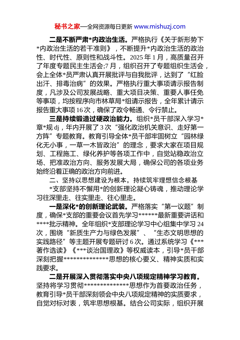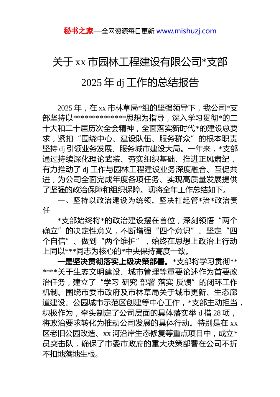 秘书之家—全网资源每日更新 www.mishuzj.com关于 xx 市园林工程建设有限公司*支部2025 年 dj 工作的总结报告2025 年,在 xx 市林草局*组的坚强领导下,我公司*支部坚持以**************思想为指导,深入学习贯彻*的二十大和二十届历次全会精神,全面落实新时代*的建设总要求,紧扣“围绕中心、建设队伍、服务群众”的根本职责坚持 dj 引领业务发展、服务城市建设大局。一年来,*支部通过持续深化理论武装、夯实组织基础、推进正风肃纪,有力推动了 dj 工作与园林工程建设业务深度融合、互促共进,为公司全面完成年度各项任务、实现高质量发展提供了坚强的政治保障和组织保障。现将全年工作总结如下。一、坚持以政治建设为统领,坚决扛起管*治*政治责任*支部始终将*的政治建设摆在首位,深刻领悟“两个确立”的决定性意义,不断增强“四个意识”、坚定“四个自信”、做到“两个维护”,始终在思想上政治上行动上同以***同志为核心的*中央保持高度一致。一是坚决贯彻落实上级决策部署。*支部将学习贯彻******关于生态文明建设、城市管理等重要论述作为首要政治任务,建立了“学习-研究-部署-落实-反馈”的闭环工作机制。围绕市委市政府及市林草局关于城市更新、生态廊道建设、公园城市示范区创建等中心工作,*支部主动担当,积极作为,牵头制定了公司层面的具体落实举 d 措 28 项,将政治要求转化为推动公司发展的具体行动。特别是在 xx区老旧公园改造、xx 河沿岸生态修复等重点项目中,成立*员突击队,确保了市委市政府的重大决策部署在公司不折不扣地落地生根。秘书之家—全网资源每日更新 www.mishuzj.com二是不断严肃*内政治生活。严格执行《关于新形势下*内政治生活的若干准则》,不断提升*内政治生活的政治性、时代性、原则性和战斗性。2025 年 1 月,高质量召开了年度专题民主生活会;7 月,组织召开了专题组织生活会,会上全体*员严肃认真开展批评与自我批评,达到了“红脸出汗、排毒治病”的效果。严格执行重大事项请示报告制度,凡涉及公司发展战略、重大项目决策、重要人事任免等事项,均按程序向市林草局*组请示报告,全年累计请示报告重大事项 16 次,确保了政令畅通、令行禁止。三是持续锻造过硬政治能力。组织*员干部深入学习*章*规 dj,年内开展了 3 次“强化政治机关意识、走好第一方阵”专题教育。教育引导全体*员干部牢固树立“园林绿化无小事,一草一木皆政治”的理念,要求大家在项目规划、工程施工、绿化养护等各项工作中,自觉站稳政治立场、把准政治方向、服务发展大局,确保公司的各项业务始终沿着正确的政治方向前进。二、坚持以思想建设为根本,持续筑牢理想信念根基*支部坚持不懈用*的创新理论凝心铸魂,推动理论学习往深里走、往实里走、往心里走。一是深化*的创新理论武装。严格落实“第一议题”制度,确保*支部的重要会议首先学习******最新重要讲话和****批示精神。全年组织*支部理论学习中心组集中学习 24次,围绕“新质生产力与绿色发展”、“生态文明思想的实践路径”等主题开展专题研讨 6 次。通过系统学习《***著作选读》《***谈治国理政》等权威读本,引导*员干部深刻把握**************思想的核心要义、精神实质和实践要求。二是开展深入贯彻落实中央八项规定精神学习教育。坚持将学习贯彻**************思想作为首要政治任务,教育引导*员干部深刻领会中央八项规定精神的实质要求,自觉对标对表,筑牢思想根基。结合公司实际,组织开展秘书之家—全网资源每日更新 www.mishuzj.com专题学习、案例警示教育,深入剖析作风建设方面存在的突出问题,推动*员干部增强纪律意识、规矩意识,持续改进工作作风,力戒形式主义、官僚主义,确保中央八项规定精神在公司落地生根、化为自觉行动。三是创新理论学习方式方法。为破解工学矛盾,提升学习实效,*支部积极创新学习载体。精心打造了“绿色讲堂”学习品牌,由公司领导、部门负责人和技术骨干轮流登台,围绕园林工程新技术、项目管理经验、*风廉政建设等主题,开展业务培训与理论分享 12 期,有效提升了*员干部的综合素质。同时,充分利用“学习强国”“xx 智...