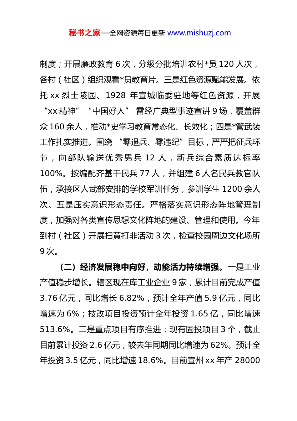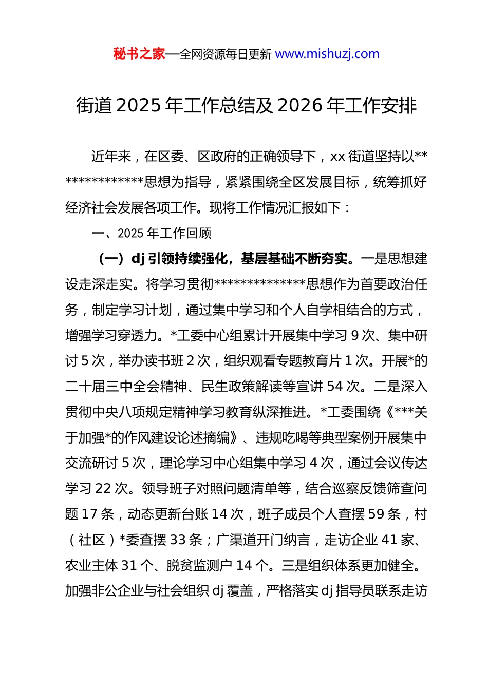 秘书之家—全网资源每日更新 www.mishuzj.com街道 2025 年工作总结及 2026 年工作安排近年来,在区委、区政府的正确领导下,xx 街道坚持以**************思想为指导,紧紧围绕全区发展目标,统筹抓好经济社会发展各项工作。现将工作情况汇报如下:一、2025 年工作回顾(一)dj 引领持续强化,基层基础不断夯实。一是思想建设走深走实。将学习贯彻**************思想作为首要政治任务,制定学习计划,通过集中学习和个人自学相结合的方式,增强学习穿透力。*工委中心组累计开展集中学习 9 次、集中研讨 5 次,举办读书班 2 次,组织观看专题教育片 1 次。开展*的二十届三中全会精神、民生政策解读等宣讲 54 次。二是深入贯彻中央八项规定精神学习教育纵深推进。*工委围绕《***关于加强*的作风建设论述摘编》、违规吃喝等典型案例开展集中交流研讨 5 次,理论学习中心组集中学习 4 次,通过会议传达学习 22 次。领导班子对照问题清单等,结合巡察反馈筛查问题 17 条,动态更新台账 14 次,班子成员个人查摆 59 条,村(社区)*委查摆 33 条;广渠道开门纳言,走访企业 41 家、农业主体 31 个、脱贫监测户 14 个。三是组织体系更加健全。加强非公企业与社会组织 dj 覆盖,严格落实 dj 指导员联系走访秘书之家—全网资源每日更新 www.mishuzj.com制度;开展廉政教育 6 次,分级分批培训农村*员 120 人次,各村(社区)组织观看*员教育片。三是红色资源赋能发展。依托 xx 烈士陵园、1928 年宣城临委驻地等红色资源,开展“xx 精神”“中国好人” 雷经广典型事迹宣讲 9 场,覆盖群众 160 余人,推动*史学习教育常态化、长效化;四是*管武装工作扎实推进。围绕 “零退兵、零违纪”目标,严严把征兵环节 , 向 部 队 输 送 优 秀 男 兵 12 人 , 新 兵 综 合 素 质 达 标 率100%。按编配齐基干民兵 77 人,并组建 6 人名民兵教官队伍,承接区人武部安排的学校军训任务,参训学生 1200 余人次。五是压实意识形态责任。严格落实意识形态阵地管理制度,加强对各类宣传思想文化阵地的建设、管理和使用。今年到村(社区)开展扫黄打非活动 3 次,检查校园周边文化场所9 次。(二)经济发展稳中向好,动能活力持续增强。一是工业产值稳步增长。辖区现在库工业企业 9 家,累计目前完成产值3.76 亿元,同比增长 6.82%,预计全年产值 5.9 亿元,同比增速为 6%;技改项目投资预计全年投资 1.65 亿,同比增速513.6%。二是重点项目有序推进:现有固投项目 3 个,截止目前累计投资 2.6 亿元,较去年同期同比增速为 62%。预计全年投资 3.5 亿元,同比增速 18.6%。目前宣州 xx 年产 28000秘书之家—全网资源每日更新 www.mishuzj.com台商用电器项目已开工建设,宣州 xx 年加工 24 万吨废钢循环利用项目正在办理土地手续。三是财政收入趋于稳定。截止目前街道完成一般公共预算收入 1719 万元,预计年度公共预算收入 2770 万元。发放补贴资金 37 项,126 批次,共计发放2367.09 万元。上报一事一议财政奖补项目 10 个,总投资145.7 万元,已经全部完工。四是营商环境持续优化:组建企业帮办代办队伍,提供“一站式”服务,营造贴心服务氛围,积极打造优质营商环境,累计目前完成企业项目立项 8 个,帮助企业解决基础设施建设、临时用电等实际问题 7 个。五是加大土地供应力度。截至目前街道已供应土地 6 宗、面积 56.71亩,其中划拨 3 宗,面积 21.86 亩;出让 2 宗,面积 34.85亩,出让价款 628 万元。六是文旅产业创新突破。招引一批“小投入、有创意、聚流量”的文旅新业态。创新发展网红打卡点“昕宸花园”、“鳄鱼咬咬面包坊”“宛陵里”“田觅拾光”,开展话题营销,积极引流,提升 xx 文旅热度。(三)乡村振兴扎实推进,产业兴旺蓬勃发展。一是和美乡村建设成效显著:全面推进 10 个乡村整治点建设,累计投入资金 178.13 万元,形成“政府引导、村社主导、村民参与”的多元投入格局。全力推进 2025 年省级精品示范村培育村提升项目,累计投...