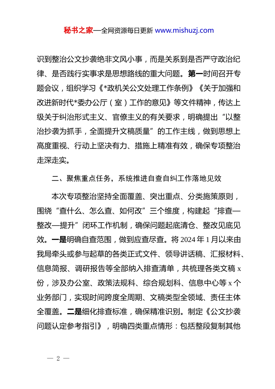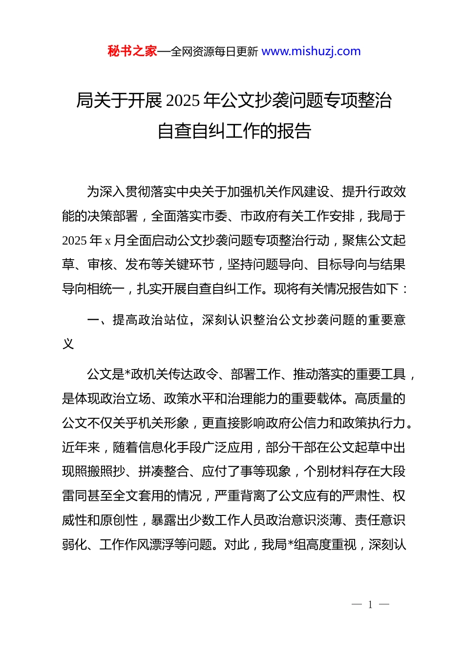 秘书之家—全网资源每日更新 www.mishuzj.com局关于开展 2025 年公文抄袭问题专项整治自查自纠工作的报告为深入贯彻落实中央关于加强机关作风建设、提升行政效能的决策部署,全面落实市委、市政府有关工作安排,我局于2025 年 x 月全面启动公文抄袭问题专项整治行动,聚焦公文起草、审核、发布等关键环节,坚持问题导向、目标导向与结果导向相统一,扎实开展自查自纠工作。现将有关情况报告如下:一、提高政治站位,深刻认识整治公文抄袭问题的重要意义公文是*政机关传达政令、部署工作、推动落实的重要工具,是体现政治立场、政策水平和治理能力的重要载体。高质量的公文不仅关乎机关形象,更直接影响政府公信力和政策执行力。近年来,随着信息化手段广泛应用,部分干部在公文起草中出现照搬照抄、拼凑整合、应付了事等现象,个别材料存在大段雷同甚至全文套用的情况,严重背离了公文应有的严肃性、权威性和原创性,暴露出少数工作人员政治意识淡薄、责任意识弱化、工作作风漂浮等问题。对此,我局*组高度重视,深刻认— 1 —秘书之家—全网资源每日更新 www.mishuzj.com识到整治公文抄袭绝非文风小事,而是关系到是否严守政治纪律、是否践行实事求是思想路线的重大问题。第一时间召开专题会议,组织学习《*政机关公文处理工作条例》《关于加强和改进新时代*委办公厅(室)工作的意见》等文件精神,传达上级关于纠治形式主义、官僚主义的有关要求,明确提出“以整治抄袭为抓手,全面提升文稿质量”的工作主线,做到思想上高度重视、行动上坚决有力、措施上精准有效,确保专项整治走深走实。二、聚焦重点任务,系统推进自查自纠工作落地见效本次专项整治坚持全面覆盖、突出重点、分类施策原则,围绕“查什么、怎么查、如何改”三个维度,构建起“排查—整改—提升”闭环工作机制,确保问题起底清仓、整改见底见效。一是明确自查范围,做到应查尽查。将 2024 年 1 月以来由我局牵头或参与起草的各类正式文件、领导讲话稿、汇报材料、信息简报、调研报告等全部纳入排查清单,共梳理各类文稿 x份,涉及办公室、政策法规科、综合规划科、信息中心等 x 个业务部门,实现时间跨度全周期、文稿类型全领域、责任主体全覆盖。二是细化排查标准,确保精准识别。制定《公文抄袭问题认定参考指引》,明确四类重点情形:包括整段复制其他— 2 —秘书之家—全网资源每日更新 www.mishuzj.com单位公开文件未注明出处的;套用网络素材或自媒体文章内容未作实质性修改的;不同文稿之间存在高度雷同表述且无合理解释的;引用政策法规、数据资料存在张冠李戴、断章取义等误导性表述的。依托第三方查重系统对 x 份重点文稿进行技术检测,平均重复率由整治前的 x%下降至 x%,初步筛查出疑似问题文稿 x 份。三是压实整改责任,推动立行立改。针对发现的问题,建立“问题台账+整改清单+责任到人”机制,逐篇分析成因,分类处置。对于因时间紧任务重导致引用不规范的,责成相关责任人重新核校并补充注释;对于确属照搬照抄的,由分管领导约谈当事人,责令作出书面检查,并在部门内通报批评;对于涉及多部门协作产生的共性问题,召开专题协调会研究改进流程。截至目前,已完成整改 x 项,其余 x 项正在有序推进,预计在 x 月底前全部销号。三、深挖问题根源,推动作风建设向纵深发展在深入排查的基础上,我局坚持刀刃向内、深挖病灶,从思想认识、制度机制、能力素养等多个层面查摆深层次原因,力求标本兼治。一是思想认识存在偏差。个别干部对公文的政治属性理解不深,片面认为“只要内容正确、领导满意就行”,忽视原创性和规范性要求,存在“拿来主义”心理,认为“借— 3 —秘书之家—全网资源每日更新 www.mishuzj.com鉴即合理”,未能真正树立“文经我手无差错”的职业操守。二是制度执行不够严格。虽然已建立公文审核“三审三校”制度,但在实际操作中存在把关不严、层层递减现象,部分环节流于形式,特别在紧急发文时易出现“先发后补”“边发边改”等情况,给抄袭行为留下可乘之机。三是能力培训有待加强。部分年轻干部政策把握能力、文字表达能力和调研分析能力...