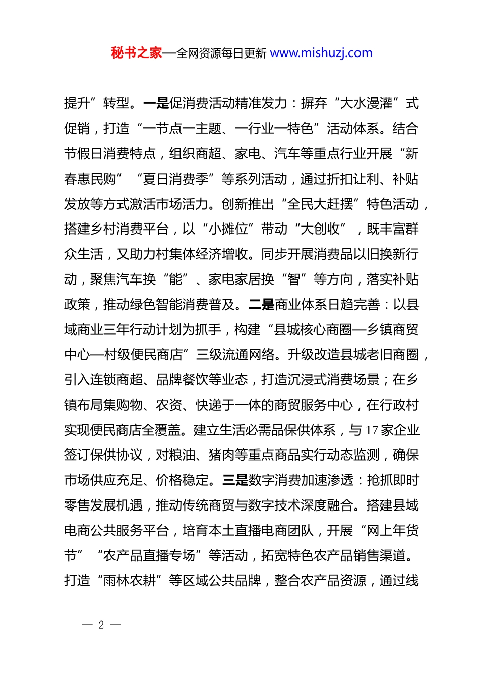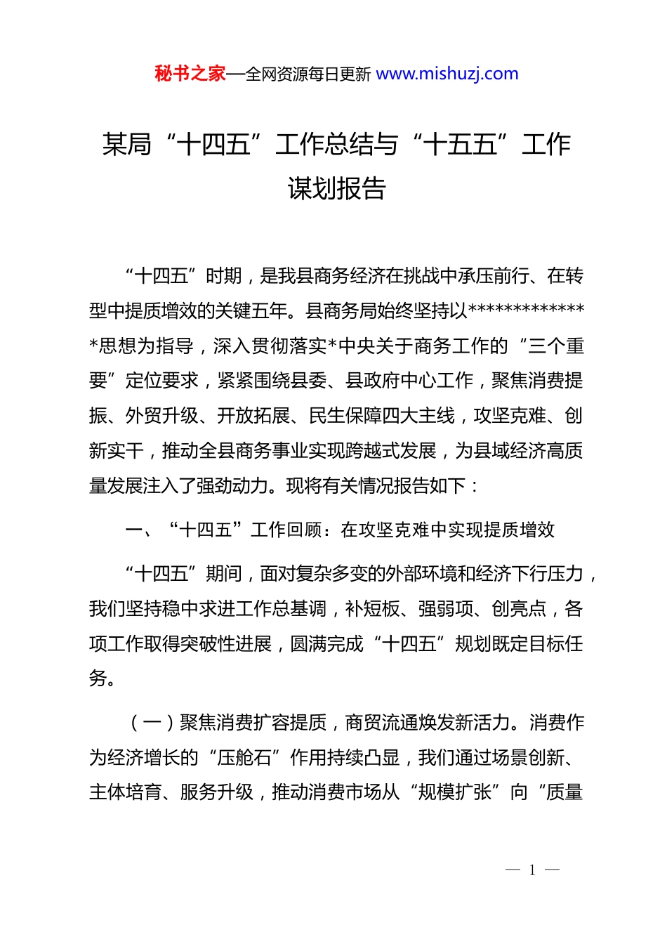秘书之家—全网资源每日更新 www.mishuzj.com某局“十四五”工作总结与“十五五”工作谋划报告“十四五”时期,是我县商务经济在挑战中承压前行、在转型中提质增效的关键五年。县商务局始终坚持以**************思想为指导,深入贯彻落实*中央关于商务工作的“三个重要”定位要求,紧紧围绕县委、县政府中心工作,聚焦消费提振、外贸升级、开放拓展、民生保障四大主线,攻坚克难、创新实干,推动全县商务事业实现跨越式发展,为县域经济高质量发展注入了强劲动力。现将有关情况报告如下:一、“十四五”工作回顾:在攻坚克难中实现提质增效“十四五”期间,面对复杂多变的外部环境和经济下行压力,我们坚持稳中求进工作总基调,补短板、强弱项、创亮点,各项工作取得突破性进展,圆满完成“十四五”规划既定目标任务。(一)聚焦消费扩容提质,商贸流通焕发新活力。消费作为经济增长的“压舱石”作用持续凸显,我们通过场景创新、主体培育、服务升级,推动消费市场从“规模扩张”向“质量— 1 —秘书之家—全网资源每日更新 www.mishuzj.com提升”转型。一是促消费活动精准发力:摒弃“大水漫灌”式促销,打造“一节点一主题、一行业一特色”活动体系。结合节假日消费特点,组织商超、家电、汽车等重点行业开展“新春惠民购”“夏日消费季”等系列活动,通过折扣让利、补贴发放等方式激活市场活力。创新推出“全民大赶摆”特色活动,搭建乡村消费平台,以“小摊位”带动“大创收”,既丰富群众生活,又助力村集体经济增收。同步开展消费品以旧换新行动,聚焦汽车换“能”、家电家居换“智”等方向,落实补贴政策,推动绿色智能消费普及。二是商业体系日趋完善:以县域商业三年行动计划为抓手,构建“县城核心商圈—乡镇商贸中心—村级便民商店”三级流通网络。升级改造县城老旧商圈,引入连锁商超、品牌餐饮等业态,打造沉浸式消费场景;在乡镇布局集购物、农资、快递于一体的商贸服务中心,在行政村实现便民商店全覆盖。建立生活必需品保供体系,与 17 家企业签订保供协议,对粮油、猪肉等重点商品实行动态监测,确保市场供应充足、价格稳定。三是数字消费加速渗透:抢抓即时零售发展机遇,推动传统商贸与数字技术深度融合。搭建县域电商公共服务平台,培育本土直播电商团队,开展“网上年货节”“农产品直播专场”等活动,拓宽特色农产品销售渠道。打造“雨林农耕”等区域公共品牌,整合农产品资源,通过线— 2 —秘书之家—全网资源每日更新 www.mishuzj.com上线下联动提升产品附加值。建立电商监测网络,完善物流配送体系,带动数千人实现就业增收。(二)聚力外贸稳进提质,开放型经济迈出新步伐。紧扣高水平对外开放要求,推动外贸从“通道式”流动向“产业化”扎根转变,实现规模与质量双提升。一是 外贸规模稳步增长:克服全球贸易波动影响,优化外贸服务流程,建立重点外贸企业“一对一”帮扶机制,及时解决报关、物流、融资等难题。引导企业扩大优势产品出口,培育壮大农产品加工、轻工制造等出口主导产业,推动出口产品从“初级加工”向“精深加工”升级。“十四五”期间,全县进出口贸易额持续攀升,年均增长率保持两位数以上。二是新业态新模式蓬勃发展:创新“互联网+边民互市”贸易模式,搭建线上交易结算平台,通过“边互通”app 实现商品远程选购与线下交易联动,推动边民互市规范化、规模化发展。培育跨境电商主体,支持企业建设海外仓,借助跨境电商平台拓展国际市场,降低传统贸易门槛。推动外贸与产业融合,鼓励出口企业延伸产业链,实现“出口产品本地化、本地产品国际化”。三是开放平台能级提升:全力推进勐满口岸对外开放获批工作,完善口岸查验设施,优化通关流程,提升通关效率。以口岸开放为契机,打造口岸— 3 —秘书之家—全网资源每日更新 www.mishuzj.com经济集聚区,吸引物流、贸易、加工企业入驻,推动“通道经济”向“落地经济”转型。加强与共建“一带一路”国家经贸合作,扩大外贸“朋友圈”,提升县域经济对外开放度。(三)着力市场监管规范,行业发展筑牢新防线。坚持监管与服务并重,以法治化、智能化手段规范市场秩序,保...