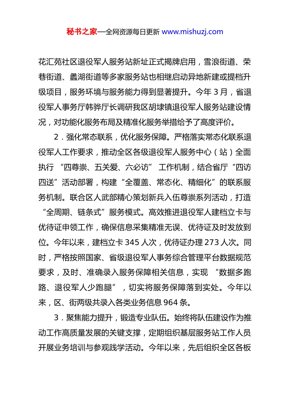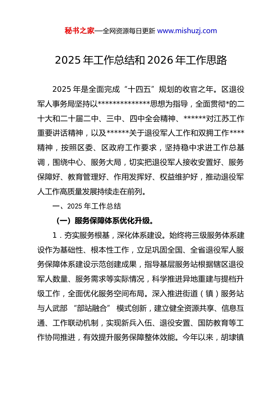 秘书之家—全网资源每日更新 www.mishuzj.com2025 年工作总结和 2026 年工作思路2025 年是全面完成“十四五”规划的收官之年。区退役军人事务局坚持以**************思想为指导,全面贯彻*的二十大和二十届二中、三中、四中全会精神、******对江苏工作重要讲话精神,以及******关于退役军人工作和双拥工作****精神,按照区委、区政府工作要求,坚持稳中求进工作总基调,围绕中心、服务大局,切实把退役军人接收安置好、服务保障好、教育管理好、作用发挥好、权益维护好,推动退役军人工作高质量发展持续走在前列。一、2025 年工作总结(一)服务保障体系优化升级。1.夯实服务根基,深化体系建设。始终将三级服务体系建设作为基础性、根本性工作,立足巩固全国、全省退役军人服务保障体系建设示范创建成果,指导基层服务站根据辖区退役军人数量、服务需求等实际情况,科学推进异地重建与提档升级工作,全面优化服务空间布局。深入推进街道(镇)服务站与人武部 “部站融合” 模式创新,建立健全资源共享、信息互通、工作联动机制,实现新兵入伍、退役安置、国防教育等工作协同推进,有效提升服务保障整体效能。今年以来,胡埭镇秘书之家—全网资源每日更新 www.mishuzj.com花汇苑社区退役军人服务站新址正式揭牌启用,雪浪街道、荣巷街道、蠡湖街道等多家服务站也相继启动异地新建或提档升级项目,服务环境与服务能力得到显著提升。今年 3 月,省退役军人事务厅韩骅厅长调研我区胡埭镇退役军人服务站建设情况,对功能化服务布局及精准化服务举措给予了高度评价。2.强化常态联系,优化服务保障。严格落实常态化联系退役军人工作要求,推动全区各级退役军人服务中心(站)全面执行 “四尊崇、五关爱、六必访” 工作机制,结合省厅“四访四送”活动部署,构建“全覆盖、常态化、精细化”的联系服务机制。联合区人武部精心策划新兵入伍尊崇系列活动,打造“全周期、链条式”服务模式。高效推进退役军人建档立卡与优待证申领工作,确保信息采集精准无误、优待证及时发放到位。今年以来,建档立卡 345 人次,优待证办理 273 人次。同时,严格按照国家、省级退役军人事务综合管理平台数据规范要求,及时、准确录入服务保障相关信息,实现 “数据多跑路、退役军人少跑腿”,切实将服务保障落到实处。今年以来,区、街两级共录入各类业务信息 964 条。3.聚焦能力提升,锻造专业队伍。始终将队伍建设作为推动工作高质量发展的关键支撑,定期组织基层服务站工作人员开展业务培训与参观践学活动。今年以来,先后组织全区各板秘书之家—全网资源每日更新 www.mishuzj.com块及部分社区(村)退役军人服务站工作人员赴 xx 区胡埭镇、惠山区前洲街道、梁溪区广益街道等省级、市级先进示范站点开展实地观摩学习,通过“现场教学+经验分享+互动交流”的方式,学习先进地区在服务体系建设、常态化联系、志愿服务开展等方面的优秀经验,有效拓宽工作人员工作思路。同时,积极组织全区退役军人事务工作者参与退役军人事务部、省厅、市局组织的服务中心(站)提质增效线上交流见学活动,全方位提升服务队伍的专业化水平和职业化素养,打造一支 “懂政策、会服务、善作为”的过硬队伍。4.推进档案数字化,提升管理效能。严格贯彻落实退役军人事务部、省退役军人事务厅关于 “加强和改进退役军人人事档案管理利用工作”的相关文件精神,将档案数字化建设作为提升管理效能、维护退役军人合法权益的重要举措,全面启动全区退役军人人事档案整理及数字化工作。通过政府购买服务方式,遴选专业档案服务机构,严格按照档案整理规范要求,对全区已收集的无工作单位管理的退役军人人事档案进行分类整理、信息著录、扫描录入及归档入库,建立“纸质档案+电子档案”双套管理模式。上半年已完成 2976 份无工作单位存量人事档案整理及数字化工作,有效提升档案管理规范化水平和利用便捷性,办理档案查询 90 人,档案移交 11 人,为退役秘书之家—全网资源每日更新 www.mishuzj.com军人入学、办理退休军龄认定、*团员关系认定,优抚证申领等事项提供有力支撑。目前,已启动 2025 ...