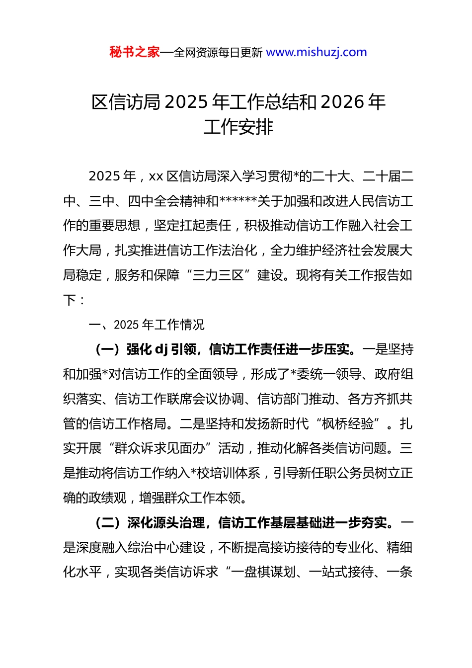 秘书之家—全网资源每日更新 www.mishuzj.com区信访局 2025 年工作总结和 2026 年工作安排2025 年,xx 区信访局深入学习贯彻*的二十大、二十届二中、三中、四中全会精神和******关于加强和改进人民信访工作的重要思想,坚定扛起责任,积极推动信访工作融入社会工作大局,扎实推进信访工作法治化,全力维护经济社会发展大局稳定,服务和保障“三力三区”建设。现将有关工作报告如下:一、2025 年工作情况(一)强化 dj 引领,信访工作责任进一步压实。一是坚持和加强*对信访工作的全面领导,形成了*委统一领导、政府组织落实、信访工作联席会议协调、信访部门推动、各方齐抓共管的信访工作格局。二是坚持和发扬新时代“枫桥经验”。扎实开展“群众诉求见面办”活动,推动化解各类信访问题。三是推动将信访工作纳入*校培训体系,引导新任职公务员树立正确的政绩观,增强群众工作本领。(二)深化源头治理,信访工作基层基础进一步夯实。一是深度融入综治中心建设,不断提高接访接待的专业化、精细化水平,实现各类信访诉求“一盘棋谋划、一站式接待、一条秘书之家—全网资源每日更新 www.mishuzj.com龙办理、一揽子解决”。二是建立信访大数据分析模型,探索形成“源头预防+专项攻坚”类案治理模式,有效遏制同质信访增量。三是推行“形式+实体”双审查工作机制,按照“登全、研细、转准、督实”的工作要求,构建“归口办理+转交转办+督查督办”的闭环管理机制。(三)聚力重点攻坚,信访积案存量进一步压减。一是开展历史积案“大起底、大排查、大化解”活动,攻坚化解了一批历史积案。二是全面落实“双交双办”工作机制,扎实推进省信联办交办三批重点信访事项化解。三是按照“五个一”的工作要求,高效完成巡视交办任务。(四)服务中心大局,信访保障能力进一步提升。一是圆满完成重大时段信访安全保障工作。二是依法依规打击处理信访领域违法犯罪行为,有力维护了信访秩序,维护了社会大局稳定。三是充分发挥信访“晴雨表”作用,针对热点、难点信访问题,及时开展调查研究,为各级各部门做好本领域、本辖区工作提供了有力参考。二、存在问题(一)基层吸附能力有待加强。从信访事项受理层级等况来看,我区在排查预警、吸附稳定、攻坚化解等方面仍需进一步强化。秘书之家—全网资源每日更新 www.mishuzj.com(二)问题化解效率有待提升。部分信访事项办理流程不够优化,办理周期较长,未能实现“抓早抓小”的工作目标。部分信访件办理质量参差不齐,答复内容针对性不强,未能从根本上解决群众合理诉求,出现重复信访、越级信访现象。(三)信访积案化解难度较大。部分信访积案时间跨度长、历史背景复杂,涉及政策调整、利益格局变动等多方面因素,化解工作面临诸多困难。部分信访人诉求超出政策法规范围,期望值过高,沟通疏导难度大,导致积案化解工作进展缓慢。三、2026 年工作安排(一)聚焦政治能力建设,全面夯实信访工作基础。实施“信访干部赋能计划”,重点加强《信访工作条例》等法规政策、群众工作方法、心理疏导技巧、应急处置能力的培训,提升基层治理水平。深化“dj+信访”模式,引导信访服务窗口前移。严格落实信访工作履职清单,厘清权责边界,切实为基层减负松绑。(二)聚焦源头治理攻坚,构建多元共治化解体系。健全住建领域物业管理纠纷专项调处、劳资领域双拖欠问题联动治理、区委社会工作部每周一议”三项协同治理机制,实现矛盾纠纷早发现、早化解。实施圆桌调解、积案攻坚、基层吸附力秘书之家—全网资源每日更新 www.mishuzj.com提升三大专项治理行动,提升信访事项实体化解率,减少矛盾上行。(三)聚焦风险闭环处置,防范矛盾上行。完善预测预警、应急处置、闭环管理三大体系,做到“一事一分析、一案一复盘”,实现“处置一个案件、完善一套机制、提升一类能力”的良性循环。(四)聚焦服务决策能力,提升信访工作贡献度。深化数据分析,做实人民建议征集,推动治理协同联动,为科学决策提供精准、高效的民意支撑和风险预判,推动民意诉求进入决策层面,实现“民呼我应、政民互动”,不断提升信访工作在全区治理体系中的贡献度和影响力。