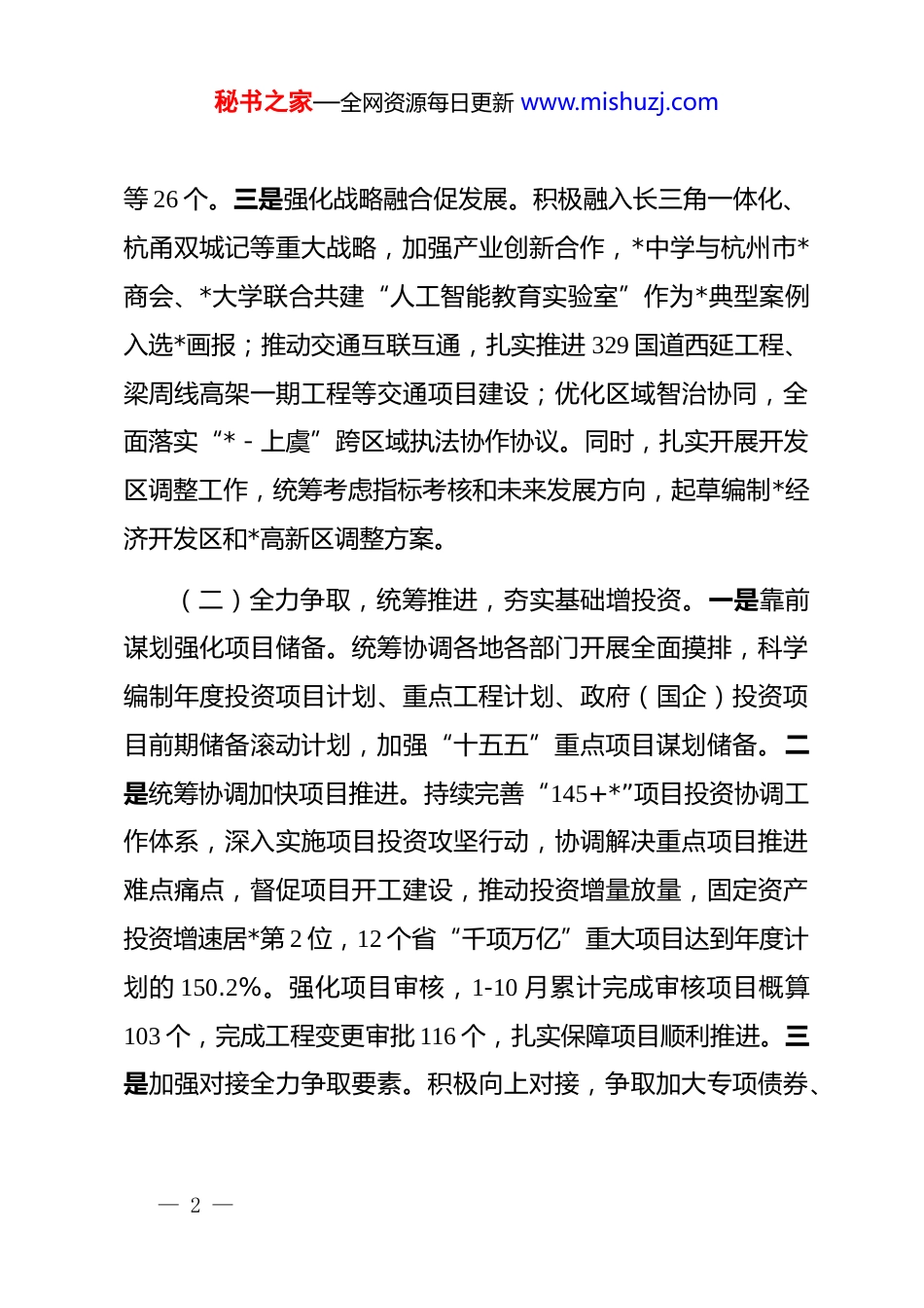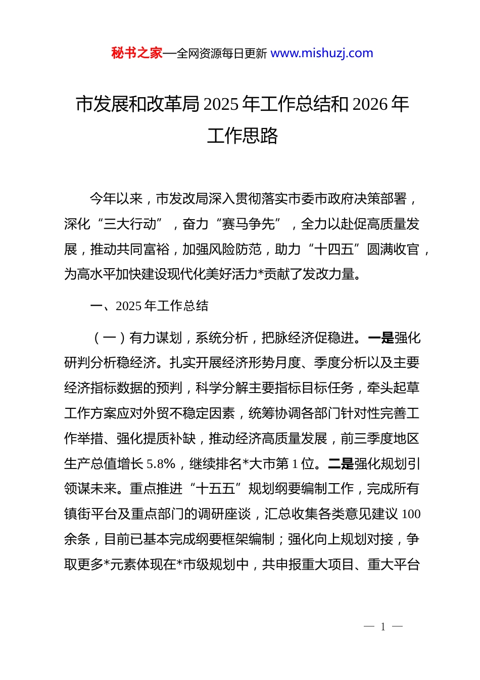 秘书之家—全网资源每日更新 www.mishuzj.com市发展和改革局 2025 年工作总结和 2026 年工作思路今年以来,市发改局深入贯彻落实市委市政府决策部署,深化“三大行动”,奋力“赛马争先”,全力以赴促高质量发展,推动共同富裕,加强风险防范,助力“十四五”圆满收官,为高水平加快建设现代化美好活力*贡献了发改力量。一、2025 年工作总结(一)有力谋划,系统分析,把脉经济促稳进。一是强化研判分析稳经济。扎实开展经济形势月度、季度分析以及主要经济指标数据的预判,科学分解主要指标目标任务,牵头起草工作方案应对外贸不稳定因素,统筹协调各部门针对性完善工作举措、强化提质补缺,推动经济高质量发展,前三季度地区生产总值增长 5.8%,继续排名*大市第 1 位。二是强化规划引领谋未来。重点推进“十五五”规划纲要编制工作,完成所有镇街平台及重点部门的调研座谈,汇总收集各类意见建议 100余条,目前已基本完成纲要框架编制;强化向上规划对接,争取更多*元素体现在*市级规划中,共申报重大项目、重大平台— 1 —秘书之家—全网资源每日更新 www.mishuzj.com等 26 个。三是强化战略融合促发展。积极融入长三角一体化、杭甬双城记等重大战略,加强产业创新合作,*中学与杭州市*商会、*大学联合共建“人工智能教育实验室”作为*典型案例入选*画报;推动交通互联互通,扎实推进 329 国道西延工程、梁周线高架一期工程等交通项目建设;优化区域智治协同,全面落实“*-上虞”跨区域执法协作协议。同时,扎实开展开发区调整工作,统筹考虑指标考核和未来发展方向,起草编制*经济开发区和*高新区调整方案。(二)全力争取,统筹推进,夯实基础增投资。一是靠前谋划强化项目储备。统筹协调各地各部门开展全面摸排,科学编制年度投资项目计划、重点工程计划、政府(国企)投资项目前期储备滚动计划,加强“十五五”重点项目谋划储备。二是统筹协调加快项目推进。持续完善“145+*”项目投资协调工作体系,深入实施项目投资攻坚行动,协调解决重点项目推进难点痛点,督促项目开工建设,推动投资增量放量,固定资产投资增速居*第 2 位,12 个省“千项万亿”重大项目达到年度计划的 150.2%。强化项目审核,1-10 月累计完成审核项目概算103 个,完成工程变更审批 116 个,扎实保障项目顺利推进。三是加强对接全力争取要素。积极向上对接,争取加大专项债券、— 2 —秘书之家—全网资源每日更新 www.mishuzj.com中央预算内投资、超长期国债、国家新型政策性金融工具等政策支持,申报地方政府专项债项目 22 个。(三)强化布局,抢抓育新,打造产业增长极。一是多举措推动产业发展。配合编制出台《*市关于推动经济高质量发展若干政策》,梳理各类政策 53 条。扎实推进战略性新兴产业发展,1-9 月战略性新兴产业增加值 161.07 亿元,增速 7.6%,*排名第 4。积极培育发展低空经济,全面摸排调研产业基础和存在问题,起草编制《*市低空经济发展规划》,抓住机遇着力推动促进低空经济全产业链发展。二是多维度推动服务业提质。统筹推进服务业招商工作,分解落实招商目标和任务,目前已推动落地项目 58 个,其中落地亿元以上项目 8 个;着力完善新一轮服务业产业政策,推动落实生产性服务业高质量发展行动,研究破题楼宇经济发展,加强消费券资金和消费品以旧换新统筹协调工作,扎实推动服务业提质发展。前三季度,服务业增加值完成 502.45 亿元,增速 5.0%,列*第 5 位。三是多层面推动生态建设。扎实抓好“双碳”工作,牵头制定我市省级减污降碳协同试点行动方案,协调推进省各类低碳试点和循环园区建设,今年新增省级绿色工厂 4 家、*零碳工厂 3 家,多个项目列入省级减污降碳标杆项目。扎实推进能耗“双控”工作,1-9— 3 —秘书之家—全网资源每日更新 www.mishuzj.com月全市工业增加值能耗下降 5.4%,*排名第一;半年度 gdp 能耗下降 8.2%,*排名第三。扎实能源项目建设,1-9 月,全市新增分布式光伏装机 29.62 万千瓦,可再生能源发电量同比增长82%,三峡 167mw 渔光互补项目前期工作有序推进,新增公共充电桩 757...
