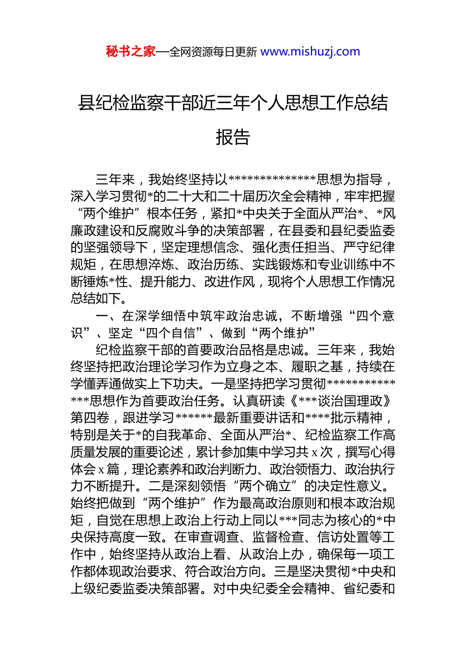 秘书之家—全网资源每日更新 www.mishuzj.com县纪检监察干部近三年个人思想工作总结报告三年来,我始终坚持以**************思想为指导,深入学习贯彻*的二十大和二十届历次全会精神,牢牢把握“两个维护”根本任务,紧扣*中央关于全面从严治*、*风廉政建设和反腐败斗争的决策部署,在县委和县纪委监委的坚强领导下,坚定理想信念、强化责任担当、严守纪律规矩,在思想淬炼、政治历练、实践锻炼和专业训练中不断锤炼*性、提升能力、改进作风,现将个人思想工作情况总结如下。一、在深学细悟中筑牢政治忠诚,不断增强“四个意识”、坚定“四个自信”、做到“两个维护”纪检监察干部的首要政治品格是忠诚。三年来,我始终坚持把政治理论学习作为立身之本、履职之基,持续在学懂弄通做实上下功夫。一是坚持把学习贯彻**************思想作为首要政治任务。认真研读《***谈治国理政》第四卷,跟进学习******最新重要讲话和****批示精神,特别是关于*的自我革命、全面从严治*、纪检监察工作高质量发展的重要论述,累计参加集中学习共 x 次,撰写心得体会 x 篇,理论素养和政治判断力、政治领悟力、政治执行力不断提升。二是深刻领悟“两个确立”的决定性意义。始终把做到“两个维护”作为最高政治原则和根本政治规矩,自觉在思想上政治上行动上同以***同志为核心的*中央保持高度一致。在审查调查、监督检查、信访处置等工作中,始终坚持从政治上看、从政治上办,确保每一项工作都体现政治要求、符合政治方向。三是坚决贯彻*中央和上级纪委监委决策部署。对中央纪委全会精神、省纪委和秘书之家—全网资源每日更新 www.mishuzj.com市纪委工作安排第一时间学习领会,结合岗位职责细化落实措施,确保政令畅通、令行禁止。在开展乡村振兴领域不正之风和腐败问题专项整治中,主动对标中央要求,聚焦群众反映强烈的突出问题,推动查处了一批侵害群众利益的“微腐败”案件,以实际行动践行对*忠诚。二、在履职尽责中彰显担当作为,推动纪检监察工作高质量发展取得新成效纪检监察工作政治性、政策性、专业性强,必须在实践中不断锤炼斗争精神、增强斗争本领。三年来,我始终秉持“监督保障执行、促进完善发展”的职责定位,在实干中增长才干,在历练中砥砺品格。(一)聚焦主责主业,监督检查质效稳步提升。坚持把日常监督挺在前面,综合运用谈心谈话、列席会议、查阅资料、走访调研等方式,加强对“一把手”和领导班子的监督。三年来,累计开展廉政谈话 x 人次,参加被监督单位“三重一大”事项决策会议 x 次,发现并督促整改问题 x个。围绕贯彻落实纪律规定精神,紧盯节日期间“四风”问题,组织开展明察暗访 x 轮次,发现疑似问题线索 x 条,推动相关单位建章立制 x 项。在优化营商环境监督中,深入企业走访调研共 x 次,收集意见建议 x 条,督促职能部门整改服务短板 x 个,推动构建亲清政商关系。(二)强化审查调查,反腐高压态势持续巩固。始终坚持以零容忍态度惩治腐败,三年来参与办理问题线索 x 件,主办或协办违纪违法案件 x 件,涉及乡科级干部 x 人、一般干部 x 人。在查办某乡镇干部虚报冒领惠民补贴案中,面对取证难、阻力大等困难,带领专班连续奋战 x 天,调取账目资料 x 余册,走访群众 x 余人次,最终查实违纪资金 x 万元,追缴 x 万元,x 人受到 dj 政务处分,x 人被移送司法机关。坚持依规依纪依法办案,严守办案安全底线,实现审查调查“零事故”、办案人员“零违纪”。注重做好案件查办“后半篇文章”,针对案件暴露出的制度漏洞和监管盲区秘书之家—全网资源每日更新 www.mishuzj.com制发纪检监察建议书 x 份,推动案发单位开展以案促改、以案促治。(三)深化专项治理,群众获得感幸福感安全感不断增强。始终坚持以人民为中心的发展思想,把维护群众利益作为工作的出发点和落脚点。在开展教育医疗、养老社保、生态环保等民生领域腐败和作风问题专项整治中,牵头组织监督检查 x 次,发现并推动解决群众急难愁盼问题 x个。例如,在农村集体“三资”管理专项清查中,发现某村集体土地出租程序不规范问题,督促重新组织...