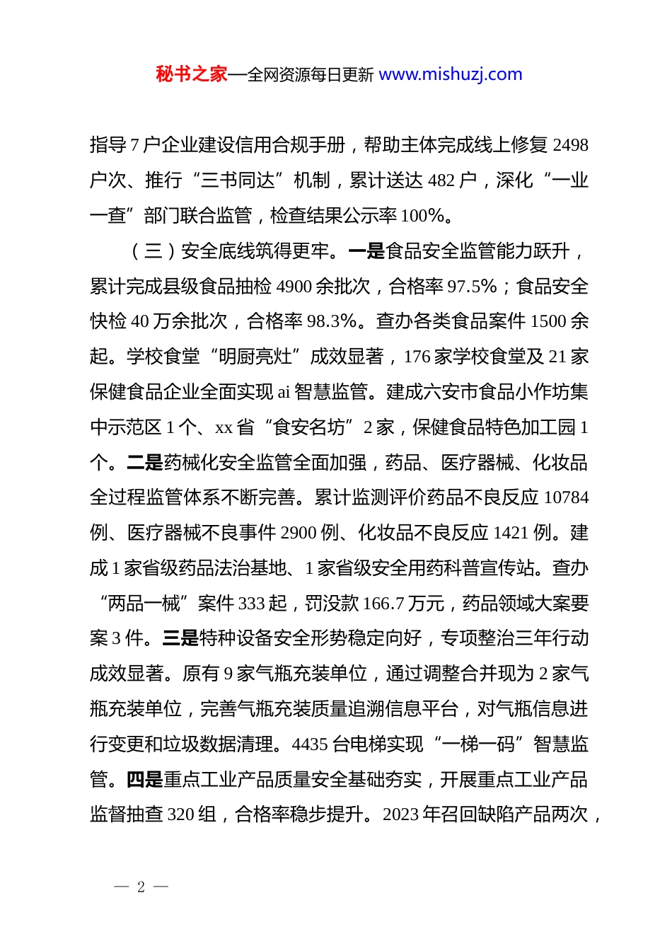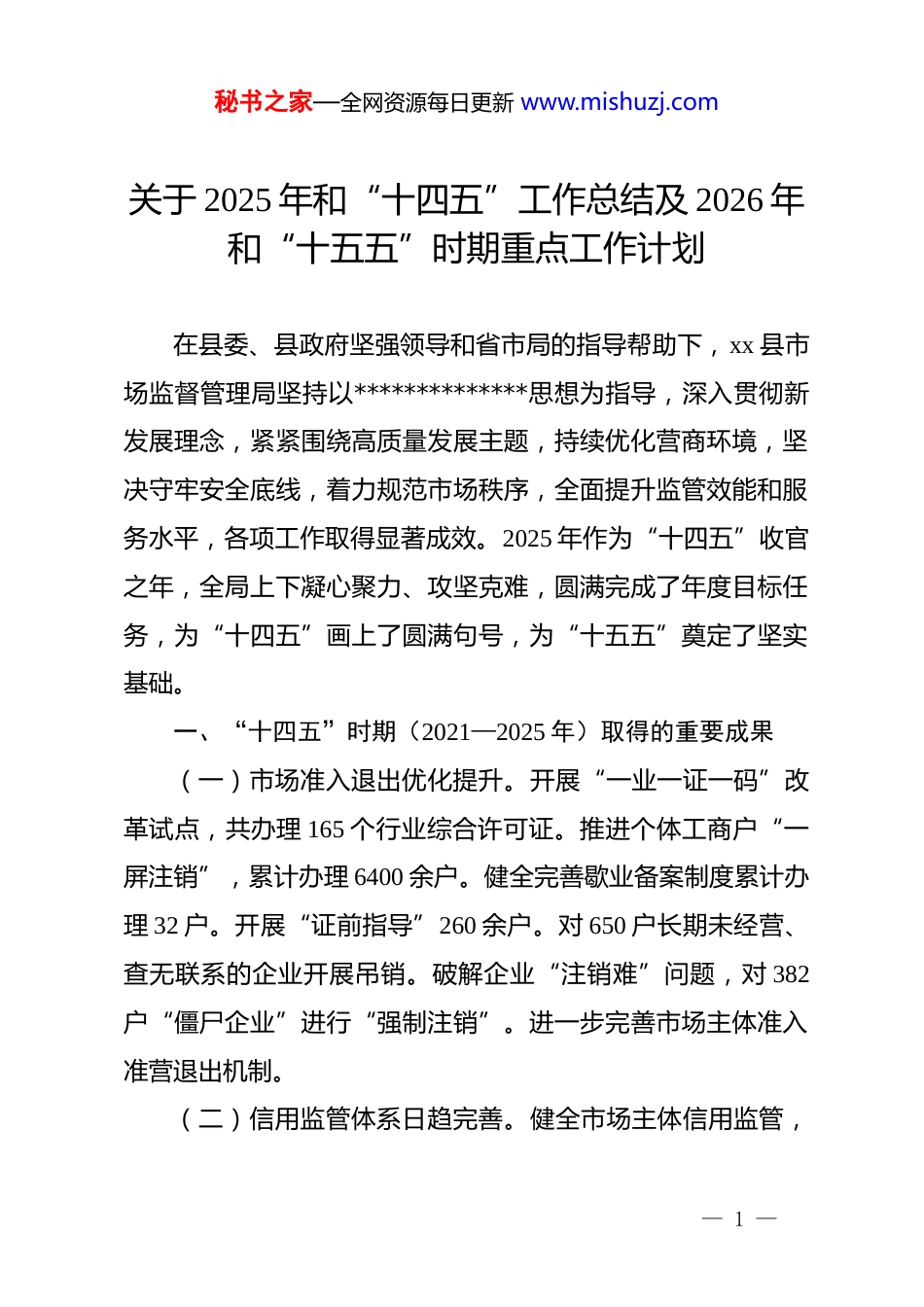 秘书之家—全网资源每日更新 www.mishuzj.com关于 2025 年和“十四五”工作总结及 2026 年和“十五五”时期重点工作计划在县委、县政府坚强领导和省市局的指导帮助下,xx 县市场监督管理局坚持以**************思想为指导,深入贯彻新发展理念,紧紧围绕高质量发展主题,持续优化营商环境,坚决守牢安全底线,着力规范市场秩序,全面提升监管效能和服务水平,各项工作取得显著成效。2025 年作为“十四五”收官之年,全局上下凝心聚力、攻坚克难,圆满完成了年度目标任务,为“十四五”画上了圆满句号,为“十五五”奠定了坚实基础。一、“十四五”时期(2021—2025 年)取得的重要成果(一)市场准入退出优化提升。开展“一业一证一码”改革试点,共办理 165 个行业综合许可证。推进个体工商户“一屏注销”,累计办理 6400 余户。健全完善歇业备案制度累计办理 32 户。开展“证前指导”260 余户。对 650 户长期未经营、查无联系的企业开展吊销。破解企业“注销难”问题,对 382户“僵尸企业”进行“强制注销”。进一步完善市场主体准入准营退出机制。(二)信用监管体系日趋完善。健全市场主体信用监管,— 1 —秘书之家—全网资源每日更新 www.mishuzj.com指导 7 户企业建设信用合规手册,帮助主体完成线上修复 2498户次、推行“三书同达”机制,累计送达 482 户,深化“一业一查”部门联合监管,检查结果公示率 100%。(三)安全底线筑得更牢。一是食品安全监管能力跃升,累计完成县级食品抽检 4900 余批次,合格率 97.5%;食品安全快检 40 万余批次,合格率 98.3%。查办各类食品案件 1500 余起。学校食堂“明厨亮灶”成效显著,176 家学校食堂及 21 家保健食品企业全面实现 ai 智慧监管。建成六安市食品小作坊集中示范区 1 个、xx 省“食安名坊”2 家,保健食品特色加工园 1个。二是药械化安全监管全面加强,药品、医疗器械、化妆品全过程监管体系不断完善。累计监测评价药品不良反应 10784例、医疗器械不良事件 2900 例、化妆品不良反应 1421 例。建成 1 家省级药品法治基地、1 家省级安全用药科普宣传站。查办“两品一械”案件 333 起,罚没款 166.7 万元,药品领域大案要案 3 件。三是特种设备安全形势稳定向好,专项整治三年行动成效显著。原有 9 家气瓶充装单位,通过调整合并现为 2 家气瓶充装单位,完善气瓶充装质量追溯信息平台,对气瓶信息进行变更和垃圾数据清理。4435 台电梯实现“一梯一码”智慧监管。四是重点工业产品质量安全基础夯实,开展重点工业产品监督抽查 320 组,合格率稳步提升。2023 年召回缺陷产品两次,— 2 —秘书之家—全网资源每日更新 www.mishuzj.com数量 294 个,2025 年召回缺陷产品一次,数量 438 个。成功组织开展省级“产品质量开放日”活动、长三角三省一市工业产品质量安全突发事件应急演练活动。(四)市场秩序维护成效突出。高度重视市场领域案件查办工作,聚焦民生关切,查办各类案件 2000 余起,“十四五”期间成功查办多起大要案,办理行刑衔接案件 17 起。2025 年民生领域“铁拳”行动报送典型案例 11 起。消费环境持续优化,建成“放心消费在 xx”智慧导航系统,累计受理消费者投诉举报 10235 件,办结率 100%,发展线下无理由退货单位 120 家,培育省级放心消费优秀单位、街区等标杆。(五)创新驱动质效显著增强。成功创建 xx 省质量强县,2 家企业获六安市政府质量奖,4 家企业获 xx 县政府质量奖。新增质量管理体系认证企业 512 家,申报兑现质量管理体系认证奖补 1024 万元。在“四上”企业全面落实首席质量官制度。知识产权战略深入实施,有效注册商标达 12995 件,发明专利拥有量从 2020 年的 240 件增至 2025 年的 474 件,万人发明专利拥有量达 9.3 件。拥有地理标志保护产品 3 件、地理标志证明商标 32 件,获批县域国家级专利侵权纠纷行政裁决规范化建设试点。(六)标准计量认证基础夯实。我县企事业单位参与省级— 3 —秘书之家—全网资源每日更新 www.mishuzj.com标准发布立项 13 个,市...