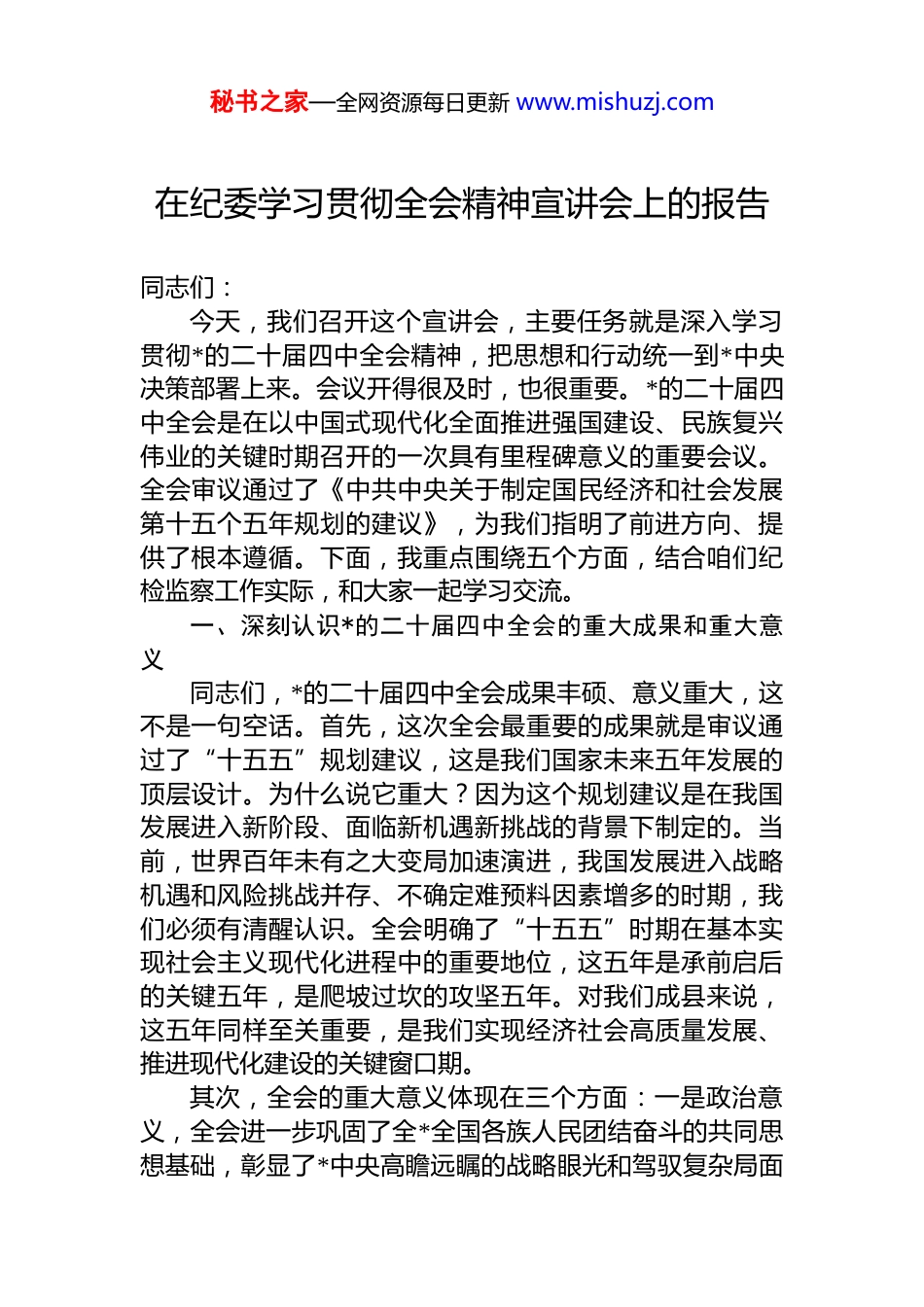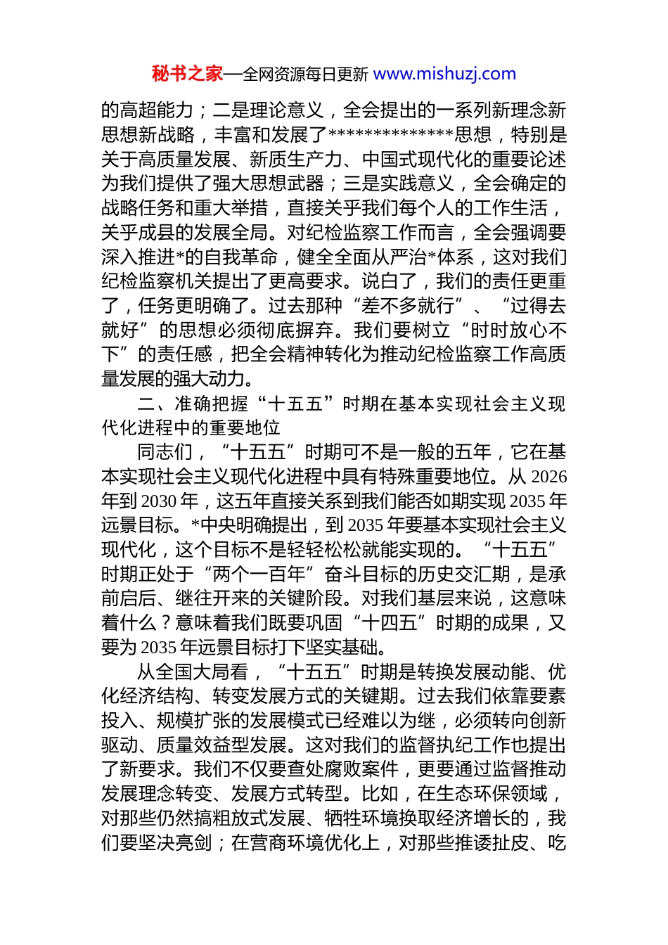 秘书之家—全网资源每日更新 www.mishuzj.com在纪委学习贯彻全会精神宣讲会上的报告同志们:今天,我们召开这个宣讲会,主要任务就是深入学习贯彻*的二十届四中全会精神,把思想和行动统一到*中央决策部署上来。会议开得很及时,也很重要。*的二十届四中全会是在以中国式现代化全面推进强国建设、民族复兴伟业的关键时期召开的一次具有里程碑意义的重要会议。全会审议通过了《中共中央关于制定国民经济和社会发展第十五个五年规划的建议》,为我们指明了前进方向、提供了根本遵循。下面,我重点围绕五个方面,结合咱们纪检监察工作实际,和大家一起学习交流。一、深刻认识*的二十届四中全会的重大成果和重大意义同志们,*的二十届四中全会成果丰硕、意义重大,这不是一句空话。首先,这次全会最重要的成果就是审议通过了“十五五”规划建议,这是我们国家未来五年发展的顶层设计。为什么说它重大?因为这个规划建议是在我国发展进入新阶段、面临新机遇新挑战的背景下制定的。当前,世界百年未有之大变局加速演进,我国发展进入战略机遇和风险挑战并存、不确定难预料因素增多的时期,我们必须有清醒认识。全会明确了“十五五”时期在基本实现社会主义现代化进程中的重要地位,这五年是承前启后的关键五年,是爬坡过坎的攻坚五年。对我们成县来说,这五年同样至关重要,是我们实现经济社会高质量发展、推进现代化建设的关键窗口期。其次,全会的重大意义体现在三个方面:一是政治意义,全会进一步巩固了全*全国各族人民团结奋斗的共同思想基础,彰显了*中央高瞻远瞩的战略眼光和驾驭复杂局面秘书之家—全网资源每日更新 www.mishuzj.com的高超能力;二是理论意义,全会提出的一系列新理念新思想新战略,丰富和发展了**************思想,特别是关于高质量发展、新质生产力、中国式现代化的重要论述为我们提供了强大思想武器;三是实践意义,全会确定的战略任务和重大举措,直接关乎我们每个人的工作生活,关乎成县的发展全局。对纪检监察工作而言,全会强调要深入推进*的自我革命,健全全面从严治*体系,这对我们纪检监察机关提出了更高要求。说白了,我们的责任更重了,任务更明确了。过去那种“差不多就行”、“过得去就好”的思想必须彻底摒弃。我们要树立“时时放心不下”的责任感,把全会精神转化为推动纪检监察工作高质量发展的强大动力。二、准确把握“十五五”时期在基本实现社会主义现代化进程中的重要地位同志们,“十五五”时期可不是一般的五年,它在基本实现社会主义现代化进程中具有特殊重要地位。从 2026年到 2030 年,这五年直接关系到我们能否如期实现 2035 年远景目标。*中央明确提出,到 2035 年要基本实现社会主义现代化,这个目标不是轻轻松松就能实现的。“十五五”时期正处于“两个一百年”奋斗目标的历史交汇期,是承前启后、继往开来的关键阶段。对我们基层来说,这意味着什么?意味着我们既要巩固“十四五”时期的成果,又要为 2035 年远景目标打下坚实基础。从全国大局看,“十五五”时期是转换发展动能、优化经济结构、转变发展方式的关键期。过去我们依靠要素投入、规模扩张的发展模式已经难以为继,必须转向创新驱动、质量效益型发展。这对我们的监督执纪工作也提出了新要求。我们不仅要查处腐败案件,更要通过监督推动发展理念转变、发展方式转型。比如,在生态环保领域,对那些仍然搞粗放式发展、牺牲环境换取经济增长的,我们要坚决亮剑;在营商环境优化上,对那些推诿扯皮、吃秘书之家—全网资源每日更新 www.mishuzj.com拿卡要的,我们要严肃问责。这几年成县的发展大家有目共睹,2023 年全县接待游客 474 万人次,旅游综合收入达到 28.3 亿元,同比增长 15.6%。这些成绩来之不易,但对照高质量发展要求,我们还有差距。“十五五”期间,全县经济增速要保持在 8%以上,旅游人数要突破 800 万人次,这些目标不是喊出来的,是干出来的,更需要我们纪检监察系统保驾护航。我们要紧紧围绕这些目标,找准监督的切入点、着力点,确保县委县政府的决策部署不折不扣落到实处。三、深刻领会“十五五”时期经济社会发展的指导方针和主...