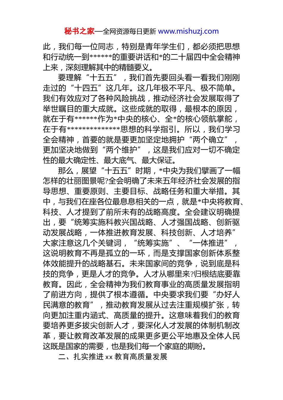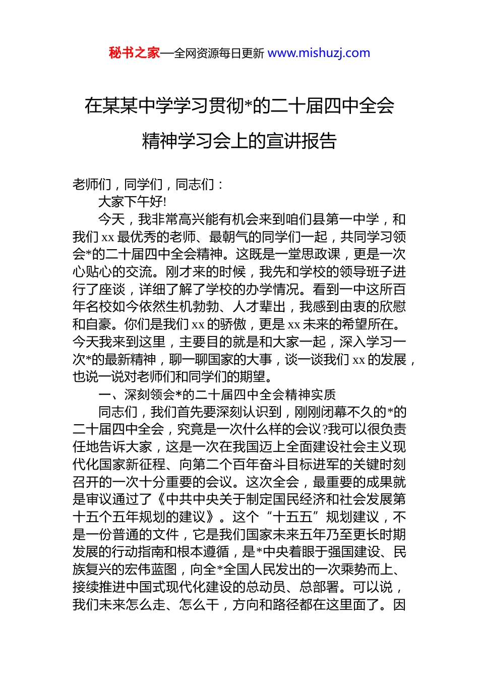 秘书之家—全网资源每日更新 www.mishuzj.com在某某中学学习贯彻*的二十届四中全会精神学习会上的宣讲报告老师们,同学们,同志们:大家下午好!今天,我非常高兴能有机会来到咱们县第一中学,和我们 xx 最优秀的老师、最朝气的同学们一起,共同学习领会*的二十届四中全会精神。这既是一堂思政课,更是一次心贴心的交流。刚才来的时候,我先和学校的领导班子进行了座谈,详细了解了学校的办学情况。看到一中这所百年名校如今依然生机勃勃、人才辈出,我感到由衷的欣慰和自豪。你们是我们 xx 的骄傲,更是 xx 未来的希望所在。今天我来到这里,主要目的就是和大家一起,深入学习一次*的最新精神,聊一聊国家的大事,谈一谈我们 xx 的发展,也说一说对老师们和同学们的期望。一、深刻领会*的二十届四中全会精神实质同志们,我们首先要深刻认识到,刚刚闭幕不久的*的二十届四中全会,究竟是一次什么样的会议?我可以很负责任地告诉大家,这是一次在我国迈上全面建设社会主义现代化国家新征程、向第二个百年奋斗目标进军的关键时刻召开的一次十分重要的会议。这次全会,最重要的成果就是审议通过了《中共中央关于制定国民经济和社会发展第十五个五年规划的建议》。这个“十五五”规划建议,不是一份普通的文件,它是我们国家未来五年乃至更长时期发展的行动指南和根本遵循,是*中央着眼于强国建设、民族复兴的宏伟蓝图,向全*全国人民发出的一次乘势而上、接续推进中国式现代化建设的总动员、总部署。可以说,我们未来怎么走、怎么干,方向和路径都在这里面了。因秘书之家—全网资源每日更新 www.mishuzj.com此,我们每一位同志,特别是青年学生们,都必须把思想和行动统一到******的重要讲话和*的二十届四中全会精神上来,深刻理解其中的精髓要义。要理解“十五五”,我们首先要回头看一看我们刚刚走过的“十四五”这几年。这几年极不平凡、极不简单。我们有效应对了各种风险挑战,推动经济社会发展取得了举世瞩目的重大成就。这些成就的取得,最根本的原因,就在于有******作为*中央的核心、全*的核心领航掌舵,在于有**************思想的科学指引。所以,我们学习全会精神,首要的就是要更加坚定地拥护“两个确立”,更加坚决地做到“两个维护”,这是我们应对一切不确定性的最大确定性、最大底气、最大保证。那么,展望“十五五”时期,*中央为我们擘画了一幅怎样的壮丽图景呢?全会明确了未来五年经济社会发展的指导思想、重要原则、主要目标、战略任务和重大举措。其中,与我们在座各位最息息相关的一点,就是*中央将教育、科技、人才提到了前所未有的战略高度。全会建议明确提出,要“统筹实施科教兴国战略、人才强国战略、创新驱动发展战略,一体推进教育发展、科技创新、人才培养”大家注意这几个关键词,“统筹实施”、“一体推进”,这说明教育不再是孤立的一环,而是支撑国家创新体系整体效能提升的战略基石。未来国家间的竞争,说到底是科技的竞争,更是人才的竞争。人才从哪里来?归根结底要靠教育。因此,全会精神为我们教育事业的高质量发展指明了前进方向,提供了根本遵循。中央要求我们要“办好人民满意的教育”,推动教育发展从过去注重规模扩张,转向更加注重内涵式、高质量的提升。这意味着我们的教育要培养更多拔尖创新人才,要深化人才发展的体制机制改革,要让教育改革发展的成果更多更公平地惠及全体人民这既是国家的需要,也是我们每一个家庭的期盼。二、扎实推进 xx 教育高质量发展秘书之家—全网资源每日更新 www.mishuzj.com说了国家的大政方针,我们再回过头来看看咱们 xx 自己。近年来,县委、县政府始终把教育摆在优先发展的战略地位,这绝不是一句空话。我们严格落实了上级关于教育经费“两个只增不减”的要求,也就是保证对教育的财政拨款的增长要高于财政经常性收入的增长,保证在校学生人均教育经费要逐年增长。真金白银的投入,换来的是我们教育面貌的焕然一新。大家可能也感受到了,这几年我们累计投入了 3.9 亿元,新建、改建和扩建了 31 个教育项目。比如说,总投资 1.3 亿元新建的县第四小学,设置了48 个教学班,能容纳...