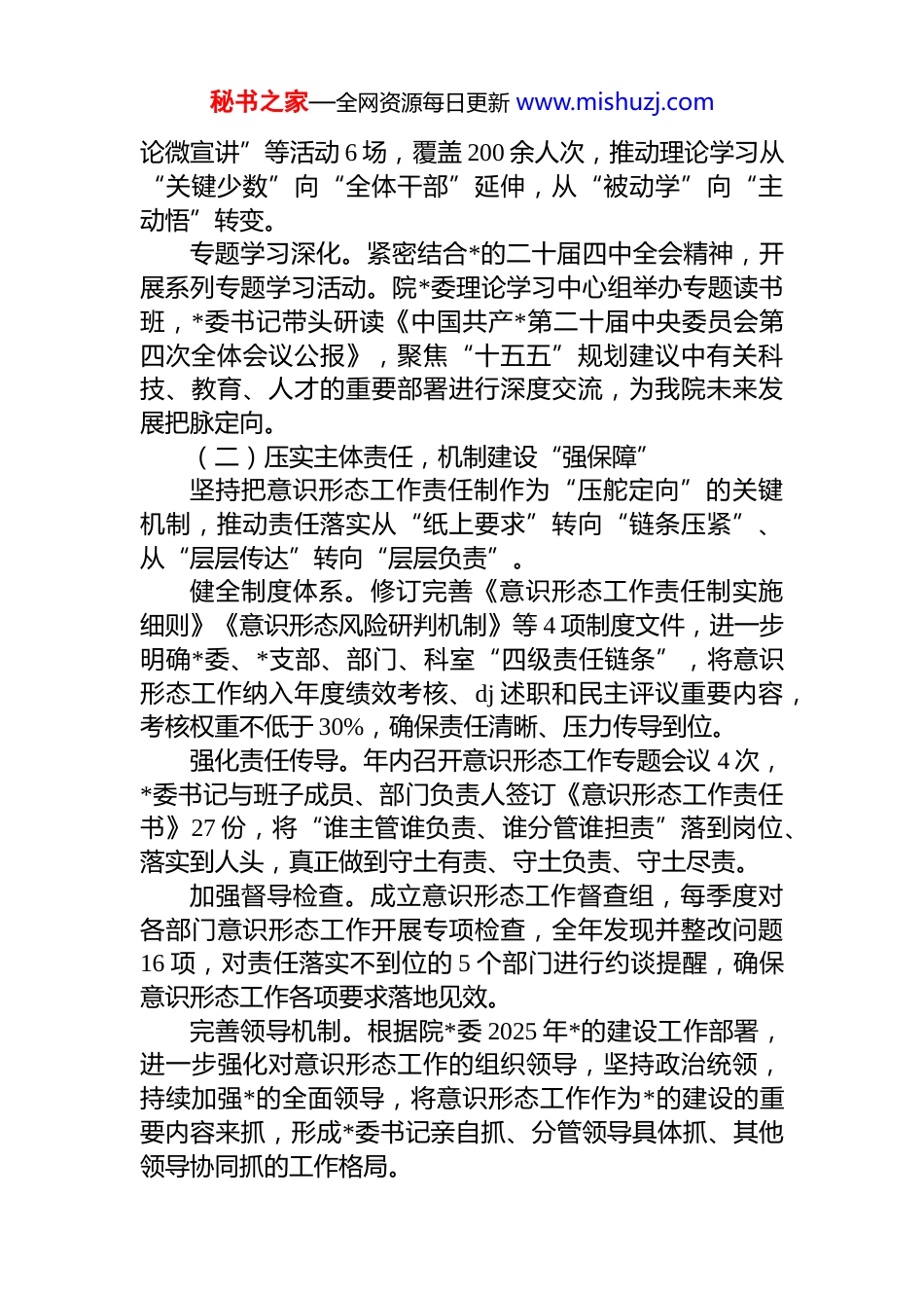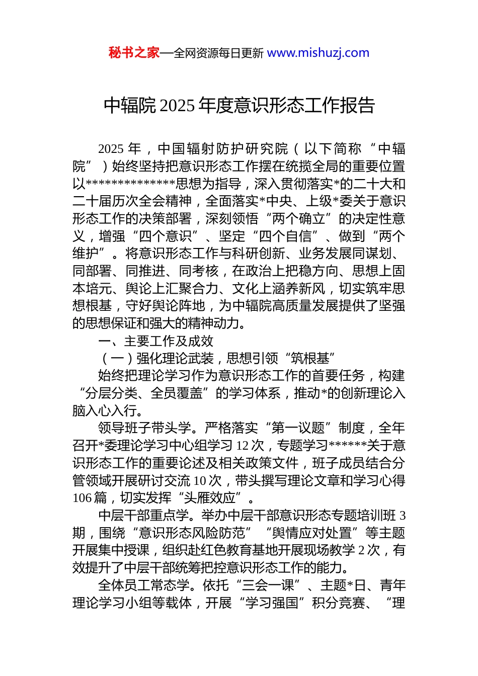 秘书之家—全网资源每日更新 www.mishuzj.com中辐院 2025 年度意识形态工作报告2025 年,中国辐射防护研究院(以下简称“中辐院”)始终坚持把意识形态工作摆在统揽全局的重要位置以**************思想为指导,深入贯彻落实*的二十大和二十届历次全会精神,全面落实*中央、上级*委关于意识形态工作的决策部署,深刻领悟“两个确立”的决定性意义,增强“四个意识”、坚定“四个自信”、做到“两个维护”。将意识形态工作与科研创新、业务发展同谋划、同部署、同推进、同考核,在政治上把稳方向、思想上固本培元、舆论上汇聚合力、文化上涵养新风,切实筑牢思想根基,守好舆论阵地,为中辐院高质量发展提供了坚强的思想保证和强大的精神动力。一、主要工作及成效(一)强化理论武装,思想引领“筑根基”始终把理论学习作为意识形态工作的首要任务,构建“分层分类、全员覆盖”的学习体系,推动*的创新理论入脑入心入行。领导班子带头学。严格落实“第一议题”制度,全年召开*委理论学习中心组学习 12 次,专题学习******关于意识形态工作的重要论述及相关政策文件,班子成员结合分管领域开展研讨交流 10 次,带头撰写理论文章和学习心得106 篇,切实发挥“头雁效应”。中层干部重点学。举办中层干部意识形态专题培训班 3期,围绕“意识形态风险防范”“舆情应对处置”等主题开展集中授课,组织赴红色教育基地开展现场教学 2 次,有效提升了中层干部统筹把控意识形态工作的能力。全体员工常态学。依托“三会一课”、主题*日、青年理论学习小组等载体,开展“学习强国”积分竞赛、“理秘书之家—全网资源每日更新 www.mishuzj.com论微宣讲”等活动 6 场,覆盖 200 余人次,推动理论学习从“关键少数”向“全体干部”延伸,从“被动学”向“主动悟”转变。专题学习深化。紧密结合*的二十届四中全会精神,开展系列专题学习活动。院*委理论学习中心组举办专题读书班,*委书记带头研读《中国共产*第二十届中央委员会第四次全体会议公报》,聚焦“十五五”规划建议中有关科技、教育、人才的重要部署进行深度交流,为我院未来发展把脉定向。(二)压实主体责任,机制建设“强保障”坚持把意识形态工作责任制作为“压舵定向”的关键机制,推动责任落实从“纸上要求”转向“链条压紧”、从“层层传达”转向“层层负责”。健全制度体系。修订完善《意识形态工作责任制实施细则》《意识形态风险研判机制》等 4 项制度文件,进一步明确*委、*支部、部门、科室“四级责任链条”,将意识形态工作纳入年度绩效考核、dj 述职和民主评议重要内容,考核权重不低于 30%,确保责任清晰、压力传导到位。强化责任传导。年内召开意识形态工作专题会议 4 次,*委书记与班子成员、部门负责人签订《意识形态工作责任书》27 份,将“谁主管谁负责、谁分管谁担责”落到岗位、落实到人头,真正做到守土有责、守土负责、守土尽责。加强督导检查。成立意识形态工作督查组,每季度对各部门意识形态工作开展专项检查,全年发现并整改问题16 项,对责任落实不到位的 5 个部门进行约谈提醒,确保意识形态工作各项要求落地见效。完善领导机制。根据院*委 2025 年*的建设工作部署,进一步强化对意识形态工作的组织领导,坚持政治统领,持续加强*的全面领导,将意识形态工作作为*的建设的重要内容来抓,形成*委书记亲自抓、分管领导具体抓、其他领导协同抓的工作格局。秘书之家—全网资源每日更新 www.mishuzj.com(三)守好舆论阵地,宣传引导“聚合力”坚持正面宣传为主基调,统筹管理各类宣传阵地,围绕中心工作开展正面宣传,营造积极向上的舆论氛围。加强内部阵地建设。持续优化单位官网、微信公众号、宣传栏等载体内容,全年发布政策解读、工作动态、先进典型等稿件 77 篇,其中 14 篇被上级媒体转载,微信公众号关注人数增长 51%,形成“内容有温度、传播有力度、展示有风度”的对外形象。做好对外宣传工作。与地方主流媒体建立合作机制,围绕院重点项目、创新成果、公益活动等主题,推出专题报道 16 篇,有效扩大中辐院工作的辐射力、影响力和认同度,展示国家战略科技力量的...