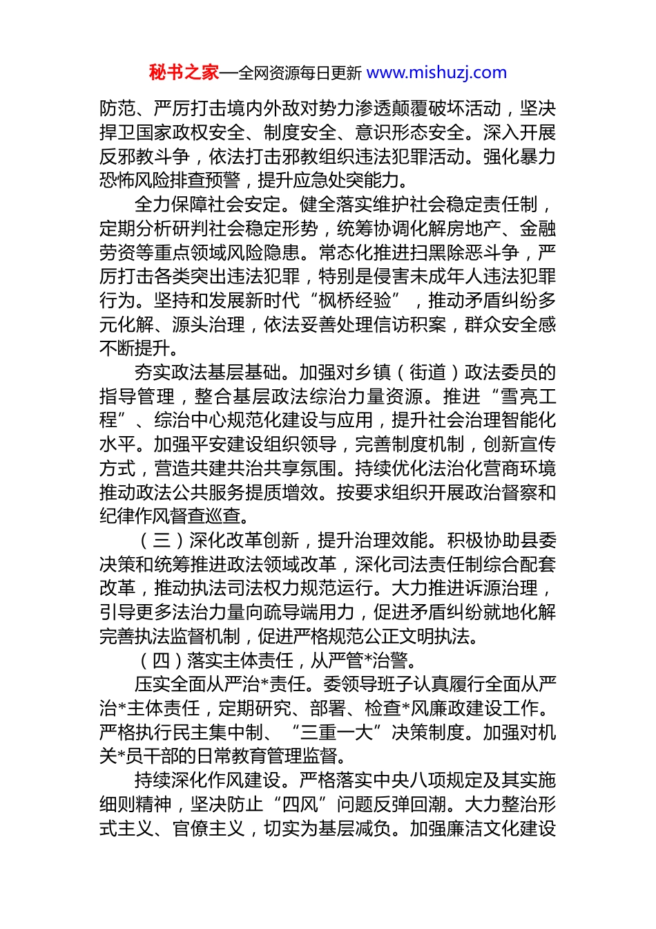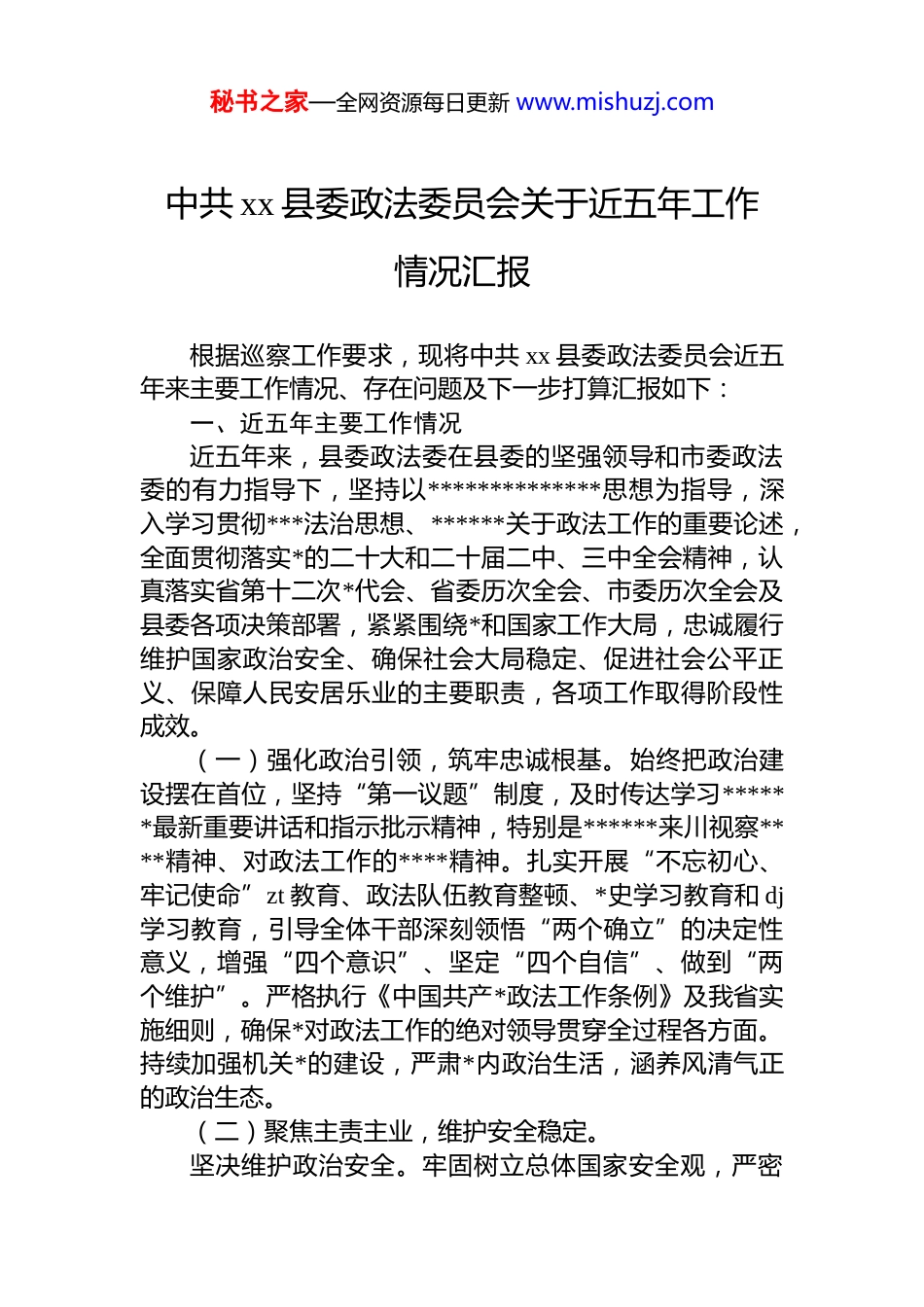 秘书之家—全网资源每日更新 www.mishuzj.com中共 xx 县委政法委员会关于近五年工作情况汇报根据巡察工作要求,现将中共 xx 县委政法委员会近五年来主要工作情况、存在问题及下一步打算汇报如下:一、近五年主要工作情况近五年来,县委政法委在县委的坚强领导和市委政法委的有力指导下,坚持以**************思想为指导,深入学习贯彻***法治思想、******关于政法工作的重要论述,全面贯彻落实*的二十大和二十届二中、三中全会精神,认真落实省第十二次*代会、省委历次全会、市委历次全会及县委各项决策部署,紧紧围绕*和国家工作大局,忠诚履行维护国家政治安全、确保社会大局稳定、促进社会公平正义、保障人民安居乐业的主要职责,各项工作取得阶段性成效。(一)强化政治引领,筑牢忠诚根基。始终把政治建设摆在首位,坚持“第一议题”制度,及时传达学习******最新重要讲话和指示批示精神,特别是******来川视察****精神、对政法工作的****精神。扎实开展“不忘初心、牢记使命”zt 教育、政法队伍教育整顿、*史学习教育和 dj学习教育,引导全体干部深刻领悟“两个确立”的决定性意义,增强“四个意识”、坚定“四个自信”、做到“两个维护”。严格执行《中国共产*政法工作条例》及我省实施细则,确保*对政法工作的绝对领导贯穿全过程各方面。持续加强机关*的建设,严肃*内政治生活,涵养风清气正的政治生态。(二)聚焦主责主业,维护安全稳定。坚决维护政治安全。牢固树立总体国家安全观,严密秘书之家—全网资源每日更新 www.mishuzj.com防范、严厉打击境内外敌对势力渗透颠覆破坏活动,坚决捍卫国家政权安全、制度安全、意识形态安全。深入开展反邪教斗争,依法打击邪教组织违法犯罪活动。强化暴力恐怖风险排查预警,提升应急处突能力。全力保障社会安定。健全落实维护社会稳定责任制,定期分析研判社会稳定形势,统筹协调化解房地产、金融劳资等重点领域风险隐患。常态化推进扫黑除恶斗争,严厉打击各类突出违法犯罪,特别是侵害未成年人违法犯罪行为。坚持和发展新时代“枫桥经验”,推动矛盾纠纷多元化解、源头治理,依法妥善处理信访积案,群众安全感不断提升。夯实政法基层基础。加强对乡镇(街道)政法委员的指导管理,整合基层政法综治力量资源。推进“雪亮工程”、综治中心规范化建设与应用,提升社会治理智能化水平。加强平安建设组织领导,完善制度机制,创新宣传方式,营造共建共治共享氛围。持续优化法治化营商环境推动政法公共服务提质增效。按要求组织开展政治督察和纪律作风督查巡查。(三)深化改革创新,提升治理效能。积极协助县委决策和统筹推进政法领域改革,深化司法责任制综合配套改革,推动执法司法权力规范运行。大力推进诉源治理,引导更多法治力量向疏导端用力,促进矛盾纠纷就地化解完善执法监督机制,促进严格规范公正文明执法。(四)落实主体责任,从严管*治警。压实全面从严治*责任。委领导班子认真履行全面从严治*主体责任,定期研究、部署、检查*风廉政建设工作。严格执行民主集中制、“三重一大”决策制度。加强对机关*员干部的日常教育管理监督。持续深化作风建设。严格落实中央八项规定及其实施细则精神,坚决防止“四风”问题反弹回潮。大力整治形式主义、官僚主义,切实为基层减负。加强廉洁文化建设秘书之家—全网资源每日更新 www.mishuzj.com引导干部知敬畏、存戒惧、守底线。加强干部队伍建设。坚持*管干部原则,树立正确选人用人导向,严格按程序选拔任用干部。加强干部教育培训和实践锻炼,提升履职能力。强化干部日常管理监督,严格执行个人有关事项报告制度。五年来,我县社会大局持续保持和谐稳定,政法各项工作在围绕中心、服务大局中取得了新进展。这些成绩的取得,根本在于县委的正确领导和市委政法委的精心指导得益于全体政法干部的共同努力和社会各界的支持。同时我们也清醒地认识到,工作中还存在一些不容忽视的问题和短板。二、存在问题对照巡察要求,结合自查自纠和群众反映,我们深刻反思,主要存在以下突出问题:(一)在学懂弄通做实**************思想,贯彻落实*中央决策部署和省委、市委、县委工作...
