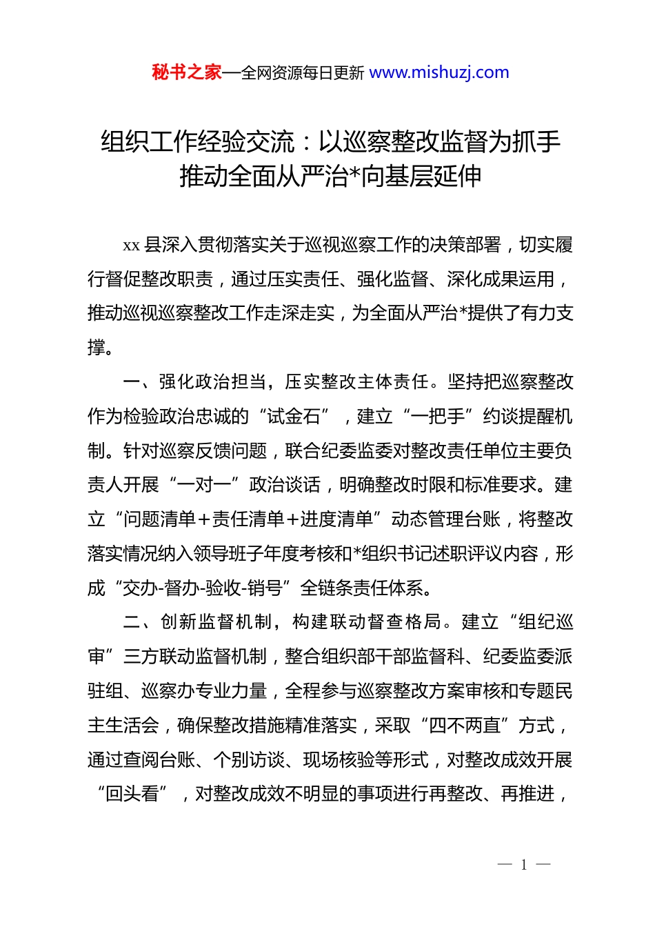 秘书之家—全网资源每日更新 www.mishuzj.com组织工作经验交流:以巡察整改监督为抓手推动全面从严治*向基层延伸xx 县深入贯彻落实关于巡视巡察工作的决策部署,切实履行督促整改职责,通过压实责任、强化监督、深化成果运用,推动巡视巡察整改工作走深走实,为全面从严治*提供了有力支撑。一、强化政治担当,压实整改主体责任。坚持把巡察整改作为检验政治忠诚的“试金石”,建立“一把手”约谈提醒机制。针对巡察反馈问题,联合纪委监委对整改责任单位主要负责人开展“一对一”政治谈话,明确整改时限和标准要求。建立“问题清单+责任清单+进度清单”动态管理台账,将整改落实情况纳入领导班子年度考核和*组织书记述职评议内容,形成“交办-督办-验收-销号”全链条责任体系。二、创新监督机制,构建联动督查格局。建立“组纪巡审”三方联动监督机制,整合组织部干部监督科、纪委监委派驻组、巡察办专业力量,全程参与巡察整改方案审核和专题民主生活会,确保整改措施精准落实,采取“四不两直”方式,通过查阅台账、个别访谈、现场核验等形式,对整改成效开展“回头看”,对整改成效不明显的事项进行再整改、再推进,— 1 —秘书之家—全网资源每日更新 www.mishuzj.com有效提升整改成效。2024 年巡察移交涉及*的组织路线问题整改完成率为 100%。三、强化结果运用,提升整改监督质效。将巡视巡察整改纳入日常监督重点,依托组工干部包乡联村促支部,通过专项检查、跟踪督办等方式,对巡察移交的问题开展专项监督,重点检查整改过程中是否坚持好干部标准、严格履行程序,确保整改不走过场。通过梳理共性问题,推动未巡先改。将巡察结果作为干部选拔任用、职级晋升的重要参考依据,强化巡察成果在干部管理中的运用。— 2 —