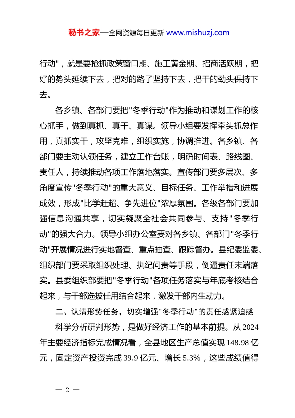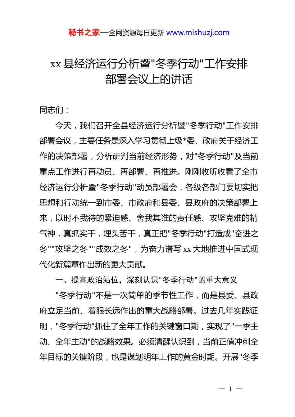 秘书之家—全网资源每日更新 www.mishuzj.comxx 县经济运行分析暨"冬季行动"工作安排部署会议上的讲话同志们:今天,我们召开全县经济运行分析暨"冬季行动"工作安排部署会议,主要任务是深入学习贯彻上级*委、政府关于经济工作的决策部署,分析研判当前经济形势,对"冬季行动"及当前重点工作进行再动员、再部署、再推进。刚刚收听收看了全市经济运行分析暨"冬季行动"动员部署会,各级各部门要切实把思想和行动统一到市委、市政府和县委、县政府的决策部署上来,以时不我待的紧迫感、舍我其谁的责任感、攻坚克难的精气神,真抓实干,埋头苦干,真正把"冬季行动"打造成"奋进之冬""攻坚之冬""成效之冬",为奋力谱写 xx 大地推进中国式现代化新篇章作出新的更大贡献。一、提高政治站位,深刻认识"冬季行动"的重大意义"冬季行动"不是一次简单的季节性工作,而是县委、县政府立足当前、着眼长远作出的重大战略部署。过去几年实践证明,"冬季行动"抓住了全年工作的关键窗口期,实现了"一季主动、全年主动"的战略效果。必须清醒认识到,当前正值冲刺全年目标的关键阶段,也是谋划明年工作的黄金时期。开展"冬季— 1 —秘书之家—全网资源每日更新 www.mishuzj.com行动",就是要抢抓政策窗口期、施工黄金期、招商活跃期,把好的势头延续下去,把对的路子坚持下去,把干的劲头保持下去。各乡镇、各部门要把"冬季行动"作为推动和谋划工作的核心抓手,做到真抓、真干、真谋。领导小组要发挥牵头抓总作用,真抓实干,攻坚克难,组织实施,协调推进。各乡镇、各部门要主动认领任务,建立工作台账,明确时间表、路线图、责任人,持续推动各项工作落地落实。宣传部门要多层次、多角度宣传"冬季行动"的重大意义、目标任务、工作举措和进展成效,形成"比学赶超、争先进位"浓厚氛围。各级各部门要加强信息沟通共享,切实凝聚全社会共同参与、支持"冬季行动"的强大合力。领导小组办公室要对各乡镇、各部门"冬季行动"开展情况进行实地督查、重点抽查、跟踪督办。县纪委监委、组织部门要采取组织处理、执纪问责等手段,倒逼责任末端落实。县委组织部要把"冬季行动"各项任务落实与年底考核结合起来,与干部选拔任用结合起来,激发干部内生动力。二、认清形势任务,切实增强"冬季行动"的责任感紧迫感科学分析研判形势,是做好经济工作的基本前提。从 2024年主要经济指标完成情况看,全县地区生产总值实现 148.98 亿元,固定资产投资完成 39.9 亿元、增长 5.3%,这些成绩值得— 2 —秘书之家—全网资源每日更新 www.mishuzj.com肯定。但也要清醒看到,规模以上工业增加值下降 25.47%,一般公共预算收入完成 4.12 亿元、下降 34.3%,经济运行面临较大压力。这一组组数据背后,反映出我们工作中还存在不少短板弱项:部分重点项目推进缓慢,产业转型步伐不快,财政收支矛盾突出,营商环境仍需优化,一些干部面对困难存在畏难情绪、工作标准不高、落实力度不够。当前,距离年底仅剩一个月时间,完成全年目标任务已经到了最吃劲、最紧要的关头。同时,2026 年工作谋划也已提上日程,各项工作千头万绪、任务繁重。在这个关键时刻开展"冬季行动",就是要集中时间、集中精力、集中力量,打好收官战、开好新局面。必须破除"冬季歇歇脚、等等看"的惯性思维,树立"冬季大干、冬季大上"的鲜明导向,以战斗姿态投入工作,以攻坚精神破解难题,确保全年工作圆满收官、明年工作高点起步。三、聚焦重点任务,全力打好"冬季行动"攻坚战"冬季行动"的成效,关键看落实。必须聚焦经济运行、项目建设、安全生产、开发区建设、招商引资、生态环保六大任务,精准发力、综合施策。(一)全力以赴抓好经济运行,确保完成全年目标。要紧盯"2025 年收好官、2026 年开好局"目标,坚持目标导向、问题— 3 —秘书之家—全网资源每日更新 www.mishuzj.com导向、结果导向。对主要经济指标逐项分析研判,找准增长点、深挖潜力点、攻克困难点。特别要关注工业增加值、财税收入等薄弱环节,采取超常规措施,力争最好结果。要加强经济运行监测调度,实行"日监测、周调度、月分析",及时发现解决问题。要深入重点行业、...