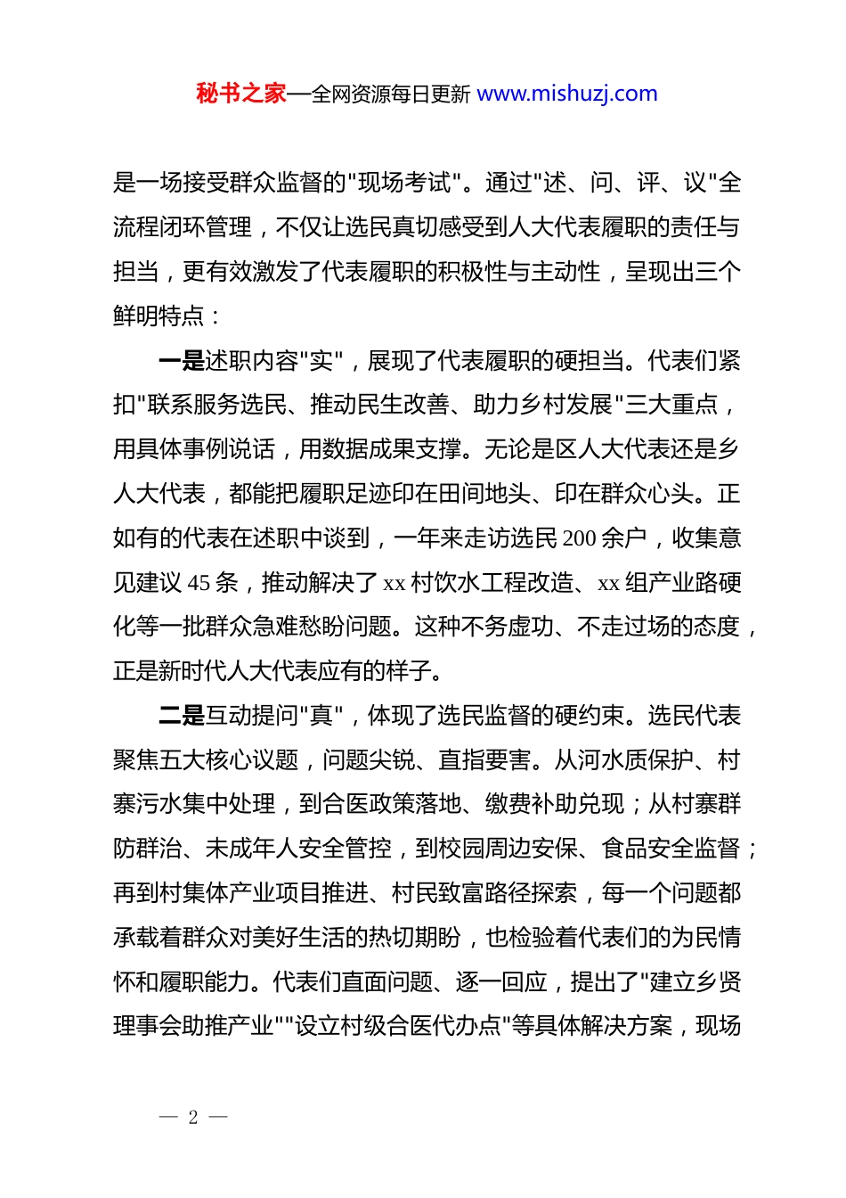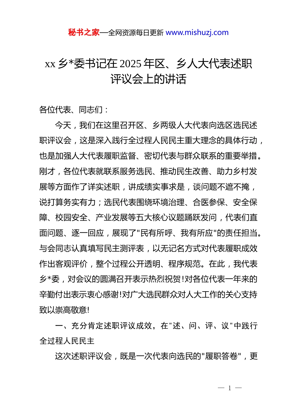 秘书之家—全网资源每日更新 www.mishuzj.comxx 乡*委书记在 2025 年区、乡人大代表述职评议会上的讲话各位代表、同志们:今天,我们在这里召开区、乡两级人大代表向选区选民述职评议会,这是深入践行全过程人民民主重大理念的具体行动,也是加强人大代表履职监督、密切代表与群众联系的重要举措。刚才,各位代表就联系服务选民、推动民生改善、助力乡村发展等方面作了详实述职,讲成绩实事求是,谈问题不遮不掩,说打算务实有力;选民代表围绕环境治理、合医参保、安全保障、校园安全、产业发展等五大核心议题踊跃发问,代表们直面问题、逐一回应,展现了"民有所呼、我有所应"的责任担当。与会同志认真填写民主测评表,以无记名方式对代表履职成效作出客观评价,整个过程公开透明、程序规范。在此,我代表乡*委,对会议的圆满召开表示热烈祝贺!对各位代表一年来的辛勤付出表示衷心感谢!对广大选民群众对人大工作的关心支持致以崇高敬意!一、充分肯定述职评议成效,在"述、问、评、议"中践行全过程人民民主这次述职评议会,既是一次代表向选民的"履职答卷",更— 1 —秘书之家—全网资源每日更新 www.mishuzj.com是一场接受群众监督的"现场考试"。通过"述、问、评、议"全流程闭环管理,不仅让选民真切感受到人大代表履职的责任与担当,更有效激发了代表履职的积极性与主动性,呈现出三个鲜明特点:一是述职内容"实",展现了代表履职的硬担当。代表们紧扣"联系服务选民、推动民生改善、助力乡村发展"三大重点,用具体事例说话,用数据成果支撑。无论是区人大代表还是乡人大代表,都能把履职足迹印在田间地头、印在群众心头。正如有的代表在述职中谈到,一年来走访选民 200 余户,收集意见建议 45 条,推动解决了 xx 村饮水工程改造、xx 组产业路硬化等一批群众急难愁盼问题。这种不务虚功、不走过场的态度,正是新时代人大代表应有的样子。二是互动提问"真",体现了选民监督的硬约束。选民代表聚焦五大核心议题,问题尖锐、直指要害。从河水质保护、村寨污水集中处理,到合医政策落地、缴费补助兑现;从村寨群防群治、未成年人安全管控,到校园周边安保、食品安全监督;再到村集体产业项目推进、村民致富路径探索,每一个问题都承载着群众对美好生活的热切期盼,也检验着代表们的为民情怀和履职能力。代表们直面问题、逐一回应,提出了"建立乡贤理事会助推产业""设立村级合医代办点"等具体解决方案,现场— 2 —秘书之家—全网资源每日更新 www.mishuzj.com答出了民生温度与履职力度。三是评议测评"严",彰显了民主政治的硬规矩。我们坚持客观公正原则,通过无记名投票方式对代表履职成效进行"优秀、称职、不称职"三级评价,让选民手中的选票真正成为衡量代表履职的"标尺"。这种"由谁产生、向谁负责、受谁监督"的制度设计,正是人民代表大会制度的本质要求,也是发展全过程人民民主的生动实践。二、清醒认识当前形势任务,在"五大议题"中找准履职发力点代表们、同志们,当前 xx 乡正处于巩固拓展脱贫攻坚成果同乡村振兴有效衔接的关键期,正处于推进基层治理体系和治理能力现代化的攻坚期。从述职和提问中可以看出,群众最关切、代表最关注的五大议题,恰恰是我们工作的重点、难点和着力点。第一,环境治理任重道远,需要持续用力、久久为功。近年来,我们通过农村"五治"工作,建成垃圾收集点 xx 个,完成户厕改造 xx 户,农村外运垃圾减量达 xx%,xx 河水质稳定在ⅲ类以上。但群众反映的污水管网覆盖不全、河道保洁长效机制不健全等问题仍然存在。代表们要持续跟进《xx 乡农村人居环境整治提升五年行动实施方案》,推动"治房、治水、治厕、— 3 —秘书之家—全网资源每日更新 www.mishuzj.com治垃圾、治风"走深走实,让绿水青山成为 xx 乡最靓丽的底色。第二,合医参保关乎民心,需要精准宣传、应保尽保。2025 年度我乡城乡居民医保参保率达 xx%,落实特殊困难群体参保资助 xx 人、金额 xx 万元。但仍有群众反映政策知晓率不高、异地报销不便等问题。代表们要发挥贴近群众优势,用好"院坝会""板凳会"等形式,把政策讲透、把程序讲清、把实惠...
