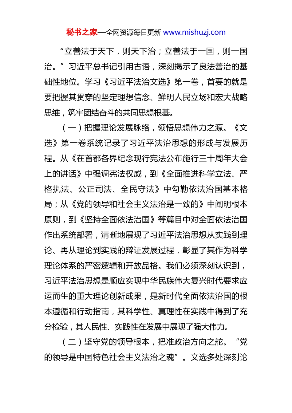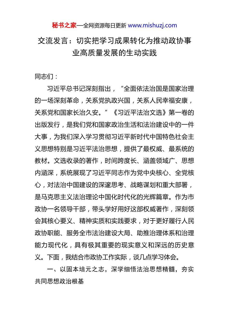 秘书之家—全网资源每日更新 www.mishuzj.com交流发言:切实把学习成果转化为推动政协事业高质量发展的生动实践 同志们:习近平总书记深刻指出,“全面依法治国是国家治理的一场深刻革命,关系党执政兴国,关系人民幸福安康,关系党和国家长治久安。”《习近平法治文选》第一卷的出版发行,是我们党和国家政治生活和法治建设中的一件大事,为我们深入学习贯彻习近平新时代中国特色社会主义思想特别是习近平法治思想,提供了最权威、最系统的教材。文选收录的著作,时间跨度长、涵盖领域广、思想内涵深,系统展现了习近平同志作为党中央核心、全党核心,对法治中国建设的深邃思考、战略谋划和重大部署,是马克思主义法治理论中国化时代化的光辉篇章。作为市政协一名领导干部,带头学好用好这部权威著作,深刻领会其核心要义、精神实质和实践要求,对于更好履行人民政协职能、服务全市法治建设大局、助推治理体系和治理能力现代化,具有极其重要的现实意义和深远的历史意义。下面,我结合市政协工作实际,谈几点学习体会。一、以固本培元之志,深学细悟法治思想精髓,夯实共同思想政治根基秘书之家—全网资源每日更新 www.mishuzj.com“立善法于天下,则天下治;立善法于一国,则一国治。”习近平总书记引用古语,深刻揭示了良法善治的基础性地位。学习《习近平法治文选》第一卷,首要的就是要把握其贯穿的坚定理想信念、鲜明人民立场和宏大战略思维,筑牢团结奋斗的共同思想根基。(一)把握理论发展脉络,领悟思想伟力之源。《文选》第一卷系统记录了习近平法治思想的形成与发展历程。从《在首都各界纪念现行宪法公布施行三十周年大会上的讲话》中强调宪法权威,到《全面推进科学立法、严格执法、公正司法、全民守法》中勾勒依法治国基本格局;从《党的领导和社会主义法治是一致的》中阐明根本原则,到《坚持全面依法治国》等篇目中对全面依法治国作出系统部署,清晰地展现了习近平法治思想从实践到理论、再从理论到实践的辩证发展过程,彰显了其作为科学理论体系的严密逻辑和开放品格。我们必须深刻认识到,习近平法治思想是顺应实现中华民族伟大复兴时代要求应运而生的重大理论创新成果,是新时代全面依法治国的根本遵循和行动指南,其科学性、真理性在实践中得到了充分检验,其人民性、实践性在发展中展现了强大伟力。(二)坚守党的领导根本,把准政治方向之舵。“党的领导是中国特色社会主义法治之魂”。文选多处深刻论秘书之家—全网资源每日更新 www.mishuzj.com述了党和法的关系这一核心问题。在《党的领导和社会主义法治是一致的》等篇目中,总书记旗帜鲜明地指出,社会主义法治必须坚持党的领导,党的领导必须依靠社会主义法治,二者是高度统一、相辅相成的。坚持党的领导,是社会主义法治的根本要求,是我国法治同西方资本主义国家法治最大的区别。市政协作为党领导下的政治组织,必须将坚持党的领导贯穿于履职尽责的全过程、各方面,不断提高政治判断力、政治领悟力、政治执行力,确保政协工作始终沿着正确政治方向前进,在法治轨道上助推党的路线方针政策和市委决策部署得到全面贯彻落实。(三)紧扣人民中心立场,筑牢履职为民之基。“法治建设要坚持以人民为中心”。文选通篇贯穿着鲜明的人民立场。在《促进社会公平正义是政法工作的核心价值追求》、《保障人民安居乐业是政法工作的根本目标》等篇目中,总书记反复强调,要把体现人民利益、反映人民愿望、维护人民权益、增进人民福祉落实到依法治国全过程。人民政协作为最广泛的爱国统一战线组织,本质上是做凝聚人心、汇聚力量的工作,必须始终站稳人民立场,将不断满足人民对民主、法治、公平、正义、安全、环境等方面日益增长的要求,作为政协履职的出发点和落脚点,通过协商议政、民主监督、提案信息等渠道,推动解秘书之家—全网资源每日更新 www.mishuzj.com决法治领域人民群众反映强烈的突出问题,让法治建设成果更多更公平惠及全体市民。二、以立柱架梁之功,紧密联系政协履职实际,提升服务法治建设效能“法者,治之端也。”习近平总书记强调,要“坚持在法治轨道上推进国家治理体系和治理能力现代化...