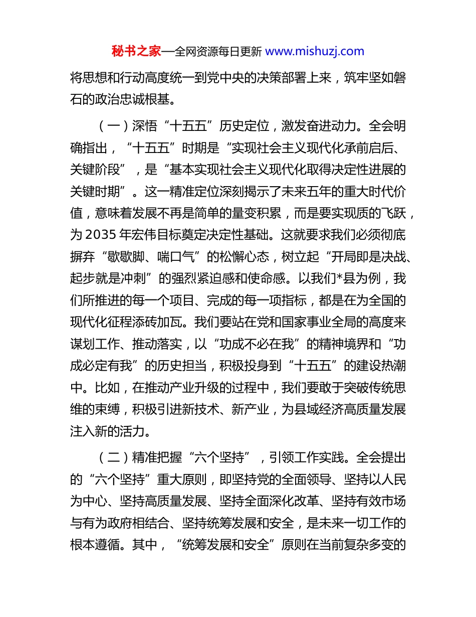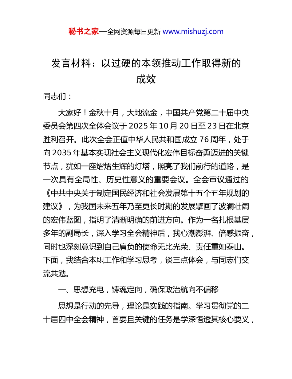 秘书之家—全网资源每日更新 www.mishuzj.com发言材料:以过硬的本领推动工作取得新的成效同志们:大家好!金秋十月,大地流金,中国共产党第二十届中央委员会第四次全体会议于 2025 年 10 月 20 日至 23 日在北京胜利召开。此次全会正值中华人民共和国成立 76 周年,处于向 2035 年基本实现社会主义现代化宏伟目标奋勇迈进的关键节点,犹如一座熠熠生辉的灯塔,照亮了我们前行的道路,是一次具有全局性、历史性意义的重要会议。全会审议通过的《中共中央关于制定国民经济和社会发展第十五个五年规划的建议》,为我国未来五年乃至更长时期的发展擘画了波澜壮阔的宏伟蓝图,指明了清晰明确的前进方向。作为一名扎根基层多年的副局长,深入学习全会精神后,我心潮澎湃、倍感振奋,同时也深刻意识到自己肩负的使命无比光荣、责任重如泰山。下面,我结合本职工作和学习思考,谈三点体会,与同志们交流共勉。一、思想充电,铸魂定向,确保政治航向不偏移思想是行动的先导,理论是实践的指南。学习贯彻党的二十届四中全会精神,首要且关键的任务是学深悟透其核心要义,秘书之家—全网资源每日更新 www.mishuzj.com将思想和行动高度统一到党中央的决策部署上来,筑牢坚如磐石的政治忠诚根基。(一)深悟“十五五”历史定位,激发奋进动力。全会明确指出,“十五五”时期是“实现社会主义现代化承前启后、关键阶段”,是“基本实现社会主义现代化取得决定性进展的关键时期”。这一精准定位深刻揭示了未来五年的重大时代价值,意味着发展不再是简单的量变积累,而是要实现质的飞跃,为 2035 年宏伟目标奠定决定性基础。这就要求我们必须彻底摒弃“歇歇脚、喘口气”的松懈心态,树立起“开局即是决战、起步就是冲刺”的强烈紧迫感和使命感。以我们*县为例,我们所推进的每一个项目、完成的每一项指标,都是在为全国的现代化征程添砖加瓦。我们要站在党和国家事业全局的高度来谋划工作、推动落实,以“功成不必在我”的精神境界和“功成必定有我”的历史担当,积极投身到“十五五”的建设热潮中。比如,在推动产业升级的过程中,我们要敢于突破传统思维的束缚,积极引进新技术、新产业,为县域经济高质量发展注入新的活力。(二)精准把握“六个坚持”,引领工作实践。全会提出的“六个坚持”重大原则,即坚持党的全面领导、坚持以人民为中心、坚持高质量发展、坚持全面深化改革、坚持有效市场与有为政府相结合、坚持统筹发展和安全,是未来一切工作的根本遵循。其中,“统筹发展和安全”原则在当前复杂多变的秘书之家—全网资源每日更新 www.mishuzj.com国内外环境下,具有极强的现实指导意义。结合*县的实际情况,在招商引资工作中,我们既要算好经济账,更要做好安全风险评估。不能只追求短期的经济效益,而忽视了潜在的安全隐患。例如,对于一些高污染、高风险的项目,我们要坚决予以拒绝,确保引进的项目既符合经济发展的需求,又能保障生态环境和人民群众的生命财产安全。在推进城镇建设时,我们既要追求速度规模,更要守住生态环保和生产安全底线。要注重城镇建设的可持续性,避免过度开发和资源浪费。在发展数字经济时,我们既要享受技术便利,更要防范数据安全和网络安全风险。加强对数字信息的保护,确保数字经济在安全稳定的环境中发展。只有时刻绷紧“发展”与“安全”这两根弦,我们才能确保发展的航船行稳致远。二、能力赋能,提质增效,推动工作水平再提升学习贯彻全会精神,不仅要在思想上武装自己,更要在能力上提升自己,以过硬的本领推动工作取得新的成效。(一)提升专业素养,适应发展需求。随着时代的发展和科技的进步,我们面临的工作任务越来越复杂,对专业素养的要求也越来越高。作为副局长,我要带头加强专业知识的学习,不断更新知识结构,提高业务水平。例如,在经济发展领域,要深入学习宏观经济政策、产业发展规律等知识,为制定科学合理的发展规划提供有力支撑。在生态环保方面,要了解最新秘书之家—全网资源每日更新 www.mishuzj.com的环保法规和技术标准,加强对环境问题的治理和监管。同时,要鼓励和引导全局干部职工加强学习,营造浓厚...