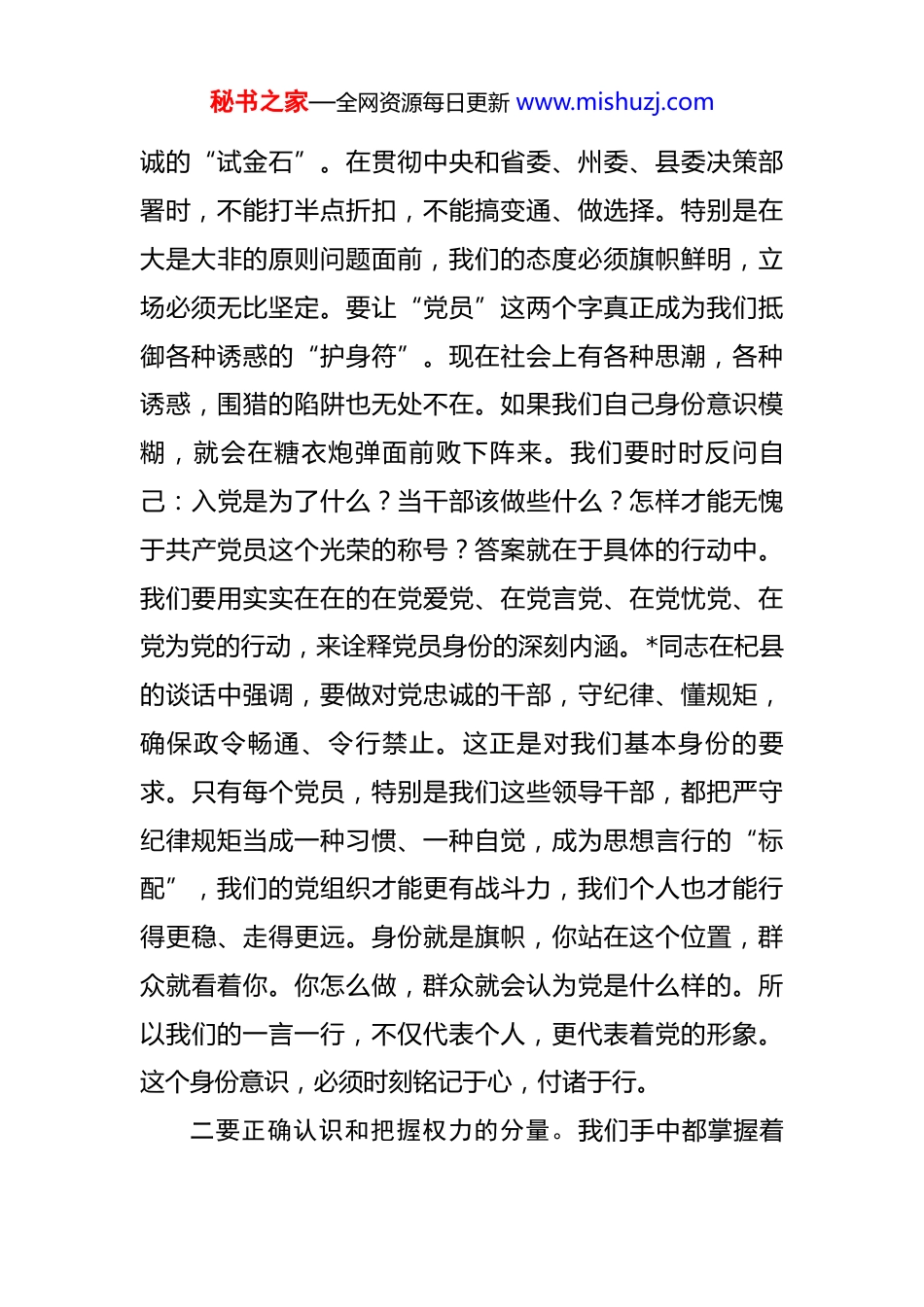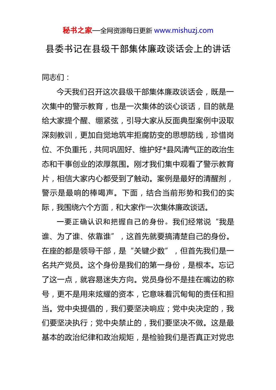 秘书之家—全网资源每日更新 www.mishuzj.com县委书记在县级干部集体廉政谈话会上的讲话 同志们:今天我们召开这次县级干部集体廉政谈话会,既是一次集中的警示教育,也是一次集体的谈心谈话,目的就是给大家提个醒、绷紧弦,引导大家从反面典型案例中汲取深刻教训,更加自觉地筑牢拒腐防变的思想防线,珍惜岗位、不负重托,共同巩固好、维护好*县风清气正的政治生态和干事创业的浓厚氛围。刚才我们集中观看了警示教育片,相信大家内心都受到了触动。案例是最好的清醒剂,警示是最响的棒喝声。下面,结合当前形势和我们的实际,我围绕六个方面,和大家作一次集体廉政谈话。一要正确认识和把握自己的身份。我们经常说“我是谁、为了谁、依靠谁”,这首先就要搞清楚自己的身份。在座的都是领导干部,是“关键少数”,但首先我们是一名共产党员。这个身份是我们的第一身份,是根本。忘记了这一点,就容易迷失方向。党员身份不是挂在嘴边的称号,更不是用来炫耀的资本,它意味着沉甸甸的责任和担当。党中央提倡的,我们要坚决响应;党中央决定的,我们要坚决执行;党中央禁止的,我们要坚决不做。这是最基本的政治纪律和政治规矩,是检验我们是否真正对党忠秘书之家—全网资源每日更新 www.mishuzj.com诚的“试金石”。在贯彻中央和省委、州委、县委决策部署时,不能打半点折扣,不能搞变通、做选择。特别是在大是大非的原则问题面前,我们的态度必须旗帜鲜明,立场必须无比坚定。要让“党员”这两个字真正成为我们抵御各种诱惑的“护身符”。现在社会上有各种思潮,各种诱惑,围猎的陷阱也无处不在。如果我们自己身份意识模糊,就会在糖衣炮弹面前败下阵来。我们要时时反问自己:入党是为了什么?当干部该做些什么?怎样才能无愧于共产党员这个光荣的称号?答案就在于具体的行动中。我们要用实实在在的在党爱党、在党言党、在党忧党、在党为党的行动,来诠释党员身份的深刻内涵。*同志在杞县的谈话中强调,要做对党忠诚的干部,守纪律、懂规矩,确保政令畅通、令行禁止。这正是对我们基本身份的要求。只有每个党员,特别是我们这些领导干部,都把严守纪律规矩当成一种习惯、一种自觉,成为思想言行的“标配”,我们的党组织才能更有战斗力,我们个人也才能行得更稳、走得更远。身份就是旗帜,你站在这个位置,群众就看着你。你怎么做,群众就会认为党是什么样的。所以我们的一言一行,不仅代表个人,更代表着党的形象。这个身份意识,必须时刻铭记于心,付诸于行。二要正确认识和把握权力的分量。我们手中都掌握着秘书之家—全网资源每日更新 www.mishuzj.com一定的权力。权力是双刃剑,用好了能为百姓谋福祉,用不好则会害人害己。权力的分量重如千钧,因为它来自人民。我们必须时刻清醒认识到,干部就是服务,权力就是责任。这个权力姓“公”不姓“私”,它是人民赋予的,是用来为人民谋利益的工具,绝不能异化为个人谋取私利的工具。我们要常怀敬畏之心,敬畏权力、慎用权力。这个敬畏,不是畏手畏脚,而是对权力运行的谨慎,是对人民赋予权力的尊重。要坚持为民用权,把群众的安危冷暖时刻放在心上,多做那些能让老百姓实实在在受益的事情,比如解决他们的就业、教育、医疗、养老等实实在在的困难。要坚持秉公用权,处理任何事情都要出以公心,一碗水端平,不偏不倚。要坚持依法用权,严格在法律和制度的框架内行使权力,决策要科学民主,过程要公开透明,自觉接受监督。*检察长在对新提拔干部的谈话中强调,要树立正确的“权力观”,牢记权力就是责任。我们要真正把*县群众期盼的事情,变成我们要干的事情;把我们正在干的事情,变成*县群众赞成支持的事情;把我们干成了的事情,变成惠及*县群众的事情。这是一个完整的过程,核心就是权为民所用、利为民所谋。要做到有权不搞特权,掌权不谋私利。权力本身具有扩张性和腐蚀性,如果缺乏有效的约束和监督,就像食物一样会“霉变”。防秘书之家—全网资源每日更新 www.mishuzj.com止“霉变”最好的方法,就是阳光用权,把权力关进制度的笼子里。我们要经常扪心自问,用权有没有出于公心?决策有没有考虑群众利益?效果有没有让...
