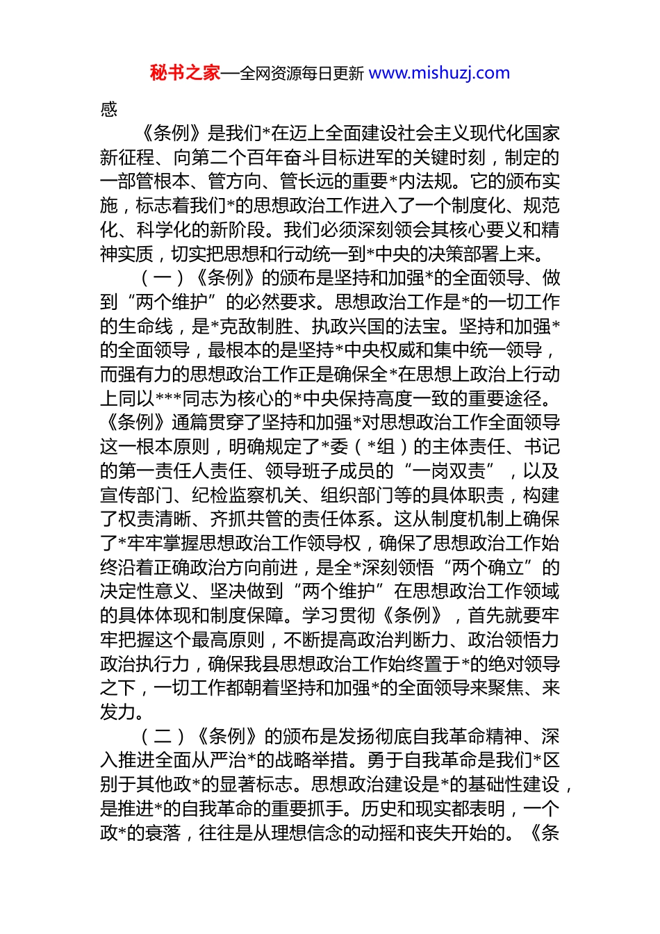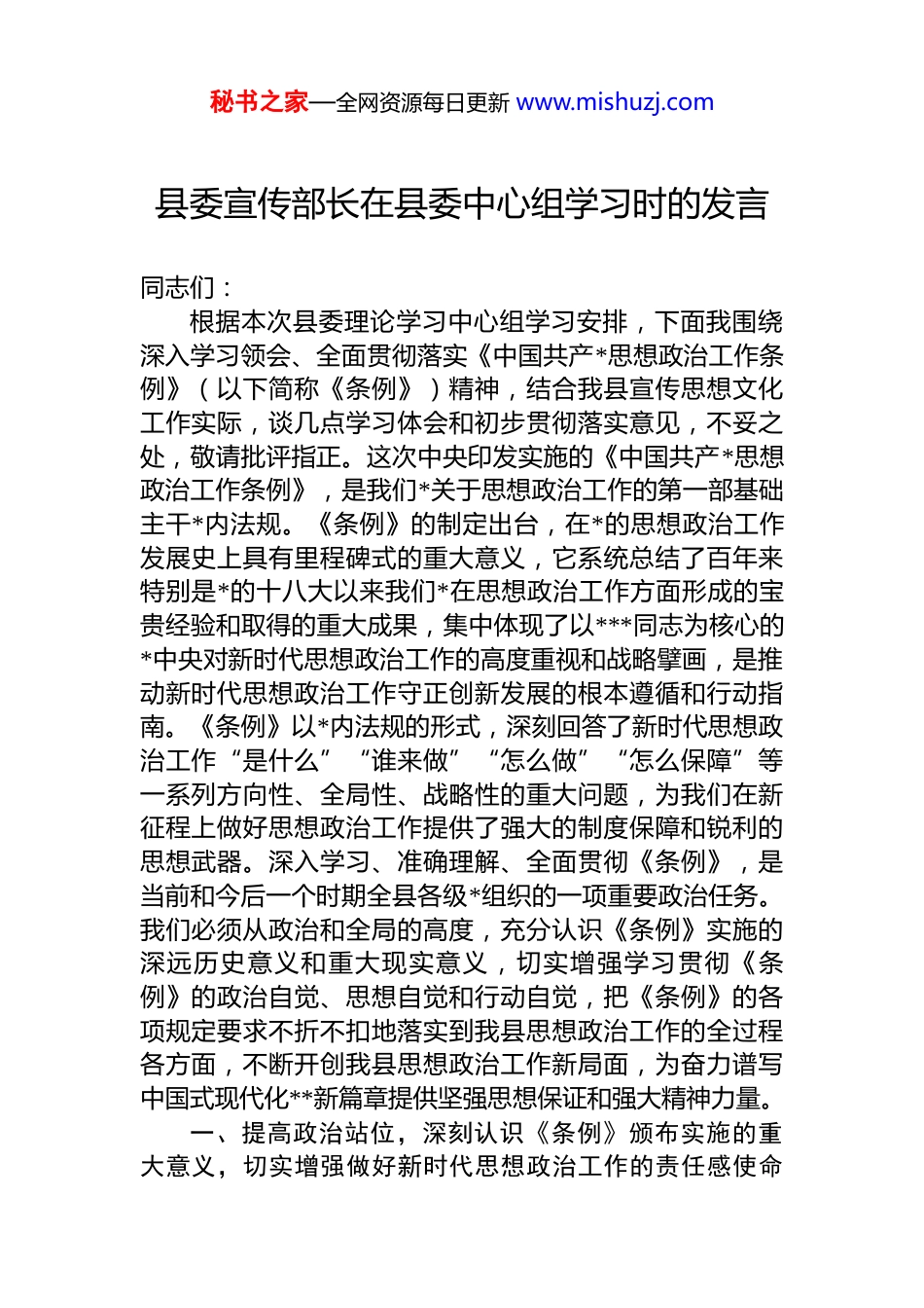 秘书之家—全网资源每日更新 www.mishuzj.com县委宣传部长在县委中心组学习时的发言同志们:根据本次县委理论学习中心组学习安排,下面我围绕深入学习领会、全面贯彻落实《中国共产*思想政治工作条例》(以下简称《条例》)精神,结合我县宣传思想文化工作实际,谈几点学习体会和初步贯彻落实意见,不妥之处,敬请批评指正。这次中央印发实施的《中国共产*思想政治工作条例》,是我们*关于思想政治工作的第一部基础主干*内法规。《条例》的制定出台,在*的思想政治工作发展史上具有里程碑式的重大意义,它系统总结了百年来特别是*的十八大以来我们*在思想政治工作方面形成的宝贵经验和取得的重大成果,集中体现了以***同志为核心的*中央对新时代思想政治工作的高度重视和战略擘画,是推动新时代思想政治工作守正创新发展的根本遵循和行动指南。《条例》以*内法规的形式,深刻回答了新时代思想政治工作“是什么”“谁来做”“怎么做”“怎么保障”等一系列方向性、全局性、战略性的重大问题,为我们在新征程上做好思想政治工作提供了强大的制度保障和锐利的思想武器。深入学习、准确理解、全面贯彻《条例》,是当前和今后一个时期全县各级*组织的一项重要政治任务。我们必须从政治和全局的高度,充分认识《条例》实施的深远历史意义和重大现实意义,切实增强学习贯彻《条例》的政治自觉、思想自觉和行动自觉,把《条例》的各项规定要求不折不扣地落实到我县思想政治工作的全过程各方面,不断开创我县思想政治工作新局面,为奋力谱写中国式现代化**新篇章提供坚强思想保证和强大精神力量。一、提高政治站位,深刻认识《条例》颁布实施的重大意义,切实增强做好新时代思想政治工作的责任感使命秘书之家—全网资源每日更新 www.mishuzj.com感《条例》是我们*在迈上全面建设社会主义现代化国家新征程、向第二个百年奋斗目标进军的关键时刻,制定的一部管根本、管方向、管长远的重要*内法规。它的颁布实施,标志着我们*的思想政治工作进入了一个制度化、规范化、科学化的新阶段。我们必须深刻领会其核心要义和精神实质,切实把思想和行动统一到*中央的决策部署上来。(一)《条例》的颁布是坚持和加强*的全面领导、做到“两个维护”的必然要求。思想政治工作是*的一切工作的生命线,是*克敌制胜、执政兴国的法宝。坚持和加强*的全面领导,最根本的是坚持*中央权威和集中统一领导,而强有力的思想政治工作正是确保全*在思想上政治上行动上同以***同志为核心的*中央保持高度一致的重要途径。《条例》通篇贯穿了坚持和加强*对思想政治工作全面领导这一根本原则,明确规定了*委(*组)的主体责任、书记的第一责任人责任、领导班子成员的“一岗双责”,以及宣传部门、纪检监察机关、组织部门等的具体职责,构建了权责清晰、齐抓共管的责任体系。这从制度机制上确保了*牢牢掌握思想政治工作领导权,确保了思想政治工作始终沿着正确政治方向前进,是全*深刻领悟“两个确立”的决定性意义、坚决做到“两个维护”在思想政治工作领域的具体体现和制度保障。学习贯彻《条例》,首先就要牢牢把握这个最高原则,不断提高政治判断力、政治领悟力政治执行力,确保我县思想政治工作始终置于*的绝对领导之下,一切工作都朝着坚持和加强*的全面领导来聚焦、来发力。(二)《条例》的颁布是发扬彻底自我革命精神、深入推进全面从严治*的战略举措。勇于自我革命是我们*区别于其他政*的显著标志。思想政治建设是*的基础性建设,是推进*的自我革命的重要抓手。历史和现实都表明,一个政*的衰落,往往是从理想信念的动摇和丧失开始的。《条秘书之家—全网资源每日更新 www.mishuzj.com例》聚焦解决“总开关”问题,对用*的创新理论武装全*、教育人民作出了系统部署,对坚定*员干部的理想信念提出了明确要求,对加强道德建设和*风廉政建设作出了制度安排。这充分体现了我们*以永远在路上的清醒和坚定,依靠思想政治工作这一有力武器,不断进行自我净化、自我完善、自我革新、自我提高的高度自觉。通过《条例》的贯彻落实,必将推动全*在思想上来一次彻底的大洗礼、大扫除、大提升,教育引导广大*员干部补足精神...