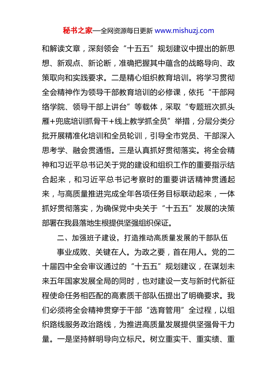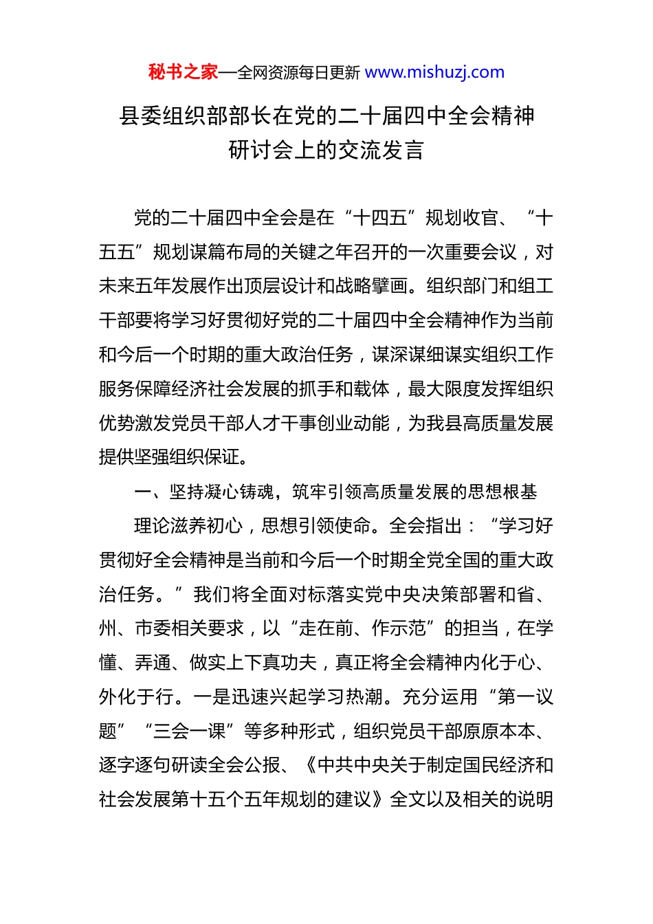秘书之家—全网资源每日更新 www.mishuzj.com县委组织部部长在党的二十届四中全会精神研讨会上的交流发言 党的二十届四中全会是在“十四五”规划收官、“十五五”规划谋篇布局的关键之年召开的一次重要会议,对未来五年发展作出顶层设计和战略擘画。组织部门和组工干部要将学习好贯彻好党的二十届四中全会精神作为当前和今后一个时期的重大政治任务,谋深谋细谋实组织工作服务保障经济社会发展的抓手和载体,最大限度发挥组织优势激发党员干部人才干事创业动能,为我县高质量发展提供坚强组织保证。一、坚持凝心铸魂,筑牢引领高质量发展的思想根基理论滋养初心,思想引领使命。全会指出:“学习好贯彻好全会精神是当前和今后一个时期全党全国的重大政治任务。”我们将全面对标落实党中央决策部署和省、州、市委相关要求,以“走在前、作示范”的担当,在学懂、弄通、做实上下真功夫,真正将全会精神内化于心、外化于行。一是迅速兴起学习热潮。充分运用“第一议题”“三会一课”等多种形式,组织党员干部原原本本、逐字逐句研读全会公报、《中共中央关于制定国民经济和社会发展第十五个五年规划的建议》全文以及相关的说明秘书之家—全网资源每日更新 www.mishuzj.com和解读文章,深刻领会“十五五”规划建议中提出的新思想、新观点、新论断,准确把握其中蕴含的战略导向、政策取向和实践要求。二是精心组织教育培训。将学习贯彻全会精神作为领导干部教育培训的必修课,依托“干部网络学院、领导干部上讲台”等载体,采取“专题班次抓头雁+兜底培训抓骨干+线上教学抓全员”举措,分层分类分批开展精准化培训和全员轮训,引导全市党员、干部深入思考学、融会贯通悟。三是认真抓好贯彻落实。将全会精神和习近平总书记关于党的建设和组织工作的重要指示结合起来,和习近平总书记考察时的重要讲话精神贯通起来,与高质量推进完成全年各项任务目标联动起来,一体抓好贯彻落实,为确保党中央关于“十五五”发展的决策部署在我县落地生根提供坚强组织保证。 二、加强班子建设,打造推动高质量发展的干部队伍事业成败、关键在人。为政之要,首在用人。党的二十届四中全会审议通过的“十五五”规划建议,在谋划未来五年国家发展全局的同时,也对建设一支与新时代新征程使命任务相匹配的高素质干部队伍提出了明确要求。我们必须将全会精神贯穿于干部“选育管用”全过程,以组织路线服务政治路线,为推进高质量发展提供坚强骨干力量。一是坚持鲜明导向立标尺。树立重实干、重实绩、重秘书之家—全网资源每日更新 www.mishuzj.com担当的鲜明用人导向,做深做实政治素质考察、无任用考察了解,将懂规划、善管理、能攻坚的优秀干部选拔到关键岗位。特别关注在推动高质量发展、发展新质生产力等方面思路清晰、办法有效、实绩突出的干部,确保选人用人精准对接发展所需。二是着力优化结构强队伍。紧紧围绕“十五五”规划确定的重点领域和战略方向,精准测算领导班子专业素养和功能结构需求,着力补齐专业短板。结合换届后干部队伍建设需要,有计划地将政治素质好、发展潜力大的干部,特别是换届中新进班子的优秀干部,选派到重大项目建设、服务群众、维护稳定一线受锤炼、增才干。同步加强优秀年轻干部的发现储备和培养使用,实现班子结构优化与党的事业薪火相传的有机统一。三是坚持严管厚爱增干劲。完善从严管理监督干部制度体系,加强对关键岗位干部的重点管理,严格干部日常管理监督,对苗头性问题早发现、早提醒、早纠正。严格落实“三个区分开来”要求,建立健全容错纠错机制和澄清保护机制,旗帜鲜明地为敢于担当、踏实做事、不谋私利的干部撑腰鼓劲。常态化推进领导干部能上能下,畅通渠道、完善程序,形成优者奖、能者上、庸者下、劣者汰的良性循环。三、提升组织功能,夯实保障高质量发展的基层基础秘书之家—全网资源每日更新 www.mishuzj.com求木之长者,必固其根本。党的二十届四中全会系统谋划了“十五五”时期中国式现代化建设的宏伟蓝图,为基层党建工作赋予了新的时代内涵和更高的目标要求。我们将以全会精神为指引,以提升基层党组织政治功能和组织功能为重点,把全会精神...