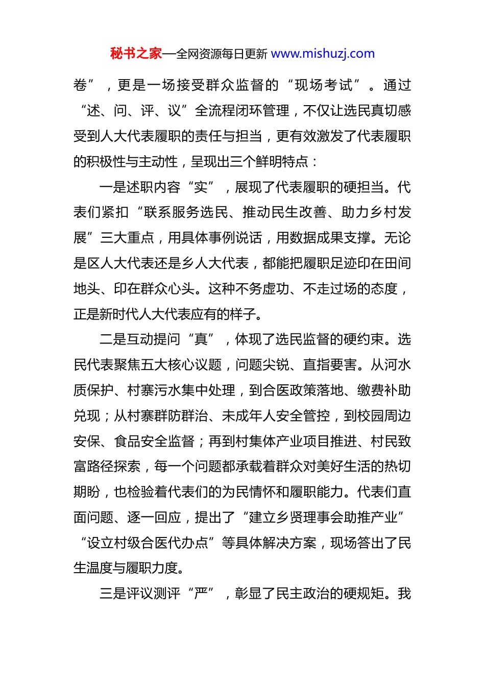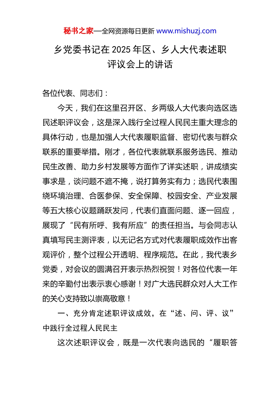 秘书之家—全网资源每日更新 www.mishuzj.com乡党委书记在 2025 年区、乡人大代表述职评议会上的讲话 各位代表、同志们:今天,我们在这里召开区、乡两级人大代表向选区选民述职评议会,这是深入践行全过程人民民主重大理念的具体行动,也是加强人大代表履职监督、密切代表与群众联系的重要举措。刚才,各位代表就联系服务选民、推动民生改善、助力乡村发展等方面作了详实述职,讲成绩实事求是,谈问题不遮不掩,说打算务实有力;选民代表围绕环境治理、合医参保、安全保障、校园安全、产业发展等五大核心议题踊跃发问,代表们直面问题、逐一回应,展现了“民有所呼、我有所应”的责任担当。与会同志认真填写民主测评表,以无记名方式对代表履职成效作出客观评价,整个过程公开透明、程序规范。在此,我代表乡党委,对会议的圆满召开表示热烈祝贺!对各位代表一年来的辛勤付出表示衷心感谢!对广大选民群众对人大工作的关心支持致以崇高敬意!一、充分肯定述职评议成效,在“述、问、评、议”中践行全过程人民民主这次述职评议会,既是一次代表向选民的“履职答秘书之家—全网资源每日更新 www.mishuzj.com卷”,更是一场接受群众监督的“现场考试”。通过“述、问、评、议”全流程闭环管理,不仅让选民真切感受到人大代表履职的责任与担当,更有效激发了代表履职的积极性与主动性,呈现出三个鲜明特点:一是述职内容“实”,展现了代表履职的硬担当。代表们紧扣“联系服务选民、推动民生改善、助力乡村发展”三大重点,用具体事例说话,用数据成果支撑。无论是区人大代表还是乡人大代表,都能把履职足迹印在田间地头、印在群众心头。这种不务虚功、不走过场的态度,正是新时代人大代表应有的样子。二是互动提问“真”,体现了选民监督的硬约束。选民代表聚焦五大核心议题,问题尖锐、直指要害。从河水质保护、村寨污水集中处理,到合医政策落地、缴费补助兑现;从村寨群防群治、未成年人安全管控,到校园周边安保、食品安全监督;再到村集体产业项目推进、村民致富路径探索,每一个问题都承载着群众对美好生活的热切期盼,也检验着代表们的为民情怀和履职能力。代表们直面问题、逐一回应,提出了“建立乡贤理事会助推产业”“设立村级合医代办点”等具体解决方案,现场答出了民生温度与履职力度。三是评议测评“严”,彰显了民主政治的硬规矩。我秘书之家—全网资源每日更新 www.mishuzj.com们坚持客观公正原则,通过无记名投票方式对代表履职成效进行“优秀、称职、不称职”三级评价,让选民手中的选票真正成为衡量代表履职的“标尺”。这种“由谁产生、向谁负责、受谁监督”的制度设计,正是人民代表大会制度的本质要求,也是发展全过程人民民主的生动实践。二、清醒认识当前形势任务,在“五大议题”中找准履职发力点代表们、同志们,当前乡正处于巩固拓展脱贫攻坚成果同乡村振兴有效衔接的关键期,正处于推进基层治理体系和治理能力现代化的攻坚期。从述职和提问中可以看出,群众最关切、代表最关注的五大议题,恰恰是我们工作的重点、难点和着力点。第一,环境治理任重道远,需要持续用力、久久为功。第二,合医参保关乎民心,需要精准宣传、应保尽保。第三,安全保障是底线任务,需要联防联控、群防群治。第四,校园安全牵动千家万户,需要部门联动、齐抓共管。第五,产业发展是致富之源,需要因村施策、提质增效。三、准确把握代表职责使命,在“三个聚焦”中展现新作为秘书之家—全网资源每日更新 www.mishuzj.com人大代表是人民选举产生的“代言人”,是全过程人民民主的重要践行者。习近平总书记强调,“人大代表要更加密切联系人民群众”。结合**乡实际,我对大家提三点要求:(一)聚焦“乡村振兴”战略,当好产业兴旺的“引路人”。乡村振兴是新时代“三农”工作的总抓手。区乡两级人大代表要牢记“人民选我当代表,我当代表为人民”的初心使命,把助力乡村振兴作为履职第一要务。一要深入调研谋良策。围绕“产业兴旺、生态宜居、乡风文明、治理有效、生活富裕”总要求,聚焦我乡“一轴两带三区”产业布局规划,深入田间地头、农户家中开展调研,摸清土地、劳...
