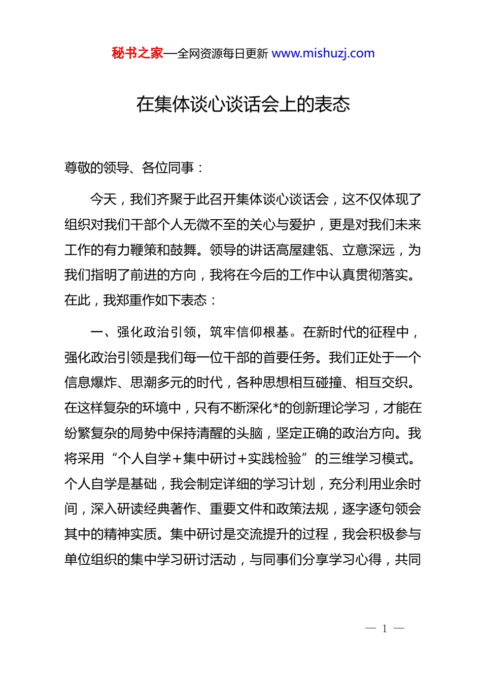 秘书之家—全网资源每日更新 www.mishuzj.com在集体谈心谈话会上的表态尊敬的领导、各位同事:今天,我们齐聚于此召开集体谈心谈话会,这不仅体现了组织对我们干部个人无微不至的关心与爱护,更是对我们未来工作的有力鞭策和鼓舞。领导的讲话高屋建瓴、立意深远,为我们指明了前进的方向,我将在今后的工作中认真贯彻落实。在此,我郑重作如下表态:一、强化政治引领,筑牢信仰根基。在新时代的征程中,强化政治引领是我们每一位干部的首要任务。我们正处于一个信息爆炸、思潮多元的时代,各种思想相互碰撞、相互交织。在这样复杂的环境中,只有不断深化*的创新理论学习,才能在纷繁复杂的局势中保持清醒的头脑,坚定正确的政治方向。我将采用“个人自学+集中研讨+实践检验”的三维学习模式。个人自学是基础,我会制定详细的学习计划,充分利用业余时间,深入研读经典著作、重要文件和政策法规,逐字逐句领会其中的精神实质。集中研讨是交流提升的过程,我会积极参与单位组织的集中学习研讨活动,与同事们分享学习心得,共同— 1 —秘书之家—全网资源每日更新 www.mishuzj.com探讨工作中遇到的问题和解决办法。通过思想的碰撞,拓宽自己的视野,加深对*的创新理论的理解。实践检验是学习的落脚点,我会将所学的理论知识运用到实际工作中,在实践中检验理论的正确性和可行性,不断总结经验教训,提高自己的工作能力和水平。始终以“两个确立”为政治坐标,这是我们必须坚守的政治立场。“两个确立”是*在新时代取得的重大政治成果,是推动*和国家事业取得历史性成就、发生历史性变革的决定性因素。坚定理想信念,就像在茫茫大海中找到了灯塔,无论遇到多大的风浪,都能保持航向不偏。我会时刻牢记自己的初心使命,把为人民服务的宗旨意识深深根植于心中,永葆政治本色。在重大原则问题上,我会保持高度的政治敏锐性和政治鉴别力,时刻保持清醒的头脑。无论是面对国内外复杂的政治形势,还是工作中的各种利益诱惑,我都能坚定地站在*和人民的立场上,确保在思想上、行动上、政治上同以***同志为核心的*中央保持高度一致。我会积极传播*的声音,宣传*的政策,为营造良好的政治生态贡献自己的力量。二、依法履职尽责,自觉接受监督。法治是治国理政的基本方式,依法履职尽责是我们干部的基本要求。在日常工作中,我将恪守法治原则,严格按照法律法规和规章制度办事。每一— 2 —秘书之家—全网资源每日更新 www.mishuzj.com项决策、每一个行动都要有法可依、有章可循,确保决策程序合法合规。这不仅是对自己负责,更是对组织和人民负责。在工作中,我会尽心尽力,不推诿扯皮,勇于担当作为。面对困难和挑战,我不会退缩,而是会积极主动地寻找解决问题的办法。我会以高度的责任感和使命感,认真履行自己的工作职责,努力为单位的发展和人民的幸福贡献自己的力量。自觉接受组织监督、社会监督是确保权力正确行使的重要保障。组织监督能够及时发现我们工作中的问题和不足,帮助我们及时纠正错误,不断改进工作。社会监督能够让我们的工作更加透明、公正,赢得人民群众的信任和支持。我会积极主动地接受监督,把监督看作是对自己的关心和爱护,是对自己成长和进步的帮助。我会如实向组织汇报工作情况,积极配合组织的监督检查。同时,我也会认真对待社会各界的意见和建议,及时回应群众的关切,不断提高自己的工作质量和服务水平。三、严于律己,廉洁奉公。廉洁自律是*员干部的为政之本、立身之基。我会时刻以*规 dj 严格要求自己,恪守本分,秉公处事、廉洁奉公。*规 dj 是我们行为的准则和规范,是不可逾越的红线。我会认真学习*规 dj,熟知每一项规定和要求,做到心中有戒、行有所止。始终以*章*规为行为准则,严格落实中— 3 —秘书之家—全网资源每日更新 www.mishuzj.com央八项规定及其实施细则精神。中央八项规定及其实施细则精神是加强作风建设的重要举措,是对*员干部的基本要求。我会从自身做起,从小事做起,坚决反对形式主义、官僚主义,杜绝享乐主义和奢靡之风。我会保持艰苦奋斗的作风,勤俭节约,反对铺张浪费。筑牢思想防线、严守纪律边界是廉洁自律的关...