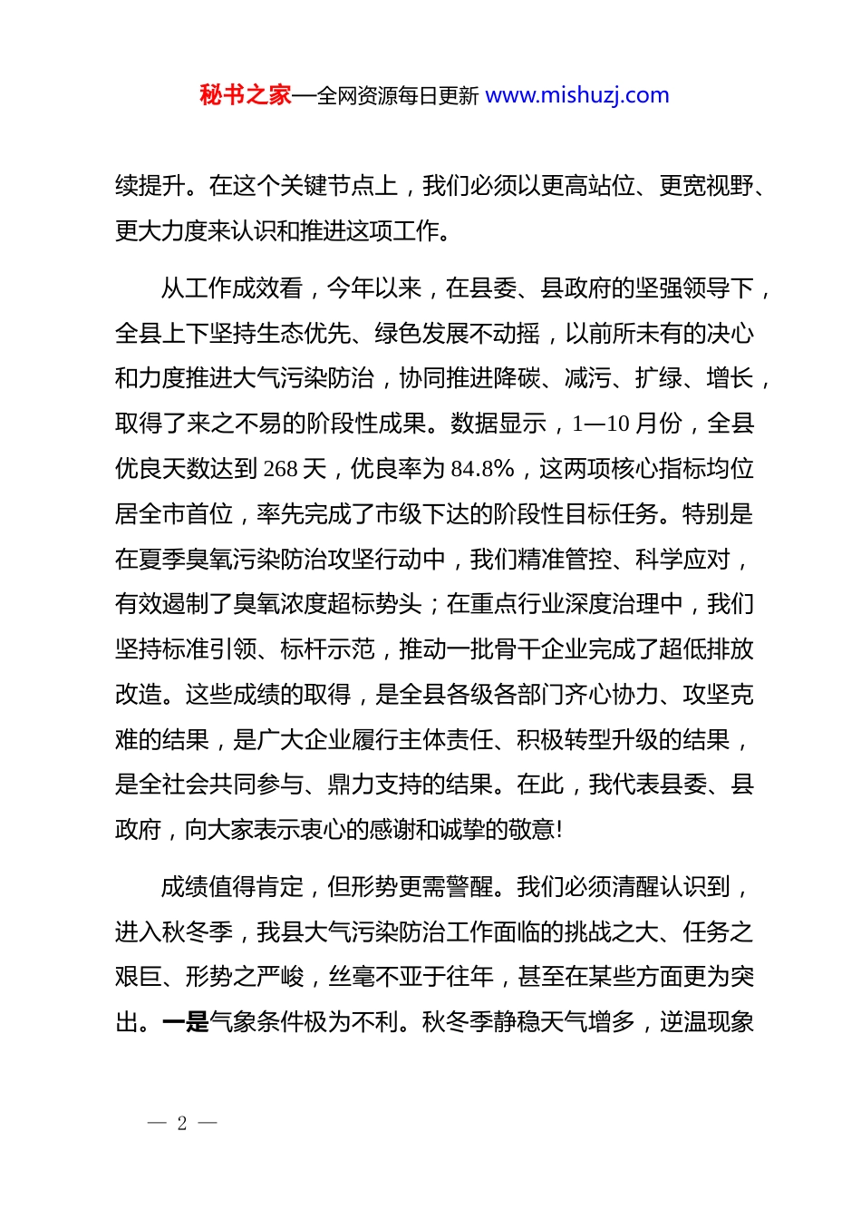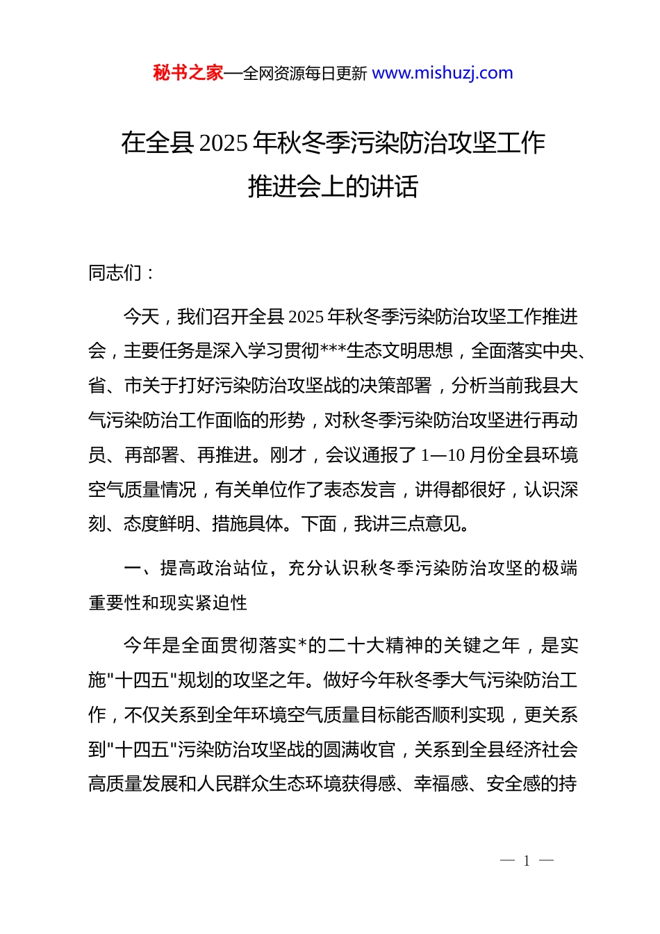 秘书之家—全网资源每日更新 www.mishuzj.com在全县 2025 年秋冬季污染防治攻坚工作推进会上的讲话同志们:今天,我们召开全县 2025 年秋冬季污染防治攻坚工作推进会,主要任务是深入学习贯彻***生态文明思想,全面落实中央、省、市关于打好污染防治攻坚战的决策部署,分析当前我县大气污染防治工作面临的形势,对秋冬季污染防治攻坚进行再动员、再部署、再推进。刚才,会议通报了 1—10 月份全县环境空气质量情况,有关单位作了表态发言,讲得都很好,认识深刻、态度鲜明、措施具体。下面,我讲三点意见。一、提高政治站位,充分认识秋冬季污染防治攻坚的极端重要性和现实紧迫性今年是全面贯彻落实*的二十大精神的关键之年,是实施"十四五"规划的攻坚之年。做好今年秋冬季大气污染防治工作,不仅关系到全年环境空气质量目标能否顺利实现,更关系到"十四五"污染防治攻坚战的圆满收官,关系到全县经济社会高质量发展和人民群众生态环境获得感、幸福感、安全感的持— 1 —秘书之家—全网资源每日更新 www.mishuzj.com续提升。在这个关键节点上,我们必须以更高站位、更宽视野、更大力度来认识和推进这项工作。从工作成效看,今年以来,在县委、县政府的坚强领导下,全县上下坚持生态优先、绿色发展不动摇,以前所未有的决心和力度推进大气污染防治,协同推进降碳、减污、扩绿、增长,取得了来之不易的阶段性成果。数据显示,1—10 月份,全县优良天数达到 268 天,优良率为 84.8%,这两项核心指标均位居全市首位,率先完成了市级下达的阶段性目标任务。特别是在夏季臭氧污染防治攻坚行动中,我们精准管控、科学应对,有效遏制了臭氧浓度超标势头;在重点行业深度治理中,我们坚持标准引领、标杆示范,推动一批骨干企业完成了超低排放改造。这些成绩的取得,是全县各级各部门齐心协力、攻坚克难的结果,是广大企业履行主体责任、积极转型升级的结果,是全社会共同参与、鼎力支持的结果。在此,我代表县委、县政府,向大家表示衷心的感谢和诚挚的敬意!成绩值得肯定,但形势更需警醒。我们必须清醒认识到,进入秋冬季,我县大气污染防治工作面临的挑战之大、任务之艰巨、形势之严峻,丝毫不亚于往年,甚至在某些方面更为突出。一是气象条件极为不利。秋冬季静稳天气增多,逆温现象— 2 —秘书之家—全网资源每日更新 www.mishuzj.com频发,大气环境容量较春夏季压缩近 40%,污染物扩散条件显著变差。据气象部门预测,今年 11 月至明年 2 月,我县冷空气活动偏弱,气温较常年同期偏高,降水偏少,大气边界层高度降低,极易形成区域性污染过程。二是污染物排放总量依然偏高。我县正处于工业化、城镇化加速推进阶段,产业结构偏重、能源结构偏煤、运输结构偏公路的格局尚未根本改变。全县现有重点涉气工业企业 xx 家,建筑工地 xx 个,柴油货车保有量xx 万辆,随着供暖季到来,采暖用煤需求激增,生产和生活排放叠加,污染物排放总量进入全年峰值区间。三是空气质量反弹风险巨大。虽然 1—10 月份我县优良率位居全市第一,但进入 10 月下旬以来,受不利气象条件和区域性传输影响,我县已出现 x 天轻度污染天气,pm10 平均浓度环比上升 xx%,pm2.5平均浓度同比上升 xx 个百分点。这充分说明,当前空气质量改善成果还十分脆弱,稍有松懈就可能前功尽弃。四是完成年度目标压力空前。按照"十四五"空气质量改善目标要求,今年我县 pm2.5 平均浓度必须控制在 xx 微克/立方米以内,重污染天数控制在 x 天以内。目前,我县 pm2.5 浓度累计值为 xx 微克/立方米,已接近年度红线,剩余的调控空间极其有限。可以说,我们正处在"逆水行舟、不进则退"的关键时刻,正处在"船到中流、人到半山"的吃劲阶段。全县上下必须保持战略定力,增强— 3 —秘书之家—全网资源每日更新 www.mishuzj.com危机意识,树牢底线思维,以"时时放心不下"的责任感和"事事落实到位"的执行力,坚决打赢这场污染防治攻坚战。二、聚焦重点任务,以精准管控推动秋冬季空气质量持续改善秋冬季污染防治攻坚是一项系统工程,必须坚持目标导向、问题导向、结果导向,聚焦重点领域、...