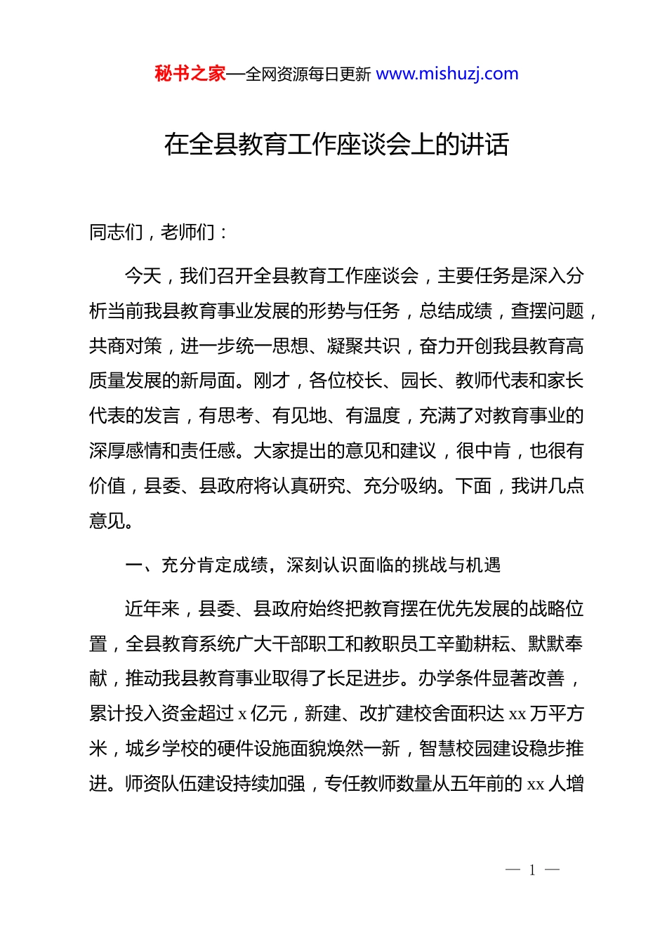 秘书之家—全网资源每日更新 www.mishuzj.com在全县教育工作座谈会上的讲话同志们,老师们:今天,我们召开全县教育工作座谈会,主要任务是深入分析当前我县教育事业发展的形势与任务,总结成绩,查摆问题,共商对策,进一步统一思想、凝聚共识,奋力开创我县教育高质量发展的新局面。刚才,各位校长、园长、教师代表和家长代表的发言,有思考、有见地、有温度,充满了对教育事业的深厚感情和责任感。大家提出的意见和建议,很中肯,也很有价值,县委、县政府将认真研究、充分吸纳。下面,我讲几点意见。一、充分肯定成绩,深刻认识面临的挑战与机遇近年来,县委、县政府始终把教育摆在优先发展的战略位置,全县教育系统广大干部职工和教职员工辛勤耕耘、默默奉献,推动我县教育事业取得了长足进步。办学条件显著改善,累计投入资金超过 x 亿元,新建、改扩建校舍面积达 xx 万平方米,城乡学校的硬件设施面貌焕然一新,智慧校园建设稳步推进。师资队伍建设持续加强,专任教师数量从五年前的 xx 人增— 1 —秘书之家—全网资源每日更新 www.mishuzj.com长到现在的 xx 人,师生比优化到 x:1,教师学历层次和专业能力稳步提升。教育普及水平不断提高,学前三年毛入园率达到xx%,九年义务教育巩固率达到 98.5%,高中阶段毛入学率突破 xx%,为县域经济社会发展提供了有力的人才支撑和智力保障。这些成绩的取得,是全县上下共同努力的结果,更凝聚着广大教师和教育工作者的心血与汗水。在此,我代表县委、县政府,向你们表示衷心的感谢和崇高的敬意!在肯定成绩的同时,我们必须清醒地认识到,对标新时代教育发展的新要求,对标人民群众“上好学”的新期盼,我县教育工作还存在不少短板弱项,面临诸多挑战。一是教育质量整体不高,校际之间、城乡之间发展不均衡的问题依然突出,优质教育资源供给不足,导致“择校热”尚未有效缓解。二是教师队伍建设仍需加强,结构性缺编问题依然存在,部分教师的职业荣誉感和教学动力有待提升,教师队伍的整体素质与新时代要求还有差距。三是教育改革创新力度不够,办学模式相对单一,课堂教学改革不够深入,教育评价体系还不够科学。四是一些深层次矛盾亟待破解,比如大家会上普遍反映的校园管理精细化水平不高、教师编制职称评聘机制不活、优质生源和优秀教师外流等问题,已经成为制约我县教育高质量发展的— 2 —秘书之家—全网资源每日更新 www.mishuzj.com瓶颈。五是校园安全防线需要进一步筑牢,食品安全、心理健康、校园欺凌等问题不容忽视。面对这些挑战,我们别无选择,必须迎难而上,以更大的决心和力度加以解决。当然,挑战与机遇并存。国家层面持续加大对中西部和民族地区教育的支持力度,新一轮科技革命和产业变革为教育创新发展提供了新动能,全县上下对教育的重视程度前所未有。我们要善于危中寻机、转危为机,牢牢把握发展主动权,推动我县教育工作迈上新台阶。二、坚持立德树人,牢牢把握教育发展的正确方向教育是国之大计、*之大计。做好新时代教育工作,必须坚持正确的政治方向。我们要深入学习贯彻******关于教育的重要论述,全面贯彻*的教育方针,坚持社会主义办学方向,把立德树人作为根本任务,努力培养担当民族复兴大任的时代新人。一要坚定为*育人、为国育才的初心使命。教育具有鲜明的政治属性,我们的学校是*领导下的学校,是中国特色社会主义学校。必须把思想政治工作贯穿教育教学全过程,引导广大学生树立正确的世界观、人生观、价值观,增强“四个意识”,坚定“四个自信”,做到“两个维护”,从小听*话、感*恩、— 3 —秘书之家—全网资源每日更新 www.mishuzj.com跟*走,确保红色江山代代相传。二要坚定不移落实立德树人根本任务。立德树人是教育的根本任务,立什么“德”是核心。我们要培养的,是德智体美劳全面发展的社会主义建设者和接班人。要坚持“五育”并举,在抓好智育的同时,把德育放在更加突出的位置,深入开展爱国主义、集体主义、社会主义核心价值观教育;要加强体育美育和劳动教育,开齐开足课程,让学生在体育锻炼中享受乐趣、增强体质,在美育熏陶中陶冶情操、提高审美,在劳动...