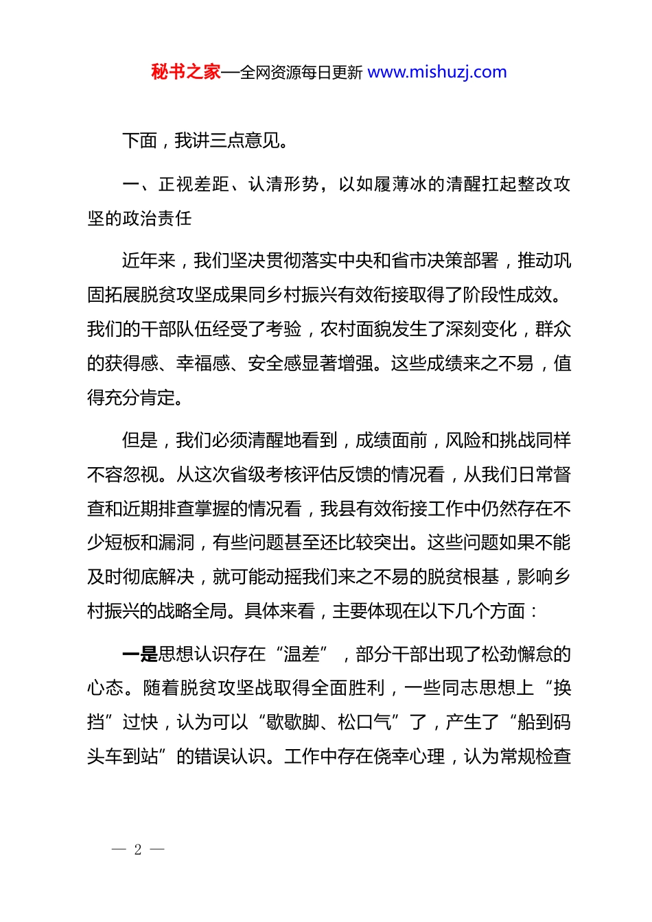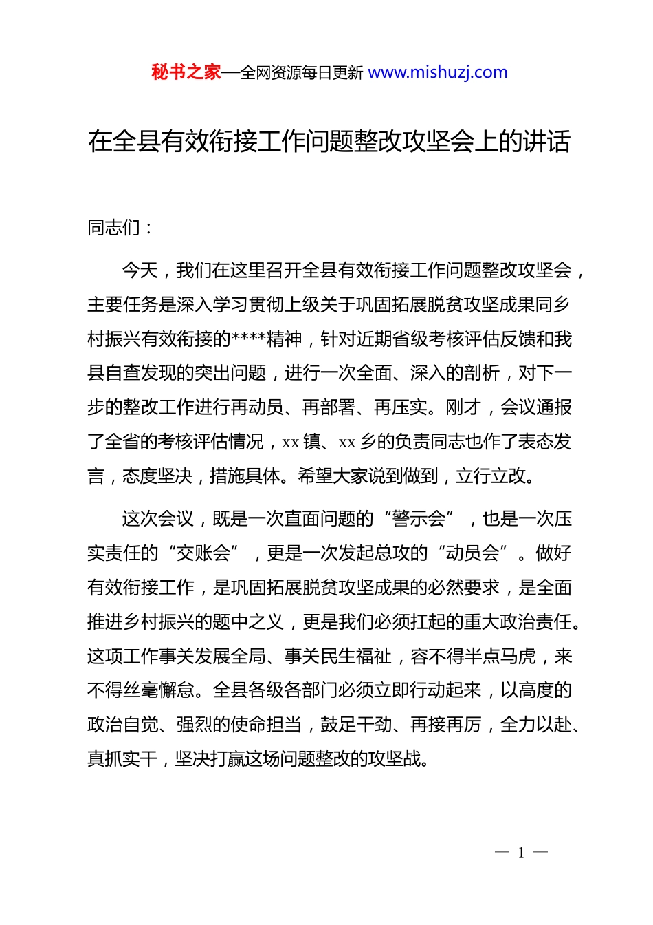 秘书之家—全网资源每日更新 www.mishuzj.com在全县有效衔接工作问题整改攻坚会上的讲话同志们:今天,我们在这里召开全县有效衔接工作问题整改攻坚会,主要任务是深入学习贯彻上级关于巩固拓展脱贫攻坚成果同乡村振兴有效衔接的****精神,针对近期省级考核评估反馈和我县自查发现的突出问题,进行一次全面、深入的剖析,对下一步的整改工作进行再动员、再部署、再压实。刚才,会议通报了全省的考核评估情况,xx 镇、xx 乡的负责同志也作了表态发言,态度坚决,措施具体。希望大家说到做到,立行立改。这次会议,既是一次直面问题的“警示会”,也是一次压实责任的“交账会”,更是一次发起总攻的“动员会”。做好有效衔接工作,是巩固拓展脱贫攻坚成果的必然要求,是全面推进乡村振兴的题中之义,更是我们必须扛起的重大政治责任。这项工作事关发展全局、事关民生福祉,容不得半点马虎,来不得丝毫懈怠。全县各级各部门必须立即行动起来,以高度的政治自觉、强烈的使命担当,鼓足干劲、再接再厉,全力以赴、真抓实干,坚决打赢这场问题整改的攻坚战。— 1 —秘书之家—全网资源每日更新 www.mishuzj.com下面,我讲三点意见。一、正视差距、认清形势,以如履薄冰的清醒扛起整改攻坚的政治责任近年来,我们坚决贯彻落实中央和省市决策部署,推动巩固拓展脱贫攻坚成果同乡村振兴有效衔接取得了阶段性成效。我们的干部队伍经受了考验,农村面貌发生了深刻变化,群众的获得感、幸福感、安全感显著增强。这些成绩来之不易,值得充分肯定。但是,我们必须清醒地看到,成绩面前,风险和挑战同样不容忽视。从这次省级考核评估反馈的情况看,从我们日常督查和近期排查掌握的情况看,我县有效衔接工作中仍然存在不少短板和漏洞,有些问题甚至还比较突出。这些问题如果不能及时彻底解决,就可能动摇我们来之不易的脱贫根基,影响乡村振兴的战略全局。具体来看,主要体现在以下几个方面:一是思想认识存在“温差”,部分干部出现了松劲懈怠的心态。随着脱贫攻坚战取得全面胜利,一些同志思想上“换挡”过快,认为可以“歇歇脚、松口气”了,产生了“船到码头车到站”的错误认识。工作中存在侥幸心理,认为常规检查— 2 —秘书之家—全网资源每日更新 www.mishuzj.com“蒙混过关”问题不大;存在懈怠心态,过去“五加二、白加黑”的拼劲有所减弱,下村入户的频率低了,与群众的沟通少了;存在畏难心思,面对一些历史遗留的“硬骨头”、新出现的复杂矛盾,习惯于绕道走、向上交,缺乏攻坚克难的勇气和办法。这种思想上的“温差”,是导致行动上“落差”的根本原因,是我们必须首先解决的“总开关”问题。二是责任链条存在“断点”,压力传导出现了层层递减的现象。有效衔接工作是一项系统工程,需要环环相扣、无缝对接的责任体系。但从实际情况看,“上热中温下冷”的现象依然存在。有的单位“主体责任”扛得不牢,把任务简单分解下去,当起了“甩手掌柜”,缺乏跟踪问效;有的乡镇对村级工作指导不力,压力传导不够,满足于开会发文,对一线情况掌握不准、研判不深;有的驻村干部和村“两委”班子责任心不强,日常工作满足于“填表格、报数据”,对群众的急难愁盼问题解决不及时、不到位。责任链条一旦出现“断点”,政策落实就会“最后一公里”受阻,工作成效就会大打折扣。三是工作作风存在“浮漂”,一些举措没有真正沉下去、落到实处。作风问题是各项事业成败的关键。当前,我们一些干部的工作作风还不够扎实。比如,在防止返贫动态监测上,— 3 —秘书之家—全网资源每日更新 www.mishuzj.com有的满足于线上数据比对,对一些因病、因灾、因学等出现的突发性困难家庭,未能第一时间发现并纳入帮扶,存在应纳未纳的风险。在产业就业帮扶上,有的项目规划缺乏前瞻性,与市场衔接不紧,联农带农益农机制不健全,导致群众增收效果不明显。在人居环境整治上,一些地方重“面子”轻“里子”,只注重主干道、示范点的“盆景”打造,而忽视了偏远角落、特别是困难群众家门口的“视觉贫困”问题,房前屋后杂物乱堆、卫生状况堪忧的现象依然存在。这种“浮在表面”的作风,背离了我们工作...