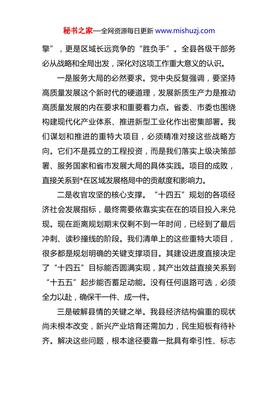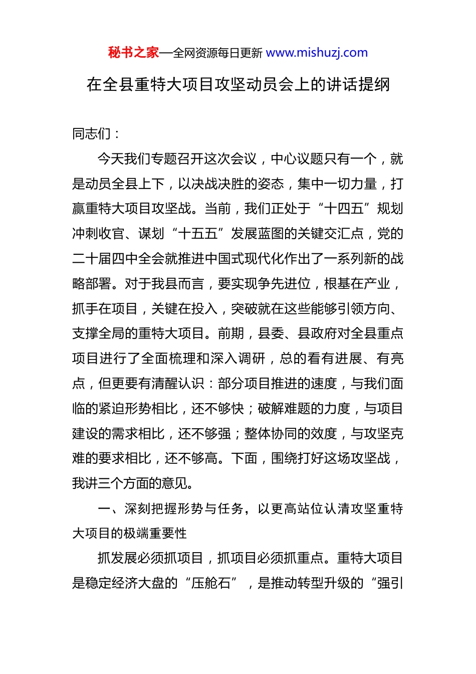 秘书之家—全网资源每日更新 www.mishuzj.com在全县重特大项目攻坚动员会上的讲话提纲 同志们:今天我们专题召开这次会议,中心议题只有一个,就是动员全县上下,以决战决胜的姿态,集中一切力量,打赢重特大项目攻坚战。当前,我们正处于“十四五”规划冲刺收官、谋划“十五五”发展蓝图的关键交汇点,党的二十届四中全会就推进中国式现代化作出了一系列新的战略部署。对于我县而言,要实现争先进位,根基在产业,抓手在项目,关键在投入,突破就在这些能够引领方向、支撑全局的重特大项目。前期,县委、县政府对全县重点项目进行了全面梳理和深入调研,总的看有进展、有亮点,但更要有清醒认识:部分项目推进的速度,与我们面临的紧迫形势相比,还不够快;破解难题的力度,与项目建设的需求相比,还不够强;整体协同的效度,与攻坚克难的要求相比,还不够高。下面,围绕打好这场攻坚战,我讲三个方面的意见。一、深刻把握形势与任务,以更高站位认清攻坚重特大项目的极端重要性抓发展必须抓项目,抓项目必须抓重点。重特大项目是稳定经济大盘的“压舱石”,是推动转型升级的“强引秘书之家—全网资源每日更新 www.mishuzj.com擎”,更是区域长远竞争的“胜负手”。全县各级干部务必从战略和全局出发,深化对这项工作重大意义的认识。一是服务大局的必然要求。党中央反复强调,要坚持高质量发展这个新时代的硬道理,发展新质生产力是推动高质量发展的内在要求和重要着力点。省委、市委也围绕构建现代化产业体系、推进新型工业化作出密集部署。我们谋划和推进的重特大项目,必须精准对接这些战略方向。它们不是孤立的工程投资,而是我们落实上级决策部署、服务国家和省市发展大局的具体实践。项目的成败,直接关系到*在区域发展格局中的贡献度和影响力。二是收官攻坚的核心支撑。“十四五”规划的各项经济社会发展指标,最终需要依靠实实在在的项目投入来兑现。现在距离规划期末仅剩不到一年时间,已经到了最后冲刺、读秒撞线的阶段。我们清单上的这些重特大项目,很多都是规划明确的关键支撑项目。其建设进度直接决定了“十四五”目标能否圆满实现,其产出效益直接关系到“十五五”起步能否蓄足动能。没有任何退路可选,必须全力以赴,确保干一件、成一件。三是破解县情的关键之举。我县经济结构偏重的现状尚未根本改变,新兴产业培育还需加力,民生短板有待补齐。解决这些问题,根本途径要靠一批具有牵引性、标志秘书之家—全网资源每日更新 www.mishuzj.com性的大项目好项目。通过重大产业项目的落地,可以优化产业结构,形成新的经济增长点;通过重大基础设施项目的建设,可以改善发展条件,提升综合承载能力;通过重大民生项目的实施,可以增强群众获得感,促进社会和谐稳定。抓项目就是抓发展,谋项目就是谋未来,这一点在任何时候都不能动摇。四是锤炼队伍的重要考场。项目一线是检验干部能力、作风和担当的试金石。一个项目从谋划到投产,环节多、链条长、协调难,是对干部综合素质的全面考验。能否在复杂局面中打开通道,能否在瓶颈制约中创新突破,能否在协同作战中凝聚合力,都是实实在在的考题。我们要把项目攻坚的战场作为发现干部、培养干部、使用干部的重要平台,引导广大干部在实战中增长才干,在担当中创造实绩。二、聚焦重点靶向发力,以更实举措掀起重特大项目攻坚热潮攻坚不能停留在口号上,必须明确主攻方向,找准方法路径,拿出过硬措施。要围绕“谋划、招引、建设、达效”全链条,实施精准攻坚,务求取得突破性进展。(一)实施谋划储备提档行动,夯实项目源头基础。项目攻坚,谋划先行。一是瞄准政策抓谋划。紧密跟踪国秘书之家—全网资源每日更新 www.mishuzj.com家宏观政策导向和资金投向,围绕发展新质生产力、推进乡村全面振兴、加强生态文明建设等重点领域,加强研究解读,提高项目谋划的前瞻性和契合度,力争更多项目进入上级规划“盘子”。二是立足优势抓谋划。深刻把握我县在区位、资源、产业等方面的比较优势,聚焦**主导产业延链补链强链,聚焦战略性新兴产业培育,聚焦现代服务业提质扩容,精心策划一批具有较强竞争力和带动力的特色项目...