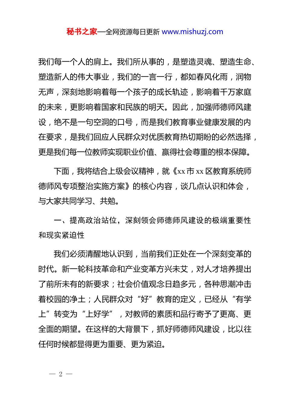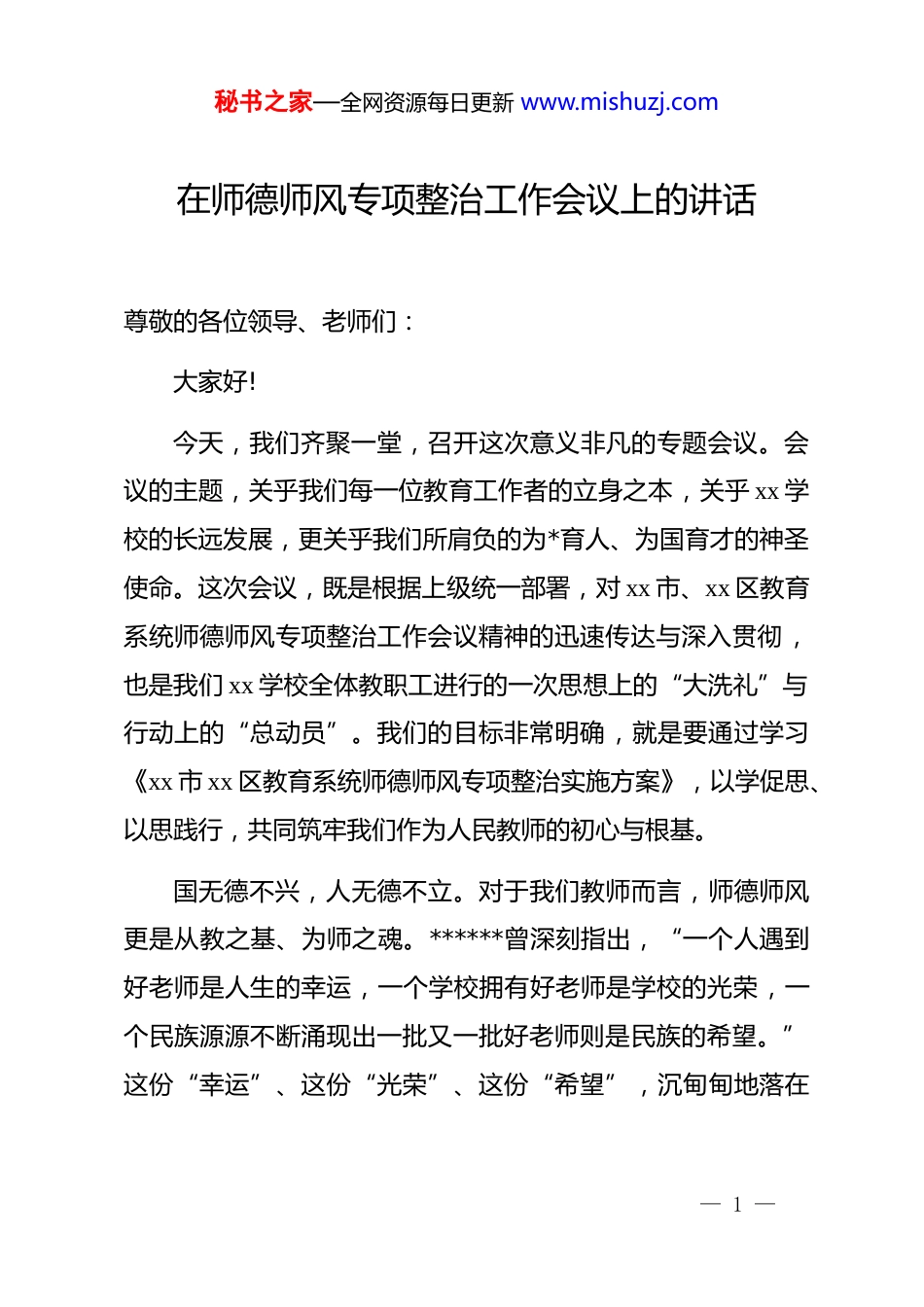 秘书之家—全网资源每日更新 www.mishuzj.com在师德师风专项整治工作会议上的讲话尊敬的各位领导、老师们:大家好!今天,我们齐聚一堂,召开这次意义非凡的专题会议。会议的主题,关乎我们每一位教育工作者的立身之本,关乎 xx 学校的长远发展,更关乎我们所肩负的为*育人、为国育才的神圣使命。这次会议,既是根据上级统一部署,对 xx 市、xx 区教育系统师德师风专项整治工作会议精神的迅速传达与深入贯彻,也是我们 xx 学校全体教职工进行的一次思想上的“大洗礼”与行动上的“总动员”。我们的目标非常明确,就是要通过学习《xx 市 xx 区教育系统师德师风专项整治实施方案》,以学促思、以思践行,共同筑牢我们作为人民教师的初心与根基。国无德不兴,人无德不立。对于我们教师而言,师德师风更是从教之基、为师之魂。******曾深刻指出,“一个人遇到好老师是人生的幸运,一个学校拥有好老师是学校的光荣,一个民族源源不断涌现出一批又一批好老师则是民族的希望。”这份“幸运”、这份“光荣”、这份“希望”,沉甸甸地落在— 1 —秘书之家—全网资源每日更新 www.mishuzj.com我们每一个人的肩上。我们所从事的,是塑造灵魂、塑造生命、塑造新人的伟大事业,我们的一言一行,都如春风化雨,润物无声,深刻地影响着每一个孩子的成长轨迹,影响着千万家庭的未来,更影响着国家和民族的明天。因此,加强师德师风建设,绝不是一句空洞的口号,而是我们教育事业健康发展的内在要求,是我们回应人民群众对优质教育热切期盼的必然选择,更是我们每一位教师实现职业价值、赢得社会尊重的根本保障。下面,我将结合上级会议精神,就《xx 市 xx 区教育系统师德师风专项整治实施方案》的核心内容,谈几点认识和体会,与大家共同学习、共勉。一、提高政治站位,深刻领会师德师风建设的极端重要性和现实紧迫性我们必须清醒地认识到,当前我们正处在一个深刻变革的时代。新一轮科技革命和产业变革方兴未艾,对人才培养提出了前所未有的新要求;社会价值观念日趋多元,各种思潮冲击着校园的净土;人民群众对“好”教育的定义,已经从“有学上”转变为“上好学”,对教师的素质和品行寄予了更高、更全面的期望。在这样的大背景下,抓好师德师风建设,比以往任何时候都显得更为重要、更为紧迫。— 2 —秘书之家—全网资源每日更新 www.mishuzj.com第一,这是落实立德树人根本任务的核心要求。教育的根本任务是什么?是立德树人。育人之本,在于立德铸魂。我们培养的学生,首先应该是一个品德高尚、人格健全的人。而要培养这样的人,教师自身的德行修养是第一位的。古人云:“其身正,不令而行;其身不正,虽令不从。”我们不能想象,一个品行有亏的教师,能够培养出品学兼优的学生。教师的道德情操、价值观念会潜移默化地传递给学生。我们是学生知识的引路人,更是他们品格的塑造者、人生的领航员。我们必须率先垂范,以高尚的人格感染学生,以丰富的学识引导学生,以博大的胸怀爱护学生,真正成为学生锤炼品格、学习知识、创新思维、奉献祖国的“四个引路人”。第二,这是回应社会关切、维护教育形象的迫切需要。近年来,全国各地曝光的一些师德失范案例,虽然只是个别现象,但其负面影响巨大,严重损害了教师队伍的整体形象,辜负了社会的信任。一颗老鼠屎坏一锅汤,我们必须引以为戒,警钟长鸣。社会用“放大镜”审视着我们,家长用“显微镜”观察着我们。我们的一举一动,都可能被解读、被评价。开展此次专项整治,就是要以“零容忍”的态度,坚决清除队伍中的害群之马,刮骨疗毒,净化风气,重塑社会对教师职业的尊重与— 3 —秘书之家—全网资源每日更新 www.mishuzj.com信赖,让人民教师这个光荣称号在新时代绽放出更加璀璨的光芒。第三,这是促进教师专业成长、实现自我价值的内在动力。师德,是教师专业素养的首要构成。一个没有良好师德的教师,即使业务能力再强,也算不上一名合格的教师。高尚的师德,本身就是一种强大的教育力量。它能激发我们的教育热情,赋予我们战胜困难的勇气,帮助我们赢得学生的真心爱戴和家长的全力配合。当我们把教书育人当作一项事业...