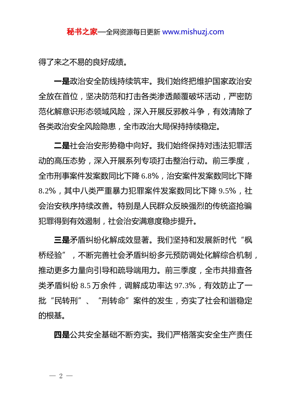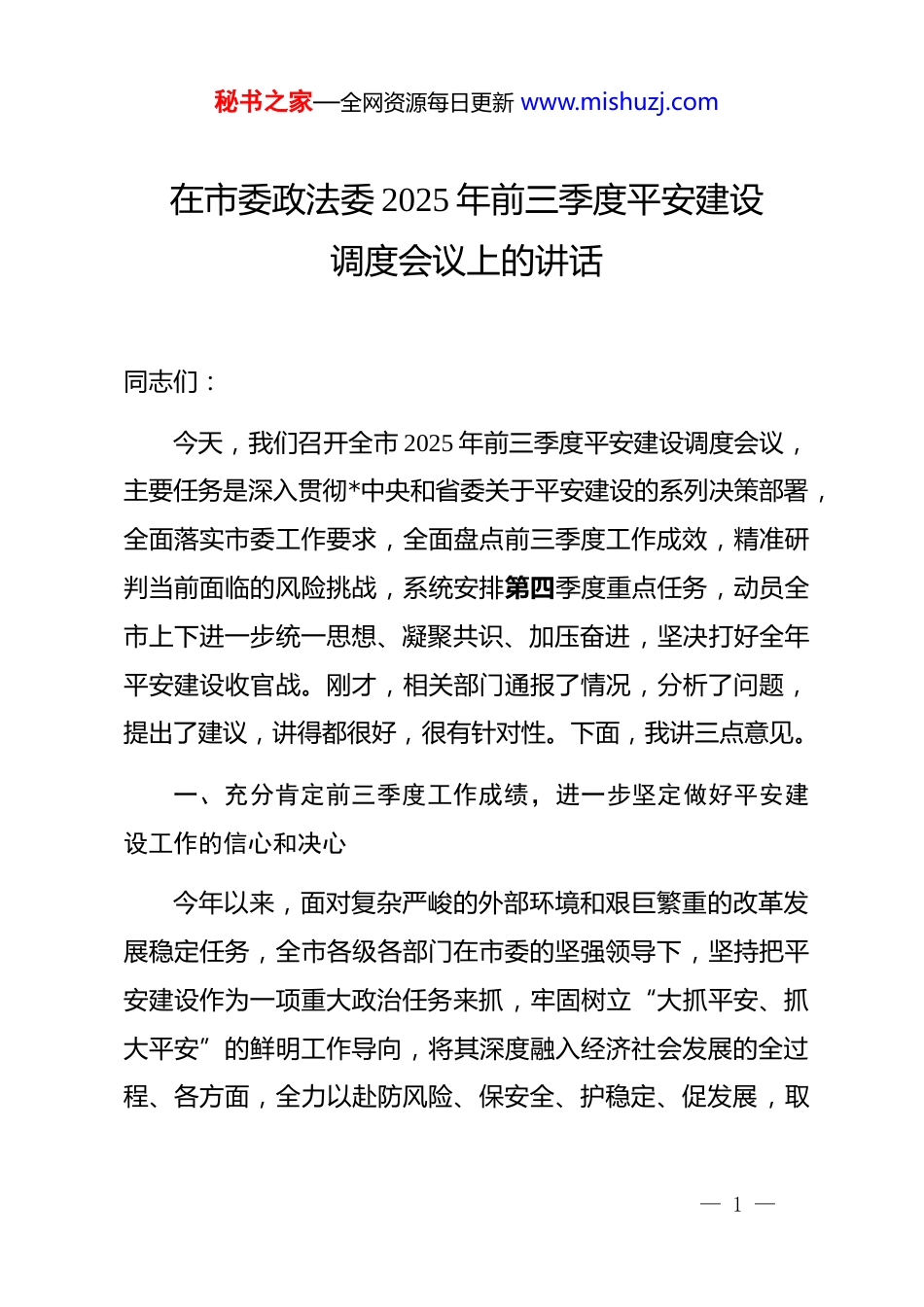 秘书之家—全网资源每日更新 www.mishuzj.com在市委政法委 2025 年前三季度平安建设调度会议上的讲话同志们:今天,我们召开全市 2025 年前三季度平安建设调度会议,主要任务是深入贯彻*中央和省委关于平安建设的系列决策部署,全面落实市委工作要求,全面盘点前三季度工作成效,精准研判当前面临的风险挑战,系统安排第四季度重点任务,动员全市上下进一步统一思想、凝聚共识、加压奋进,坚决打好全年平安建设收官战。刚才,相关部门通报了情况,分析了问题,提出了建议,讲得都很好,很有针对性。下面,我讲三点意见。一、充分肯定前三季度工作成绩,进一步坚定做好平安建设工作的信心和决心今年以来,面对复杂严峻的外部环境和艰巨繁重的改革发展稳定任务,全市各级各部门在市委的坚强领导下,坚持把平安建设作为一项重大政治任务来抓,牢固树立“大抓平安、抓大平安”的鲜明工作导向,将其深度融入经济社会发展的全过程、各方面,全力以赴防风险、保安全、护稳定、促发展,取— 1 —秘书之家—全网资源每日更新 www.mishuzj.com得了来之不易的良好成绩。一是政治安全防线持续筑牢。我们始终把维护国家政治安全放在首位,坚决防范和打击各类渗透颠覆破坏活动,严密防范化解意识形态领域风险,深入开展反邪教斗争,有效清除了各类政治安全风险隐患,全市政治大局保持持续稳定。二是社会治安形势稳中向好。我们始终保持对违法犯罪活动的高压态势,深入开展系列专项打击整治行动。前三季度,全市刑事案件发案数同比下降 6.8%,治安案件发案数同比下降8.2%,其中八类严重暴力犯罪案件发案数同比下降 9.5%,社会治安秩序持续改善。特别是人民群众反映强烈的传统盗抢骗犯罪得到有效遏制,社会治安满意度稳步提升。三是矛盾纠纷化解成效显著。我们坚持和发展新时代“枫桥经验”,不断完善社会矛盾纠纷多元预防调处化解综合机制,推动更多力量向引导和疏导端用力。前三季度,全市共排查各类矛盾纠纷 8.5 万余件,调解成功率达 97.3%,有效防止了一批“民转刑”、“刑转命”案件的发生,夯实了社会和谐稳定的根基。四是公共安全基础不断夯实。我们严格落实安全生产责任— 2 —秘书之家—全网资源每日更新 www.mishuzj.com制,深入开展重点行业领域安全隐患排查整治,前三季度各类生产安全事故起数和死亡人数实现“双下降”。同时,有效应对了多轮强降雨、台风等自然灾害,防汛抗旱、森林防火等工作扎实有力,保障了人民群众生命财产安全。五是网络安全屏障更加坚固。我们深入开展“净网”专项行动,严厉打击网络黑灰产业链,有效整治了网络谣言、网络暴力等乱象。关键信息基础设施安全保护和数据安全管理得到加强,全市网络安全保障能力和水平显著提升。这些成绩的取得,是市委正确领导的结果,是全市各级各部门齐抓共管、协同发力,特别是全体政法干警、网格员、平安志愿者等一线同志们辛勤付出、顽强拼搏的结果。在此,我代表市委、市政府,向大家表示衷心的感谢和崇高的敬意!在肯定成绩的同时,我们也要清醒地认识到,当前平安建设面临的形势依然严峻复杂,工作中还存在一些不容忽视的短板和弱项。对此,我们必须保持高度警醒,切实增强责任感和紧迫感,采取更加有力的措施加以解决。二、准确把握当前面临的形势和挑战,切实增强抓好平安建设的责任感和紧迫感— 3 —秘书之家—全网资源每日更新 www.mishuzj.com做好第四季度平安建设工作,对于我们完成全年目标任务、为“十四五”规划顺利收官奠定坚实基础,具有十分重要的意义。我们必须坚持问题导向,深刻认识当前面临的风险挑战,做到未雨绸缪、有的放矢。从外部环境看,国际形势变乱交织,对我国的影响日益加深,各种敌对势力渗透颠覆破坏活动从未停止,政治安全领域的风险不容忽视。从国内大局看,我国正处于高质量发展的关键时期,经济社会结构正在经历深刻转型,各类矛盾风险交织叠加,维护社会大局稳定面临新的压力。从我市实际看,一些深层次问题逐渐显现,风险挑战呈现一些新的特点。一是社会治安领域的新业态新风险日益突出。以电信网络诈骗为代表的新型犯罪持续高发,手段不断翻新,迷惑性、隐蔽性更...