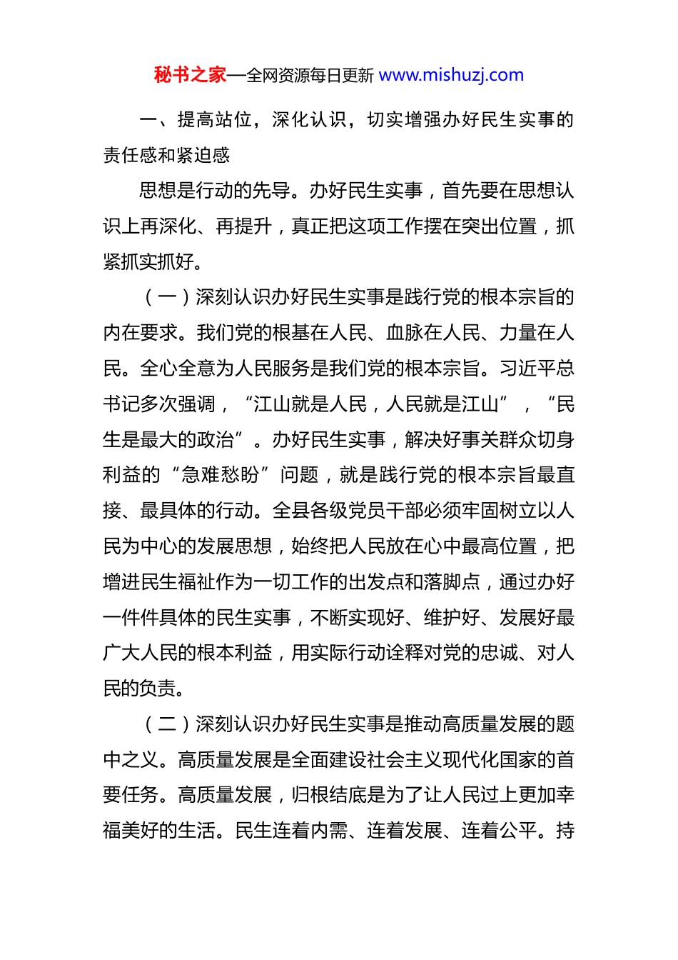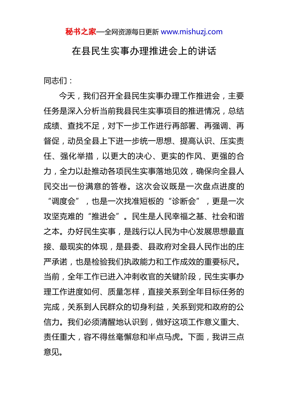秘书之家—全网资源每日更新 www.mishuzj.com在县民生实事办理推进会上的讲话 同志们:今天,我们召开全县民生实事办理工作推进会,主要任务是深入分析当前我县民生实事项目的推进情况,总结成绩、查找不足,对下一步工作进行再部署、再强调、再督促,动员全县上下进一步统一思想、提高认识、压实责任、强化举措,以更大的决心、更实的作风、更强的合力,全力以赴推动各项民生实事落地见效,确保向全县人民交出一份满意的答卷。这次会议既是一次盘点进度的“调度会”,也是一次找准短板的“诊断会”,更是一次攻坚克难的“推进会”。民生是人民幸福之基、社会和谐之本。办好民生实事,是践行以人民为中心发展思想最直接、最现实的体现,是县委、县政府对全县人民作出的庄严承诺,也是检验我们执政能力和工作成效的重要标尺。当前,全年工作已进入冲刺收官的关键阶段,民生实事办理工作进度如何、质量怎样,直接关系到全年目标任务的完成,关系到人民群众的切身利益,关系到党和政府的公信力。我们必须清醒地认识到,做好这项工作意义重大、责任重大,容不得丝毫懈怠和半点马虎。下面,我讲三点意见。秘书之家—全网资源每日更新 www.mishuzj.com一、提高站位,深化认识,切实增强办好民生实事的责任感和紧迫感思想是行动的先导。办好民生实事,首先要在思想认识上再深化、再提升,真正把这项工作摆在突出位置,抓紧抓实抓好。(一)深刻认识办好民生实事是践行党的根本宗旨的内在要求。我们党的根基在人民、血脉在人民、力量在人民。全心全意为人民服务是我们党的根本宗旨。习近平总书记多次强调,“江山就是人民,人民就是江山”,“民生是最大的政治”。办好民生实事,解决好事关群众切身利益的“急难愁盼”问题,就是践行党的根本宗旨最直接、最具体的行动。全县各级党员干部必须牢固树立以人民为中心的发展思想,始终把人民放在心中最高位置,把增进民生福祉作为一切工作的出发点和落脚点,通过办好一件件具体的民生实事,不断实现好、维护好、发展好最广大人民的根本利益,用实际行动诠释对党的忠诚、对人民的负责。(二)深刻认识办好民生实事是推动高质量发展的题中之义。高质量发展是全面建设社会主义现代化国家的首要任务。高质量发展,归根结底是为了让人民过上更加幸福美好的生活。民生连着内需、连着发展、连着公平。持秘书之家—全网资源每日更新 www.mishuzj.com续改善民生,既能有效解决群众后顾之忧,释放消费潜力、扩大内需,为经济发展注入强劲动力;也能促进社会公平正义,维护社会和谐稳定,为高质量发展营造良好环境;还能提升人力资本质量,为现代化建设提供坚实的人才支撑。因此,抓好民生实事办理,不仅是民生工作,也是经济工作,更是政治工作。我们必须坚持在发展中保障和改善民生,通过高质量发展为改善民生创造更加坚实的物质基础,通过持续改善民生为高质量发展汇聚更加强大的力量。(三)深刻认识办好民生实事是检验干部作风能力的重要标尺。民生实事办得怎么样,直接反映着各级干部的责任担当、能力水平和工作作风。是直面矛盾、攻坚克难,还是回避问题、敷衍塞责?是深入一线、真抓实干,还是浮在表面、蜻蜓点水?是精益求精、追求卓越,还是马虎应付、得过且过?民生实事就是一面镜子,映照出干部的宗旨意识、政绩观和执行力。办好民生实事,是对我们各级领导干部政治判断力、政治领悟力、政治执行力的实际检验,是对我们工作能力和工作作风的集中考验。全县各级干部要以对历史、对人民高度负责的态度,把民生实事办理作为锤炼党性、改进作风、提升能力的重要战场,以实实在在的工作成效赢得人民群众的信任和支持。秘书之家—全网资源每日更新 www.mishuzj.com(四)深刻认识当前民生实事办理工作的特殊紧迫性。现在已经进入 10 月份,全年时间所剩不多。各项民生实事项目已经到了决战决胜的冲刺阶段。时间紧、任务重、要求高。同时,随着经济社会发展,人民群众对美好生活的向往呈现出多样化、多层次、多方面的特点,对民生福祉提出了新的更高要求。我们必须切实增强等不起的紧迫感、慢不得的危机感、坐不住的责任感,以“时不我待、只争...
