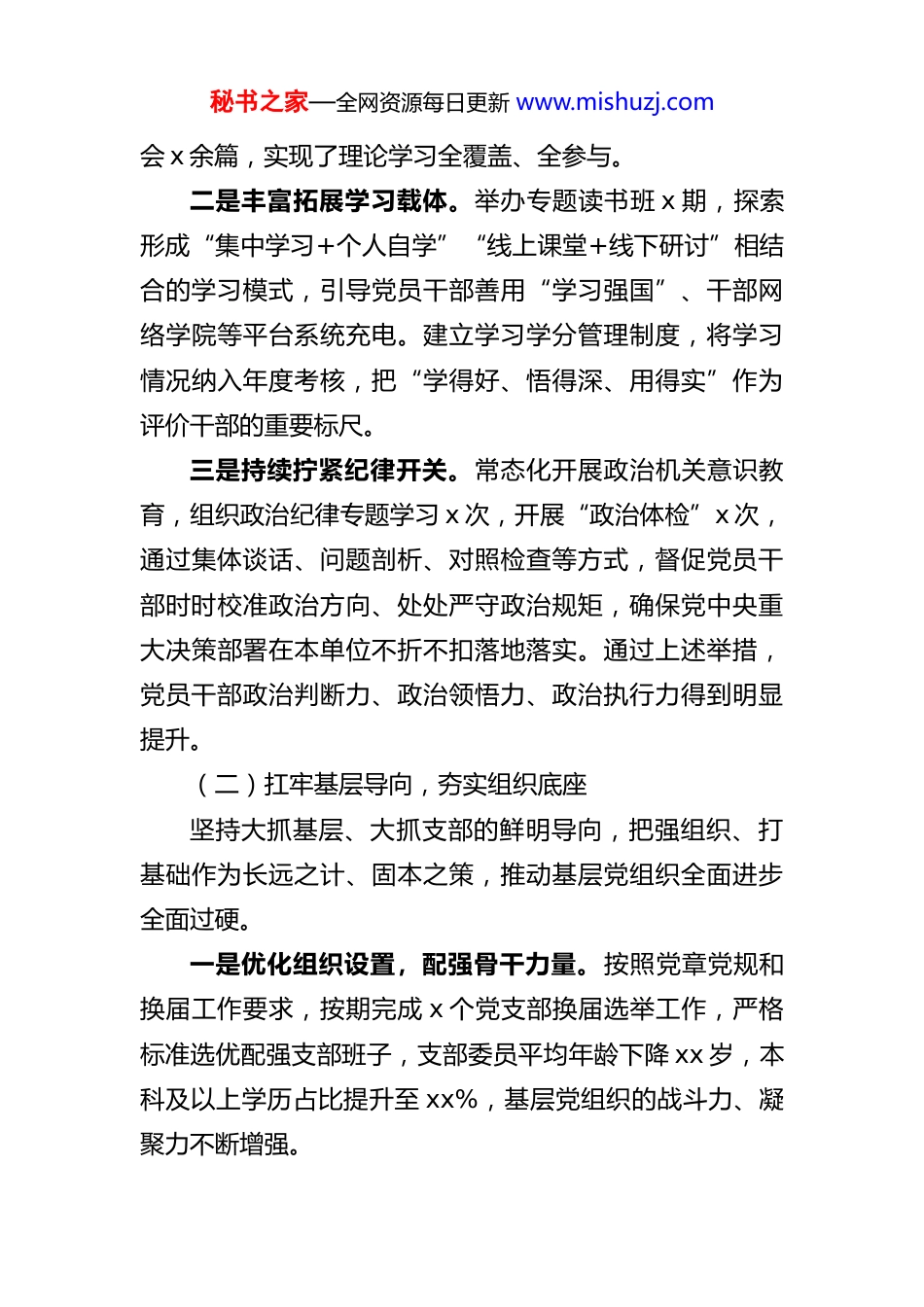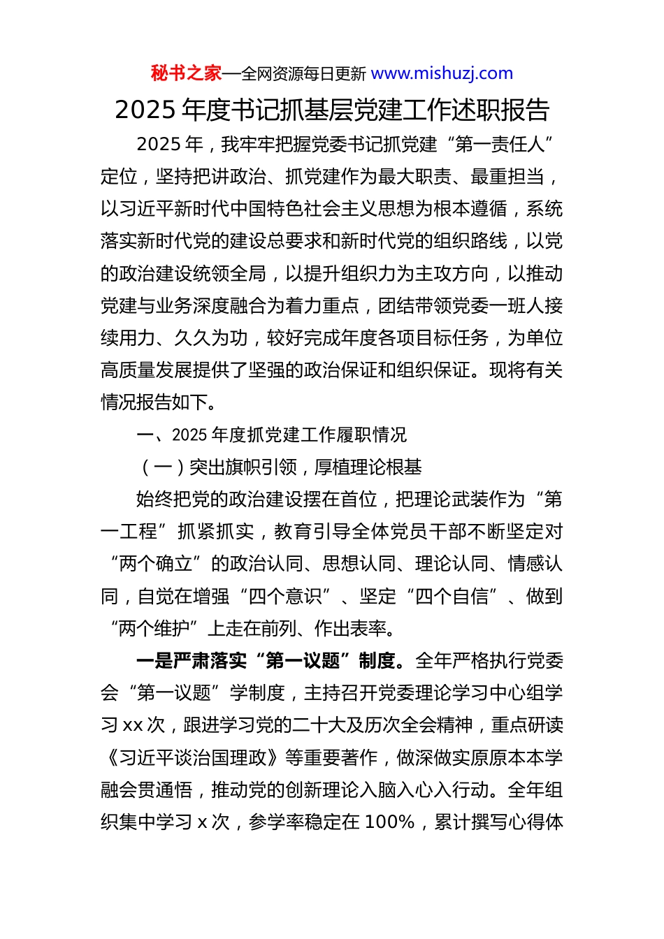 秘书之家—全网资源每日更新 www.mishuzj.com2025 年度书记抓基层党建工作述职报告2025 年,我牢牢把握党委书记抓党建“第一责任人”定位,坚持把讲政治、抓党建作为最大职责、最重担当,以习近平新时代中国特色社会主义思想为根本遵循,系统落实新时代党的建设总要求和新时代党的组织路线,以党的政治建设统领全局,以提升组织力为主攻方向,以推动党建与业务深度融合为着力重点,团结带领党委一班人接续用力、久久为功,较好完成年度各项目标任务,为单位高质量发展提供了坚强的政治保证和组织保证。现将有关情况报告如下。一、2025 年度抓党建工作履职情况(一)突出旗帜引领,厚植理论根基始终把党的政治建设摆在首位,把理论武装作为“第一工程”抓紧抓实,教育引导全体党员干部不断坚定对“两个确立”的政治认同、思想认同、理论认同、情感认同,自觉在增强“四个意识”、坚定“四个自信”、做到“两个维护”上走在前列、作出表率。一是严肃落实“第一议题”制度。全年严格执行党委会“第一议题”学制度,主持召开党委理论学习中心组学习 xx 次,跟进学习党的二十大及历次全会精神,重点研读《习近平谈治国理政》等重要著作,做深做实原原本本学融会贯通悟,推动党的创新理论入脑入心入行动。全年组织集中学习 x 次,参学率稳定在 100%,累计撰写心得体秘书之家—全网资源每日更新 www.mishuzj.com会 x 余篇,实现了理论学习全覆盖、全参与。二是丰富拓展学习载体。举办专题读书班 x 期,探索形成“集中学习+个人自学”“线上课堂+线下研讨”相结合的学习模式,引导党员干部善用“学习强国”、干部网络学院等平台系统充电。建立学习学分管理制度,将学习情况纳入年度考核,把“学得好、悟得深、用得实”作为评价干部的重要标尺。三是持续拧紧纪律开关。常态化开展政治机关意识教育,组织政治纪律专题学习 x 次,开展“政治体检”x 次,通过集体谈话、问题剖析、对照检查等方式,督促党员干部时时校准政治方向、处处严守政治规矩,确保党中央重大决策部署在本单位不折不扣落地落实。通过上述举措,党员干部政治判断力、政治领悟力、政治执行力得到明显提升。(二)扛牢基层导向,夯实组织底座坚持大抓基层、大抓支部的鲜明导向,把强组织、打基础作为长远之计、固本之策,推动基层党组织全面进步全面过硬。一是优化组织设置,配强骨干力量。按照党章党规和换届工作要求,按期完成 x 个党支部换届选举工作,严格标准选优配强支部班子,支部委员平均年龄下降 xx 岁,本科及以上学历占比提升至 xx%,基层党组织的战斗力、凝聚力不断增强。秘书之家—全网资源每日更新 www.mishuzj.com二是做精党建品牌,提升支部能级。纵深推进“四强”党支部创建,持续擦亮“一支部一品牌”。全年新创“五星级党支部”x 个,培育党建示范点 x 个,x 个支部获评市直机关先进基层党组织。严格落实组织生活制度,全年规范开展“三会一课”xx 次、主题党日活动 xx 次,推行主题党日“清单+纪实+评议”模式,组织生活严起来、实起来、活起来。三是强化“头雁工程”,带动“群雁齐飞”。把支部书记和骨干党务干部作为重点对象抓紧抓好,全年培训党支部书记及党务干部 xx 人次,组织业务技能比武 x 次,以比促学、以赛促干。高质量发展党员 xx 名,注重在重点岗位、急难任务一线吸收先进分子入党。开展“学习身边榜样”等活动 xx 场,选树先进典型 xx 人,用看得见、摸得着的标杆,激励党员干部见贤思齐、争当先锋,基层党组织战斗堡垒作用得到更加有力彰显。(三)聚焦深度融合,赋能改革发展牢牢把握“围绕中心抓党建、抓好党建促发展”的根本要求,坚持把党建工作嵌入改革发展稳定全过程各环节把“党建优势”转化为“发展胜势”。一是让党建提前介入,把好决策“第一关”。修订完善党委工作规则,进一步规范“会前酝酿、会上审议、会后落实”各环节,把重大改革事项、重点项目安排、重要人事调整等全部纳入党委集体研究决策范围。制定《党建秘书之家—全网资源每日更新 www.mishuzj.com与业务融合实施细则》,明确“融合的事项、融合的路径融合的标准”,...