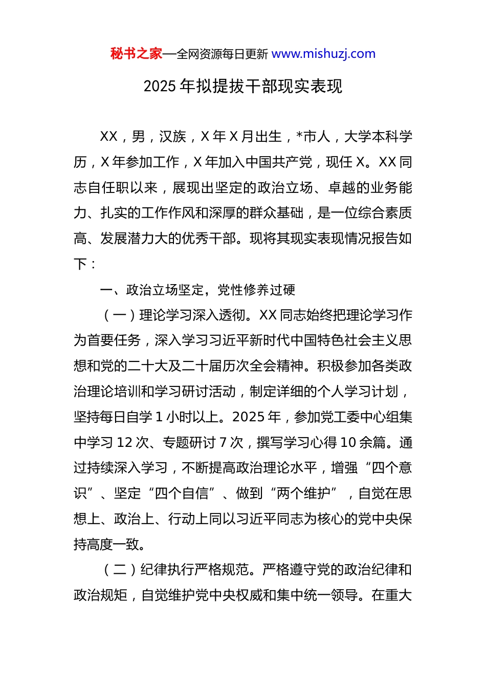 秘书之家—全网资源每日更新 www.mishuzj.com2025 年拟提拔干部现实表现 XX,男,汉族,X 年 X 月出生,*市人,大学本科学历,X 年参加工作,X 年加入中国共产党,现任 X。XX 同志自任职以来,展现出坚定的政治立场、卓越的业务能力、扎实的工作作风和深厚的群众基础,是一位综合素质高、发展潜力大的优秀干部。现将其现实表现情况报告如下:一、政治立场坚定,党性修养过硬(一)理论学习深入透彻。XX 同志始终把理论学习作为首要任务,深入学习习近平新时代中国特色社会主义思想和党的二十大及二十届历次全会精神。积极参加各类政治理论培训和学习研讨活动,制定详细的个人学习计划,坚持每日自学 1 小时以上。2025 年,参加党工委中心组集中学习 12 次、专题研讨 7 次,撰写学习心得 10 余篇。通过持续深入学习,不断提高政治理论水平,增强“四个意识”、坚定“四个自信”、做到“两个维护”,自觉在思想上、政治上、行动上同以习近平同志为核心的党中央保持高度一致。(二)纪律执行严格规范。严格遵守党的政治纪律和政治规矩,自觉维护党中央权威和集中统一领导。在重大秘书之家—全网资源每日更新 www.mishuzj.com事项决策、重要工作部署上,严格按照程序请示报告,坚决服从组织安排。在工作中,始终保持清醒的政治头脑,面对各种错误思潮和不良现象,敢于挺身而出、坚决斗争。2025 年,在单位组织的廉政教育活动中,积极参与讨论发言,分享学习心得,引导身边同事增强廉洁自律意识。在日常工作和生活中,严格遵守廉洁自律各项规定,自觉抵制各种诱惑,做到清正廉洁、公私分明。二、业务能力突出,工作业绩显著(一)统筹协调高效有序。立足本职岗位,不断创新工作方法和思路,具有较强的统筹协调能力。主持编制了《[单位名称]未来五年发展战略规划》,明确了发展目标和重点任务,并建立了“月调度、季评估、年总结”的推进机制,确保各项工作有序推进。在重点项目推进过程中,积极协调各方资源,加强与上级部门、相关单位和企业的沟通联系,及时解决项目建设中遇到的困难和问题。2025年,负责的[重点项目名称]提前三个月完成建设任务,为单位创造了显著的经济效益和社会效益。该项目的成功经验被上级部门作为典型案例在全市范围内推广。(二)改革创新积极有为。积极推动单位的改革创新工作,勇于探索新的工作模式和方法。提出了“数字化转型+精细化管理”的工作思路,推动单位的业务流程优化和秘书之家—全网资源每日更新 www.mishuzj.com信息化建设。创新实施了“[工作法名称]”,通过建立数据共享平台和协同工作机制,实现了工作效率的大幅提升和资源的优化配置。相关经验做法被《[权威媒体名称]》专题报道,得到了市委、市政府主要领导的批示肯定。主持完成的调研报告《[调研报告名称]》提出的 8 项建议全部被市委、市政府采纳,并转化为具体的政策措施,为推动全市经济社会发展提供了有力的决策参考。(三)攻坚克难勇于担当。在急难险重任务面前,始终保持昂扬的斗志和勇于担当的精神。2025 年,面对突发的[重大灾害或事件名称],迅速组织成立应急处置小组,带领团队连续奋战 7 天 7 夜,成功应对了灾害挑战,最大限度地减少了人员伤亡和财产损失。在处理历史遗留问题和信访积案方面,深入基层调研,了解群众诉求,积极协调各方力量,推动问题的解决。2025 年,成功化解信访积案6 起,涉及群众 400 余人,信访量同比下降 45%,为维护社会稳定做出了重要贡献。三、宗旨意识牢固,群众基础深厚(一)心系群众服务为民。始终牢记为人民服务的宗旨,把群众的利益放在首位。经常深入基层一线,了解群众的需求和困难,积极为群众办实事、解难题。2025 年,开展走访调研活动 30 余次,走访群众 500 余户,收集意秘书之家—全网资源每日更新 www.mishuzj.com见建议 80 余条,并及时将群众的诉求反馈给相关部门,推动问题的解决。积极参与志愿服务活动,组织开展了“关爱孤寡老人”“帮扶贫困学生”等公益活动,为困难群众送去了温暖和关怀。(二)团结协作凝聚合力。具有良好的团队合作精神,能够与同事们密切配合、团结协作。在...