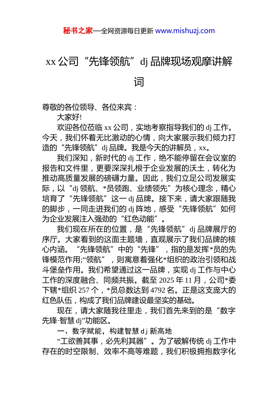 秘书之家—全网资源每日更新 www.mishuzj.comxx 公司“先锋领航”dj 品牌现场观摩讲解词尊敬的各位领导、各位来宾:大家好!欢迎各位莅临 xx 公司,实地考察指导我们的 dj 工作。今天,我们怀着无比激动的心情,向大家展示我们倾力打造的“先锋领航”dj 品牌。我是今天的讲解员,xx。我们深知,新时代的 dj 工作,绝不能停留在会议室的报告和文件里,更要深深扎根于企业发展的沃土,转化为推动高质量发展的磅礴力量。因此,我们立足公司发展实际,以“dj 领航、*员领跑、业绩领先”为核心理念,精心培育了“先锋领航”这一 dj 品牌。接下来,请大家跟随我的脚步,一同走进我们的 dj 阵地,感受“先锋领航”如何为企业发展注入强劲的“红色动能”。我们现在所在的位置,是“先锋领航”dj 品牌展厅的序厅。大家看到的这面主题墙,直观展示了我们品牌的核心内涵。“先锋领航”中的“先锋”,指的是发挥*员的先锋模范作用;“领航”,则寓意着强化*组织的政治引领和战斗堡垒作用。我们希望通过这一品牌,实现 dj 工作与中心工作的深度融合、同频共振。截至 2025 年 11 月,公司*委下辖*组织 257 个,*员总数达到 4792 名。正是这支庞大的红色队伍,构成了我们品牌建设最坚实的基础。现在,请大家随我往里走,我们首先来到的是“数字先锋·智慧 dj”功能区。一、数字赋能,构建智慧 dj 新高地“工欲善其事,必先利其器”。为了破解传统 dj 工作中存在的时空限制、效率不高等难题,我们积极拥抱数字化秘书之家—全网资源每日更新 www.mishuzj.com浪潮,自主研发了“先锋领航”智慧 dj 云平台。大家请看大屏幕上实时跳动的数据。这是我们平台的“数据驾驶舱”。截至目前,平台已覆盖公司全部 257 个*组织,注册*员用户超过 8000 名,累计访问量已突破 200 万人次。这背后,是智慧平台提供的强大功能支撑。一是实现组织管理的“一网统管”。平台构建了清晰的“*委—*总支—*支部—*员”四级线上组织架构。*组织的设立、换届、调整,*员信息的录入、转接、管理,均可在线上完成,实现了*员档案电子化和组织关系的便捷流转。*费收缴功能更是实现了线上自动核算、一键缴纳,极大提升了*务工作的规范性和效率。二是实现组织生活的“一键触达”。平台集成了“三会一课”、主题*日、民主评议等核心功能模块。*支部可以线上发布活动通知、会议议程,*员可以一键报名、扫码签到。会后,会议纪要、学习资料、活动照片等自动归档形成完整的组织生活电子档案,实现了全过程留痕、可溯可查。我们还引入了视频会议功能,让身处异地项目或出差在外的*员也能“云端”参会,确保组织生活“不掉线、不断档”。三是实现*员教育的“一站学习”。我们整合了海量学习资源,开设了线上“先锋书院”。这里既有权威的政策理论解读,也有生动的先进事迹分享。我们还打造了“*员微讲堂”栏目,鼓励普通*员走上讲台,用“身边事”教育“身边人”。2024 年以来,我们共组织线上专题学习 150余场,开展在线知识竞赛 8 次,*员参学率始终保持在 95%以上。通过这种“菜单式”学习模式,有效解决了工学矛盾,让*员教育从“被动灌输”转变为“主动吸收”。通过这个智慧平台,“先锋领航”品牌不仅是一个理念,更是一个高效运转的数字化 dj 工作体系。它让我们的dj 工作看得见、管得住、评得了,真正实现了从“经验化”管理到“精细化”治理的跨越。秘书之家—全网资源每日更新 www.mishuzj.com接下来,请大家随我来到这边,这里是我们“项目攻坚·先锋堡垒”的成果展示区。二、融合驱动,打造业务发展强引擎dj 工作的生命力在于服务中心大局。我们始终坚持“围绕发展抓 dj,抓好 dj 促发展”的原则,推动 dj 工作与生产经营深度融合,将*的政治优势、组织优势转化为企业的发展优势和竞争优势。一是支部建在项目上,让*旗在一线高高飘扬。针对公司重点项目、重大工程分布广泛的特点,我们创新组织设置模式,在所有符合条件的重大项目一线成立临时*支部或*小组。大家看到的这个沙盘,展示的是我们公司在 xx 新区的重大基础设施建设项目。该项目工期紧、任务重、技术难...