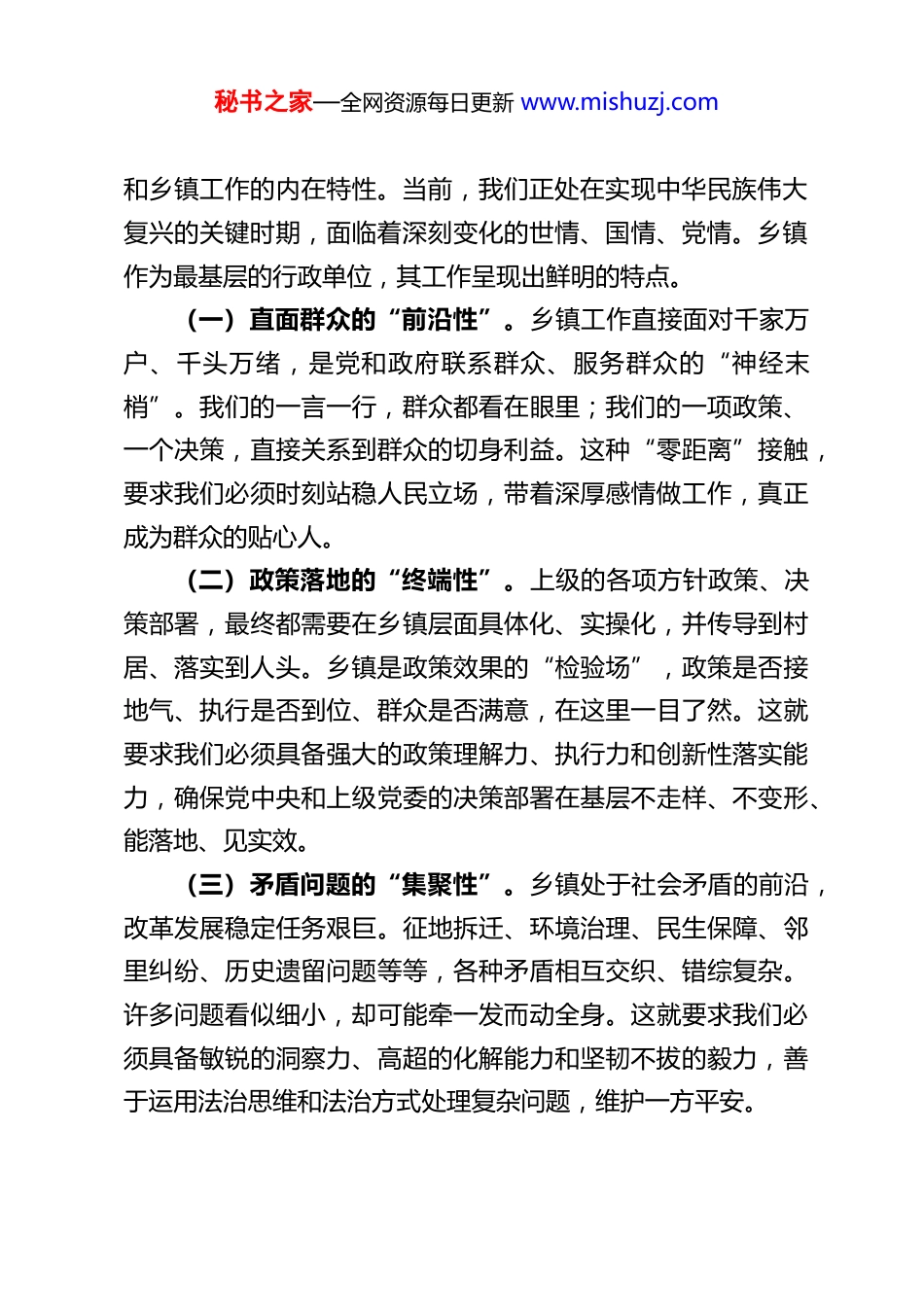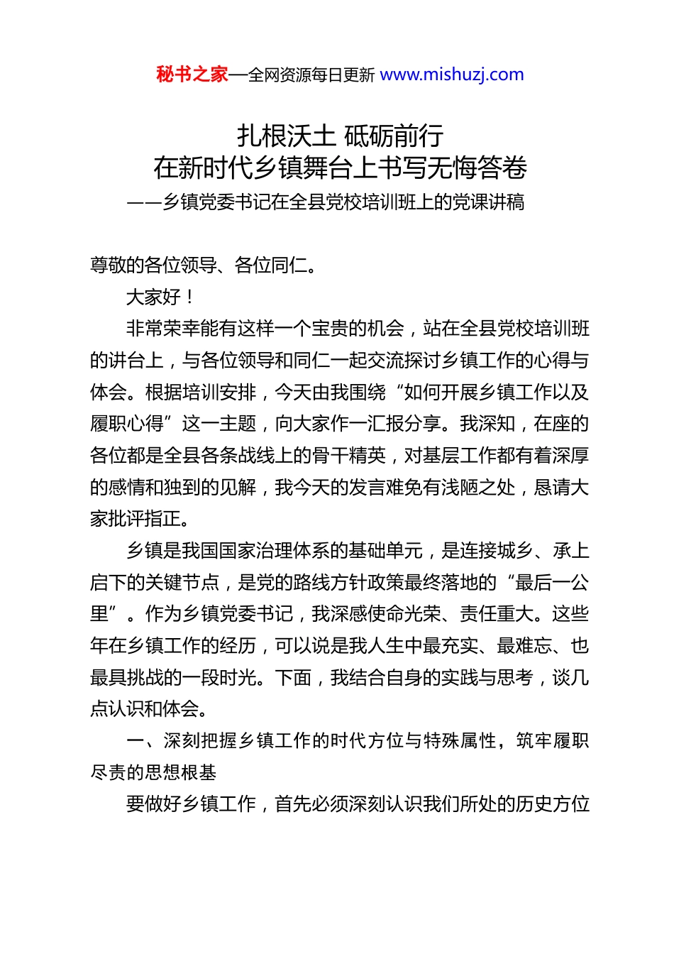 秘书之家—全网资源每日更新 www.mishuzj.com扎根沃土 砥砺前行在新时代乡镇舞台上书写无悔答卷——乡镇党委书记在全县党校培训班上的党课讲稿尊敬的各位领导、各位同仁。大家好!非常荣幸能有这样一个宝贵的机会,站在全县党校培训班的讲台上,与各位领导和同仁一起交流探讨乡镇工作的心得与体会。根据培训安排,今天由我围绕“如何开展乡镇工作以及履职心得”这一主题,向大家作一汇报分享。我深知,在座的各位都是全县各条战线上的骨干精英,对基层工作都有着深厚的感情和独到的见解,我今天的发言难免有浅陋之处,恳请大家批评指正。乡镇是我国国家治理体系的基础单元,是连接城乡、承上启下的关键节点,是党的路线方针政策最终落地的“最后一公里”。作为乡镇党委书记,我深感使命光荣、责任重大。这些年在乡镇工作的经历,可以说是我人生中最充实、最难忘、也最具挑战的一段时光。下面,我结合自身的实践与思考,谈几点认识和体会。一、深刻把握乡镇工作的时代方位与特殊属性,筑牢履职尽责的思想根基要做好乡镇工作,首先必须深刻认识我们所处的历史方位秘书之家—全网资源每日更新 www.mishuzj.com和乡镇工作的内在特性。当前,我们正处在实现中华民族伟大复兴的关键时期,面临着深刻变化的世情、国情、党情。乡镇作为最基层的行政单位,其工作呈现出鲜明的特点。(一)直面群众的“前沿性”。乡镇工作直接面对千家万户、千头万绪,是党和政府联系群众、服务群众的“神经末梢”。我们的一言一行,群众都看在眼里;我们的一项政策、一个决策,直接关系到群众的切身利益。这种“零距离”接触,要求我们必须时刻站稳人民立场,带着深厚感情做工作,真正成为群众的贴心人。(二)政策落地的“终端性”。上级的各项方针政策、决策部署,最终都需要在乡镇层面具体化、实操化,并传导到村居、落实到人头。乡镇是政策效果的“检验场”,政策是否接地气、执行是否到位、群众是否满意,在这里一目了然。这就要求我们必须具备强大的政策理解力、执行力和创新性落实能力,确保党中央和上级党委的决策部署在基层不走样、不变形、能落地、见实效。(三)矛盾问题的“集聚性”。乡镇处于社会矛盾的前沿,改革发展稳定任务艰巨。征地拆迁、环境治理、民生保障、邻里纠纷、历史遗留问题等等,各种矛盾相互交织、错综复杂。许多问题看似细小,却可能牵一发而动全身。这就要求我们必须具备敏锐的洞察力、高超的化解能力和坚韧不拔的毅力,善于运用法治思维和法治方式处理复杂问题,维护一方平安。秘书之家—全网资源每日更新 www.mishuzj.com(四)事务繁杂的“综合性”。“上面千条线,下面一根针”,是对乡镇工作最形象的比喻。经济发展、社会治理、基层党建、安全生产、乡村振兴、生态环保、文化建设、民生服务……各项工作最终都汇集到乡镇。乡镇干部往往要身兼数职,成为“多面手”。这就要求我们必须具备统筹协调、弹好钢琴的能力,既要抓住重点,又要兼顾全面。(五)发展阶段的“机遇性”。当前,乡村振兴战略全面实施,城乡融合发展步伐加快,为乡镇发展带来了前所未有的历史机遇。同时,新发展理念的深入贯彻,高质量发展要求的提出,也对乡镇工作提出了新的更高要求。我们必须准确把握时代脉搏,抢抓发展机遇,勇于开拓创新,努力在构建新发展格局中展现乡镇作为。深刻认识这些属性,有助于我们找准定位、把准方向,不断增强做好乡镇工作的责任感和使命感。作为乡镇党委书记,更要率先垂范,带领班子成员和全体干部,深刻领悟“两个确立”的决定性意义,增强“四个意识”、坚定“四个自信”、做到“两个维护”,自觉在思想上政治上行动上同党中央保持高度一致,确保乡镇各项工作始终沿着正确的政治方向前进。二、聚焦主责主业,探索乡镇工作的实践路径与方法基于对乡镇工作特性的认识,在实践中,我们不断探索和总结,形成了一些行之有效的工作方法和路径。(一)坚持党建引领,铸就坚强战斗堡垒。秘书之家—全网资源每日更新 www.mishuzj.com办好农村的事情,实现乡村振兴,关键在党。乡镇党委必须坚决扛起管党治党主体责任,把抓好党建作为最大政绩,以高质量党建引领高质量...