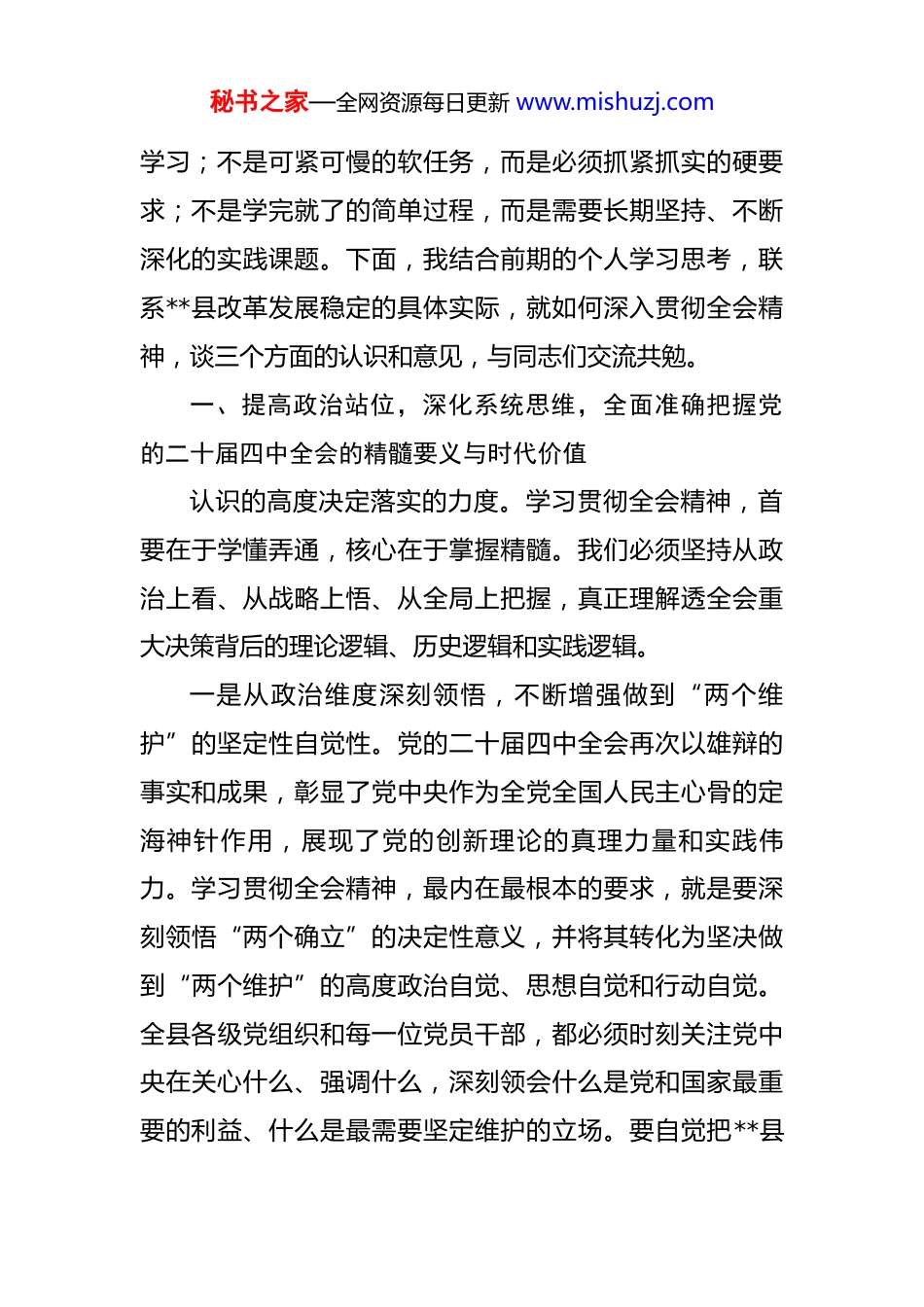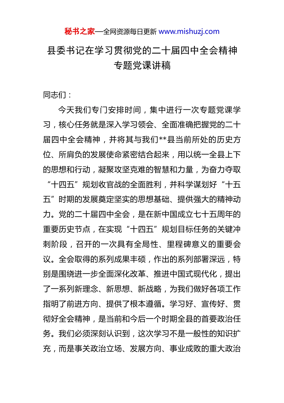 秘书之家—全网资源每日更新 www.mishuzj.com县委书记在学习贯彻党的二十届四中全会精神专题党课讲稿 同志们:今天我们专门安排时间,集中进行一次专题党课学习,核心任务就是深入学习领会、全面准确把握党的二十届四中全会精神,并将其与我们**县当前所处的历史方位、所肩负的发展使命紧密结合起来,用以统一全县上下的思想和行动,凝聚攻坚克难的智慧和力量,为奋力夺取“十四五”规划收官战的全面胜利,并科学谋划好“十五五”时期的发展奠定坚实的思想基础、提供强大的精神动力。党的二十届四中全会,是在新中国成立七十五周年的重要历史节点,在实现“十四五”规划目标任务的关键冲刺阶段,召开的一次具有全局性、里程碑意义的重要会议。全会取得的系列成果丰硕,作出的系列部署深远,特别是围绕进一步全面深化改革、推进中国式现代化,提出了一系列新理念、新思想、新战略,为我们做好各项工作指明了前进方向、提供了根本遵循。学习好、宣传好、贯彻好全会精神,是当前和今后一个时期全县的首要政治任务。我们必须深刻认识到,这次学习不是一般性的知识扩充,而是事关政治立场、发展方向、事业成败的重大政治秘书之家—全网资源每日更新 www.mishuzj.com学习;不是可紧可慢的软任务,而是必须抓紧抓实的硬要求;不是学完就了的简单过程,而是需要长期坚持、不断深化的实践课题。下面,我结合前期的个人学习思考,联系**县改革发展稳定的具体实际,就如何深入贯彻全会精神,谈三个方面的认识和意见,与同志们交流共勉。一、提高政治站位,深化系统思维,全面准确把握党的二十届四中全会的精髓要义与时代价值认识的高度决定落实的力度。学习贯彻全会精神,首要在于学懂弄通,核心在于掌握精髓。我们必须坚持从政治上看、从战略上悟、从全局上把握,真正理解透全会重大决策背后的理论逻辑、历史逻辑和实践逻辑。一是从政治维度深刻领悟,不断增强做到“两个维护”的坚定性自觉性。党的二十届四中全会再次以雄辩的事实和成果,彰显了党中央作为全党全国人民主心骨的定海神针作用,展现了党的创新理论的真理力量和实践伟力。学习贯彻全会精神,最内在最根本的要求,就是要深刻领悟“两个确立”的决定性意义,并将其转化为坚决做到“两个维护”的高度政治自觉、思想自觉和行动自觉。全县各级党组织和每一位党员干部,都必须时刻关注党中央在关心什么、强调什么,深刻领会什么是党和国家最重要的利益、什么是最需要坚定维护的立场。要自觉把**县秘书之家—全网资源每日更新 www.mishuzj.com的工作放到党和国家事业发展全局中去定位、去审视、去推进,确保执行党中央决策部署不偏向、不变通、不走样。特别是在当前复杂严峻的国内外形势下,更要保持清醒的政治头脑和强大的政治定力,在任何时候、任何情况下都做到立场坚定、旗帜鲜明,始终同以党中央为核心的党中央保持高度一致,确保**县这艘航船沿着正确政治方向破浪前行。二是从理论维度深刻领悟,自觉做党的创新理论的忠实信仰者和践行者。全会精神是党的创新理论在新时代新征程上的最新发展和集中体现,蕴含着深邃的战略思考、系统的辩证思维和科学的工作方法。我们要把学习全会精神,与学习党的一系列重要会议精神和著作紧密结合起来,做到融会贯通、一体领悟。要重点聚焦全会关于中国式现代化理论体系的创新性阐述,深刻理解其鲜明的中国特色、本质要求和必须牢牢把握的重大原则;要重点聚焦全会关于高质量发展这一全面建设社会主义现代化国家首要任务的战略部署,深刻认识其时代内涵和实践要求;要重点聚焦全会关于统筹发展和安全的重大论断,深刻把握发展与安全的辩证统一关系。学习不能停留在口头上、纸面上,必须大力弘扬理论联系实际的学风。要紧密结合**县情,紧密联系分管领域和本职工作,带着问题学、深入秘书之家—全网资源每日更新 www.mishuzj.com思考学,努力从全会精神中寻找破解发展难题的“金钥匙”,获取推动改革创新的“思想源”,真正把学习成果转化为谋划工作的科学思路、领导发展的实际能力、改进工作的具体举措,不断提高运用党的创新理论指导实践、推动工作的水平。三是从实践维度深刻领悟,切实增...