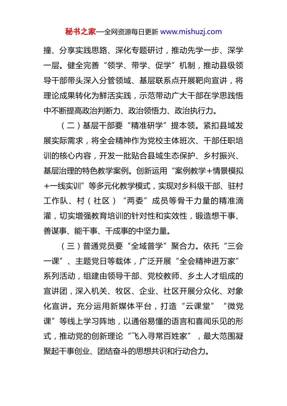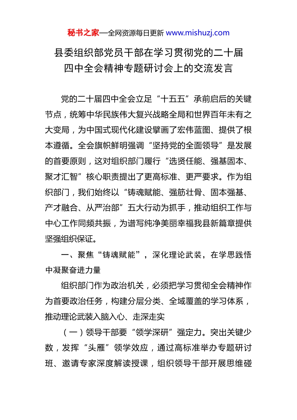 秘书之家—全网资源每日更新 www.mishuzj.com县委组织部党员干部在学习贯彻党的二十届四中全会精神专题研讨会上的交流发言 党的二十届四中全会立足“十五五”承前启后的关键节点,统筹中华民族伟大复兴战略全局和世界百年未有之大变局,为中国式现代化建设擘画了宏伟蓝图、提供了根本遵循。全会旗帜鲜明强调“坚持党的全面领导”是发展的首要原则,这对组织部门履行“选贤任能、强基固本、聚才汇智”核心职责提出了更高标准、更严要求。作为组织部门,我们始终以“铸魂赋能、强筋壮骨、固本强基、产才融合、从严治部”五大行动为抓手,推动组织工作与中心工作同频共振,为谱写纯净美丽幸福我县新篇章提供坚强组织保证。一、聚焦“铸魂赋能”,深化理论武装,在学思践悟中凝聚奋进力量组织部门作为政治机关,必须把学习贯彻全会精神作为首要政治任务,构建分层分类、全域覆盖的学习体系,推动理论武装入脑入心、走深走实(一)领导干部要“领学深研”强定力。突出关键少数,发挥“头雁”领学效应,通过高标准举办专题研讨班、邀请专家深度解读授课,组织领导干部开展思维碰秘书之家—全网资源每日更新 www.mishuzj.com撞、分享实践思路、深化专题研讨,推动先学一步、深学一层。健全完善“领学、带学、促学”机制,推动县级领导干部带头深入分管领域、基层联系点开展靶向宣讲,将理论成果转化为鲜活实践,示范带动广大干部在学思践悟中不断提高政治判断力、政治领悟力、政治执行力。(二)基层干部要“精准研学”提本领。紧扣县域发展实际需求,将全会精神作为党校主体班次、干部任职培训的核心内容,开发一批贴合县域生态保护、乡村振兴、基层治理的特色教学案例。创新运用“案例教学+情景模拟+一线实训”等多元化教学模式,实现对乡科级干部、驻村工作队、村(社区)“两委”成员等骨干力量的精准滴灌,切实增强教育培训的针对性和实效性,锻造想干事、善谋事、能干事、干成事的中坚力量。(三)普通党员要“全域普学”聚合力。依托“三会一课”、主题党日等载体,广泛开展“全会精神进万家”系列活动,组建由领导干部、党校教师、乡土人才组成的宣讲团,深入机关、牧区、企业、社区开展分众化、对象化宣讲。充分运用新媒体平台,打造“云课堂”“微党课”等线上学习阵地,以通俗易懂的语言和喜闻乐见的形式,推动党的创新理论“飞入寻常百姓家”,最大范围凝聚起干事创业、团结奋斗的思想共识和行动合力。秘书之家—全网资源每日更新 www.mishuzj.com二、聚焦“强筋壮骨”,锻造过硬队伍,在知重负重中彰显担当作为全会对建设一支政治过硬、适应新时代要求、具备领导现代化建设能力的干部队伍提出了明确要求,我们将坚决扛起选贤任能的政治责任,紧扣“十五五”发展需要,健全“选育管用”全链条机制,着力锻造可堪重任的骨干力量(一)树牢实干实绩导向,精准科学“选”。坚持把政治标准放在首位,全面落实新时代好干部标准,紧紧围绕县域发展蓝图,把乡村振兴、生态环保、改革攻坚等重点一线作为考察识别干部的“第一考场”,注重考察干部在关键时刻、重大任务中的政治担当、履职能力和工作实效,真正把那些谋划发展有思路、破解难题有办法、一心为民有情怀的干部甄选出来,做到以事择人、人岗相适,从源头上保证干部队伍质量。(二)强化实践一线锤炼,系统施策“育”。推行“一线历练”机制,实施年轻干部“蹲苗计划”,选派优秀年轻干部到项目建设主战场、乡村振兴第一线、急难险重任务前沿经风雨、见世面,在打硬仗、扛重活、解难题中练就铁肩膀、硬脊梁。完善“导师帮带”制度,发挥经验丰富领导干部的传帮带作用,通过“擂台比武”、案例秘书之家—全网资源每日更新 www.mishuzj.com复盘等方式,全面提升干部驾驭复杂局面和推动高质量发展的实战能力。(三)坚持严管厚爱结合,宽严相济“管”。严格落实《乡镇干部职工“八小时以外”监督管理规定》,明确禁止性行为清单,建立“组织监督+群众监督+家庭监督”联动机制,引导干部净化社交圈、生活圈、朋友圈。严格执行《党政领导干部离任交接管理办法》,建立“一表明责、两人共签、三家共督、四方归存”闭环机制,杜...