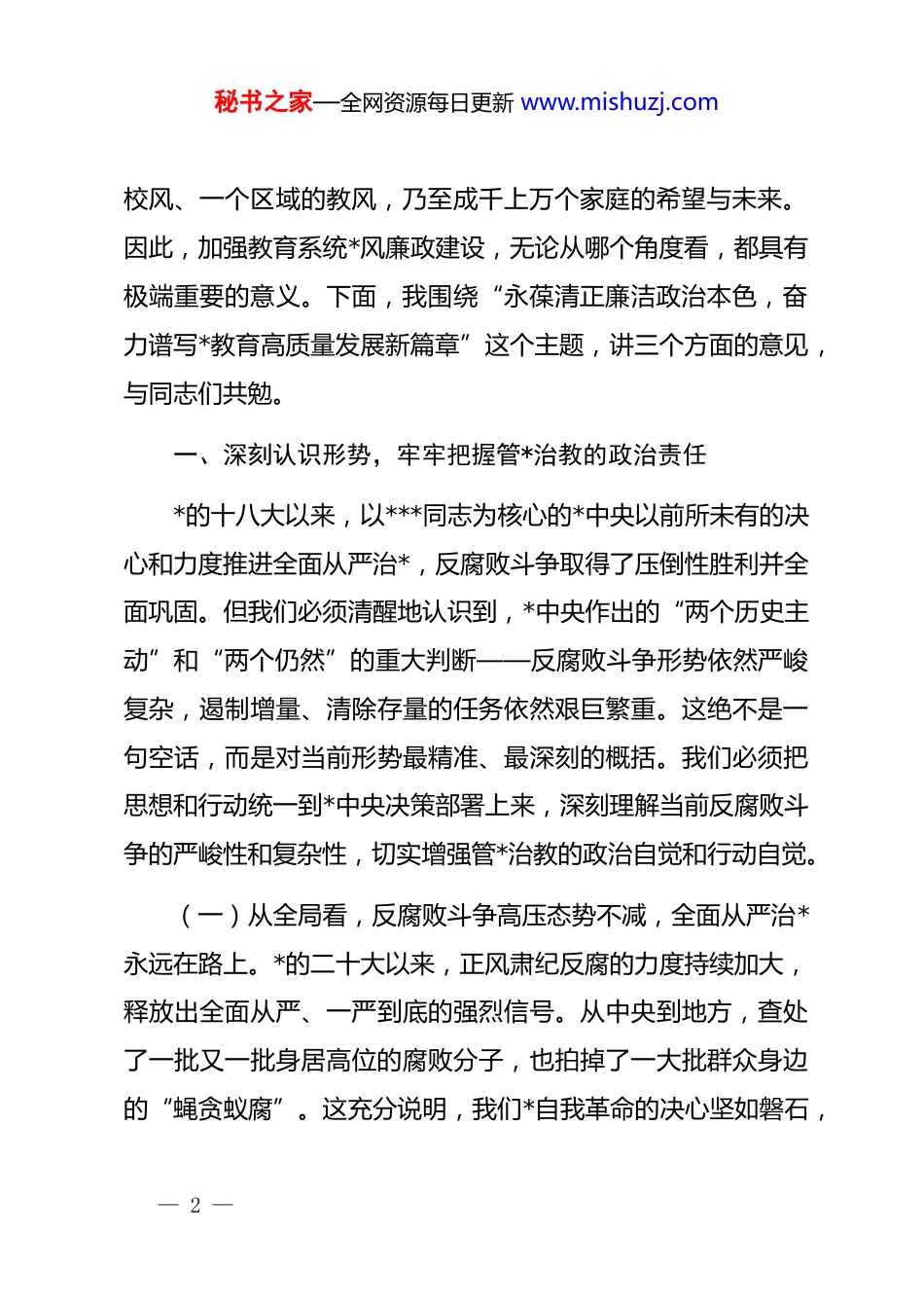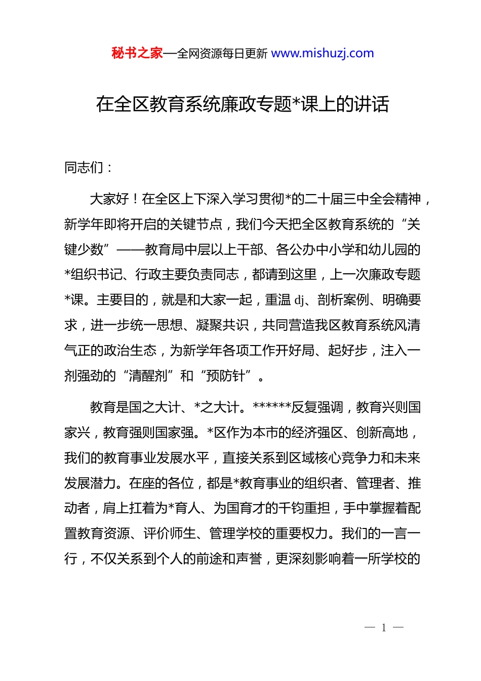 秘书之家—全网资源每日更新 www.mishuzj.com在全区教育系统廉政专题*课上的讲话同志们:大家好!在全区上下深入学习贯彻*的二十届三中全会精神,新学年即将开启的关键节点,我们今天把全区教育系统的“关键少数”——教育局中层以上干部、各公办中小学和幼儿园的*组织书记、行政主要负责同志,都请到这里,上一次廉政专题*课。主要目的,就是和大家一起,重温 dj、剖析案例、明确要求,进一步统一思想、凝聚共识,共同营造我区教育系统风清气正的政治生态,为新学年各项工作开好局、起好步,注入一剂强劲的“清醒剂”和“预防针”。教育是国之大计、*之大计。******反复强调,教育兴则国家兴,教育强则国家强。*区作为本市的经济强区、创新高地,我们的教育事业发展水平,直接关系到区域核心竞争力和未来发展潜力。在座的各位,都是*教育事业的组织者、管理者、推动者,肩上扛着为*育人、为国育才的千钧重担,手中掌握着配置教育资源、评价师生、管理学校的重要权力。我们的一言一行,不仅关系到个人的前途和声誉,更深刻影响着一所学校的— 1 —秘书之家—全网资源每日更新 www.mishuzj.com校风、一个区域的教风,乃至成千上万个家庭的希望与未来。因此,加强教育系统*风廉政建设,无论从哪个角度看,都具有极端重要的意义。下面,我围绕“永葆清正廉洁政治本色,奋力谱写*教育高质量发展新篇章”这个主题,讲三个方面的意见,与同志们共勉。一、深刻认识形势,牢牢把握管*治教的政治责任*的十八大以来,以***同志为核心的*中央以前所未有的决心和力度推进全面从严治*,反腐败斗争取得了压倒性胜利并全面巩固。但我们必须清醒地认识到,*中央作出的“两个历史主动”和“两个仍然”的重大判断——反腐败斗争形势依然严峻复杂,遏制增量、清除存量的任务依然艰巨繁重。这绝不是一句空话,而是对当前形势最精准、最深刻的概括。我们必须把思想和行动统一到*中央决策部署上来,深刻理解当前反腐败斗争的严峻性和复杂性,切实增强管*治教的政治自觉和行动自觉。(一)从全局看,反腐败斗争高压态势不减,全面从严治*永远在路上。*的二十大以来,正风肃纪反腐的力度持续加大,释放出全面从严、一严到底的强烈信号。从中央到地方,查处了一批又一批身居高位的腐败分子,也拍掉了一大批群众身边的“蝇贪蚁腐”。这充分说明,我们*自我革命的决心坚如磐石,— 2 —秘书之家—全网资源每日更新 www.mishuzj.com反腐败绝对没有“歇歇脚、松口气”的可能。在这样的大背景下,任何行业、任何领域都不存在所谓的“特殊地带”和“法外之地”,教育系统更不是一方净土。认为教育领域都是清水衙门、都是知识分子,不会出大问题的想法,是极其天真和危险的。恰恰相反,正因为教育承载着人民群众最直接、最现实的期盼,教育领域的任何一点风吹草动,任何一起腐败案件,都更容易引发社会舆论的高度关注,其负面影响甚至会被成倍放大,严重损害*和政府的形象。(二)从我区看,教育系统廉政风险不容忽视,正风肃纪任务依然繁重。近年来,区委、区政府始终坚持教育优先发展战略,持续加大投入,我们区的教育硬件设施、师资力量、教学质量都走在了全市前列,这是我们引以为傲的成绩。但成绩背后,我们更要看到隐忧和风险。根据区纪委监委的统计数据,从 2022 年到 2024 年这三年间,我们共收到涉及教育系统的信访举报和问题线索 128 件,经初核立案 35 件,给予 dj 政务处分42 人,移送司法机关 5 人,涉及违纪违法资金高达 1100 余万元。这些数据触目惊心,每一个数字背后都是一次*性的沉沦、一个家庭的悲剧、一笔教育资源的流失。从案件分析来看,我区教育系统违纪违法问题主要呈现出几个特点:一是问题多发于重— 3 —秘书之家—全网资源每日更新 www.mishuzj.com点领域和关键环节。案件主要集中在工程建设、设备采购、食堂管理、招生录取、职称评定、课后服务等权力集中、资金密集、资源富集的领域。这些领域往往制度不健全、监督不到位,容易成为腐败的“温床”。二是“关键少数”违纪违法问题突出。在被查处的 42 人中,担任学校*政“一把手”或中层正职的就有 28 ...