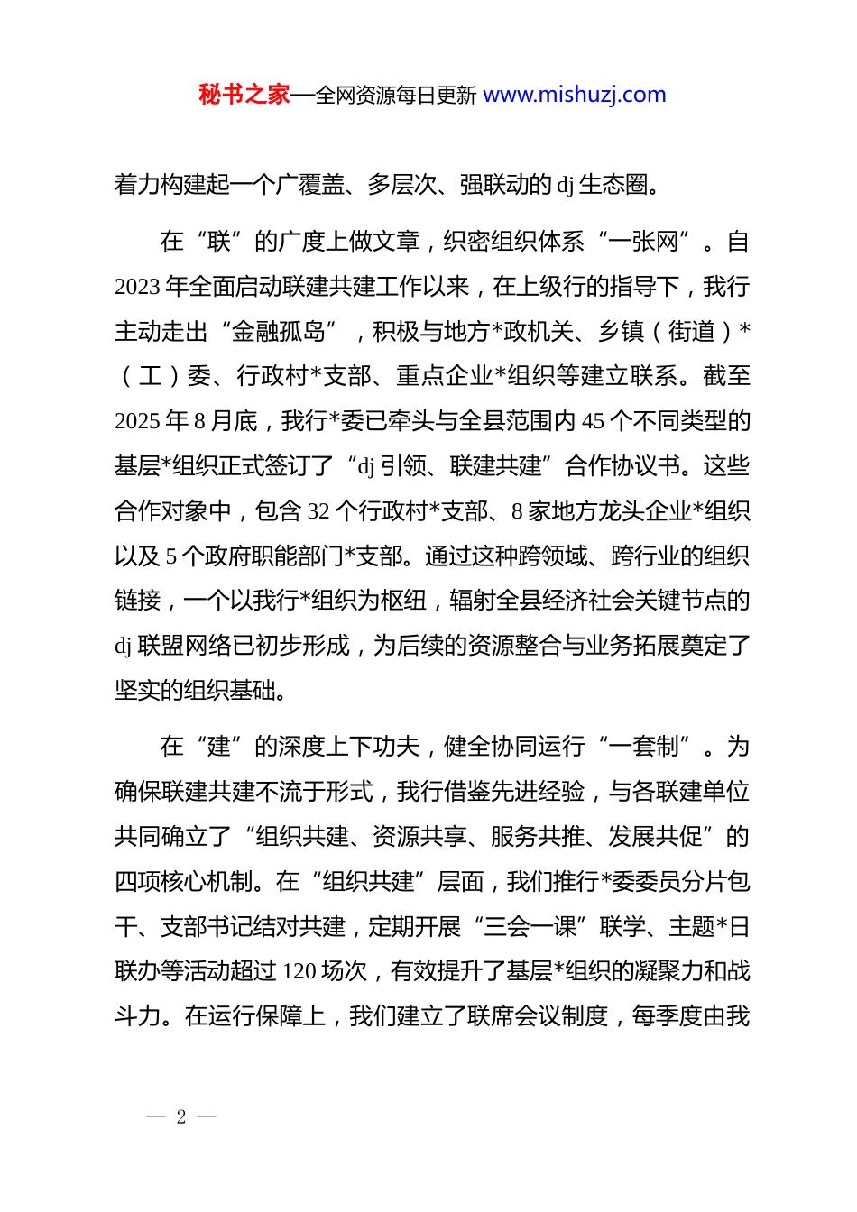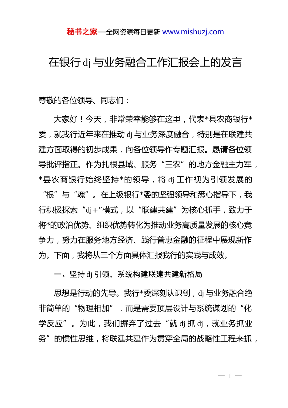 秘书之家—全网资源每日更新 www.mishuzj.com在银行 dj 与业务融合工作汇报会上的发言尊敬的各位领导、同志们:大家好!今天,非常荣幸能够在这里,代表*县农商银行*委,就我行近年来在推动 dj 与业务深度融合,特别是在联建共建方面取得的初步成果,向各位领导作专题汇报。恳请各位领导批评指正。作为扎根县域、服务“三农”的地方金融主力军,*县农商银行始终坚持*的领导,将 dj 工作视为引领发展的“根”与“魂”。在上级银行*委的坚强领导和悉心指导下,我行积极探索“dj+”模式,以“联建共建”为核心抓手,致力于将*的政治优势、组织优势转化为推动业务高质量发展的核心竞争力,努力在服务地方经济、践行普惠金融的征程中展现新作为。下面,我将从三个方面具体汇报我行的实践与成效。一、坚持 dj 引领,系统构建联建共建新格局思想是行动的先导。我行*委深刻认识到,dj 与业务融合绝非简单的“物理相加”,而是需要顶层设计与系统谋划的“化学反应”。为此,我们摒弃了过去“就 dj 抓 dj,就业务抓业务”的惯性思维,将联建共建作为贯穿全局的战略性工程来抓,— 1 —秘书之家—全网资源每日更新 www.mishuzj.com着力构建起一个广覆盖、多层次、强联动的 dj 生态圈。在“联”的广度上做文章,织密组织体系“一张网”。自2023 年全面启动联建共建工作以来,在上级行的指导下,我行主动走出“金融孤岛”,积极与地方*政机关、乡镇(街道)*(工)委、行政村*支部、重点企业*组织等建立联系。截至2025 年 8 月底,我行*委已牵头与全县范围内 45 个不同类型的基层*组织正式签订了“dj 引领、联建共建”合作协议书。这些合作对象中,包含 32 个行政村*支部、8 家地方龙头企业*组织以及 5 个政府职能部门*支部。通过这种跨领域、跨行业的组织链接,一个以我行*组织为枢纽,辐射全县经济社会关键节点的dj 联盟网络已初步形成,为后续的资源整合与业务拓展奠定了坚实的组织基础。在“建”的深度上下功夫,健全协同运行“一套制”。为确保联建共建不流于形式,我行借鉴先进经验,与各联建单位共同确立了“组织共建、资源共享、服务共推、发展共促”的四项核心机制。在“组织共建”层面,我们推行*委委员分片包干、支部书记结对共建,定期开展“三会一课”联学、主题*日联办等活动超过 120 场次,有效提升了基层*组织的凝聚力和战斗力。在运行保障上,我们建立了联席会议制度,每季度由我— 2 —秘书之家—全网资源每日更新 www.mishuzj.com行*委书记或副书记主持召开一次联建共建工作推进会,复盘进展、协调问题,确保合作事项能够“件件有落实、事事有回音”,真正将 dj 工作的“软实力”转化为推动发展的“硬支撑”。二、聚焦资源共享,持续激活协同发展新动能如果说组织联建是“骨架”,那么资源共享就是“血肉”是激活联建共建生命力的关键所在。我行坚持问题导向和需求导向,通过建立“三张清单”推动金融资源与地方发展要素的精准对接和高效流转,努力实现从“红色握手”到“携手共富”的价值跃升。一是注入金融“活水”,强化资金资源共享。针对联建村集体经济薄弱、联建企业融资难等痛点,我行设立了总额度高达 10 亿元的“联建共富”专项信贷资金池。对纳入联建共建体系的村集体项目和企业,开辟绿色审批通道,并给予平均下浮50 个基点的利率优惠。两年来,累计为 32 个联建村的特色种养殖、乡村旅游、农产品加工等项目提供贷款支持 4.8 亿元;为 8家联建企业的技术改造和扩大再生产发放贷款 6.2 亿元,有效降低了实体经济的融资成本,激发了市场主体的内生动力。— 3 —秘书之家—全网资源每日更新 www.mishuzj.com二是派遣“金融专员”,推动人力资源共享。为将金融服务精准滴灌至“最后一公里”,我行从*员业务骨干中择优选派了 50 名“乡村振兴金融特派员”,一对一派驻到联建村和重点企业。他们不仅是金融政策的“宣传员”、信贷业务的“办理员”,更是产业发展的“信息员”和风险防控的“监督员”。据不完全统计,这支队伍累计走访农户及小微企业超过 15000户次,收集有效金融需求近 3000 条,协助解决各类融...