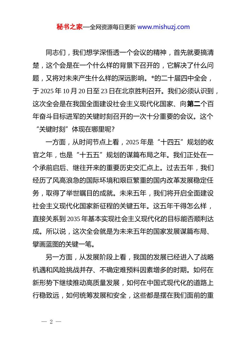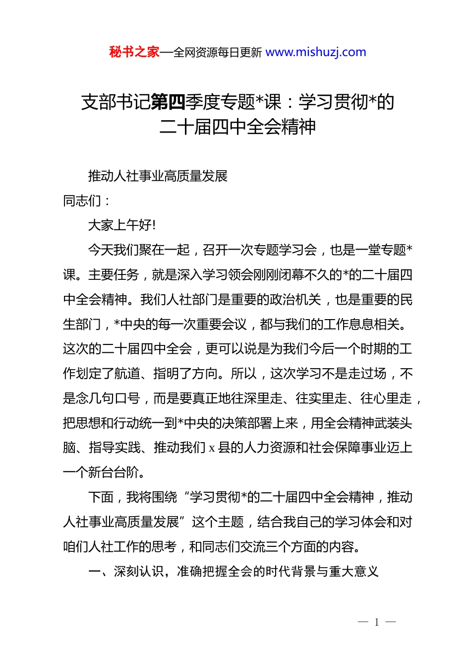 秘书之家—全网资源每日更新 www.mishuzj.com支部书记第四季度专题*课:学习贯彻*的二十届四中全会精神推动人社事业高质量发展同志们:大家上午好!今天我们聚在一起,召开一次专题学习会,也是一堂专题*课。主要任务,就是深入学习领会刚刚闭幕不久的*的二十届四中全会精神。我们人社部门是重要的政治机关,也是重要的民生部门,*中央的每一次重要会议,都与我们的工作息息相关。这次的二十届四中全会,更可以说是为我们今后一个时期的工作划定了航道、指明了方向。所以,这次学习不是走过场,不是念几句口号,而是要真正地往深里走、往实里走、往心里走,把思想和行动统一到*中央的决策部署上来,用全会精神武装头脑、指导实践、推动我们 x 县的人力资源和社会保障事业迈上一个新台台阶。下面,我将围绕“学习贯彻*的二十届四中全会精神,推动人社事业高质量发展”这个主题,结合我自己的学习体会和对咱们人社工作的思考,和同志们交流三个方面的内容。一、深刻认识,准确把握全会的时代背景与重大意义— 1 —秘书之家—全网资源每日更新 www.mishuzj.com同志们,我们想学深悟透一个会议的精神,首先就要搞清楚,这个会是在一个什么样的背景下召开的,它解决了什么问题,又将对未来产生什么样的深远影响。*的二十届四中全会,于 2025 年 10 月 20 日至 23 日在北京胜利召开。我们必须认识到,这次全会是在我国全面建设社会主义现代化国家、向第二个百年奋斗目标进军的关键时刻召开的一次十分重要的会议。这个“关键时刻”体现在哪里呢?一方面,从时间节点上看,2025 年是“十四五”规划的收官之年,也是“十五五”规划的谋篇布局之年。我们正处在一个承前启后、继往开来的重要历史交汇点上。过去五年,我们经历了风高浪急的国际环境和艰巨繁重的国内改革发展稳定任务,取得了举世瞩目的成就。未来五年,我们将开启全面建设社会主义现代化国家新征程的关键五年。这五年干得怎么样,直接关系到 2035 年基本实现社会主义现代化的目标能否顺利达成。所以说,这次全会就是为未来五年的国家发展谋篇布局、擘画蓝图的关键一笔。另一方面,从发展阶段上看,我国的发展已经进入了战略机遇和风险挑战并存、不确定难预料因素增多的时期。如何在新形势下继续推动高质量发展,如何在中国式现代化的道路上行稳致远,如何统筹发展和安全,这些都是摆在我们面前的重— 2 —秘书之家—全网资源每日更新 www.mishuzj.com大课题。*中央召开二十届四中全会,正是为了回答这些时代之问、人民之问。这次全会最重要的成果,就是审议通过了《中共中央关于制定国民经济和社会发展第十五个五年规划的建议》。这份由******亲自领导制定的《建议》,全面总结了“十四五”时期的巨大成就和宝贵经验,深入分析了新发展阶段面临的新机遇新挑战,系统擘画了“十五五”时期我国经济社会发展的指导思想、基本原则、主要目标和战略任务。它不仅是指导未来五年发展的纲领性文件,更是确保我们*和国家事业沿着正确方向前进的行动指南。对于我们人社部门而言,这份《建议》的分量尤其重。因为人力资源和社会保障工作,说到底就是做人的工作,是最大的民生。就业是民生之本,社保是民生之基,人才是发展之要,和谐劳动关系是社会之稳。可以说,《建议》中关于民生福祉、社会建设、创新驱动的每一项部署,都与我们的日常工作紧密相连。因此,学习好、领会好、贯彻好二十届四中全会精神,特别是《建议》的核心要义,就是我们当前和今后一个时期最重要的政治任务。它为我们新时代的人社工作提供了根本遵循,是我们干好一切工作的前提和基础。我们必须站在政治和全局的高度,深刻认识其里程碑式的重大意义。— 3 —秘书之家—全网资源每日更新 www.mishuzj.com二、深入领会,准确把握全会对人社工作的新部署新要求同志们,学习不能停留在表面,关键要紧密联系我们的工作实际。全会精神博大精深,我们要做的,就是把中央的宏观擘画,转化为我们人社部门的具体行动。下面,我就结合《建议》中释放出的明确信号和我们人社工作的四大板块——就业创业、社会保障、人事人才、劳动关系,谈谈我的理解和思考。...